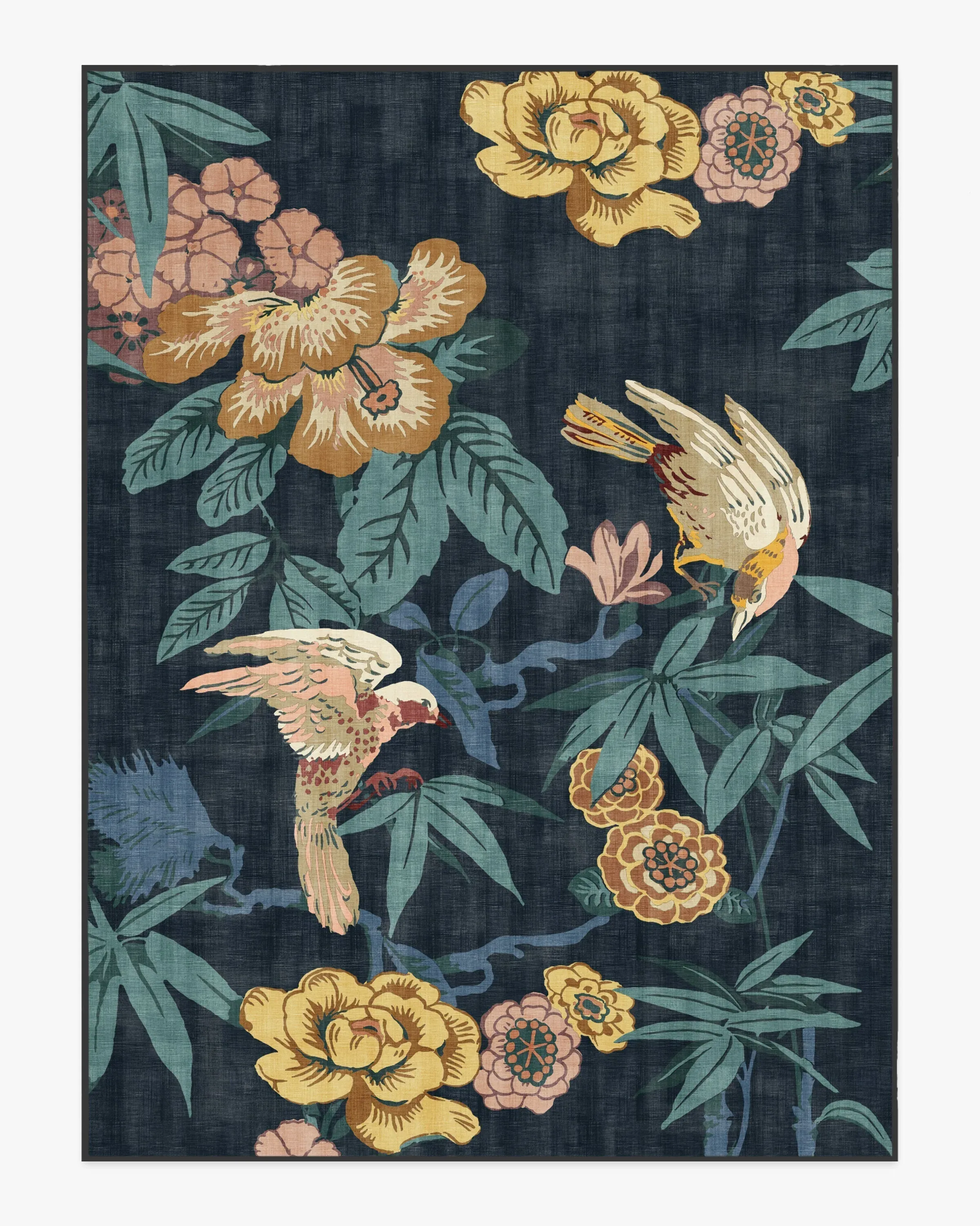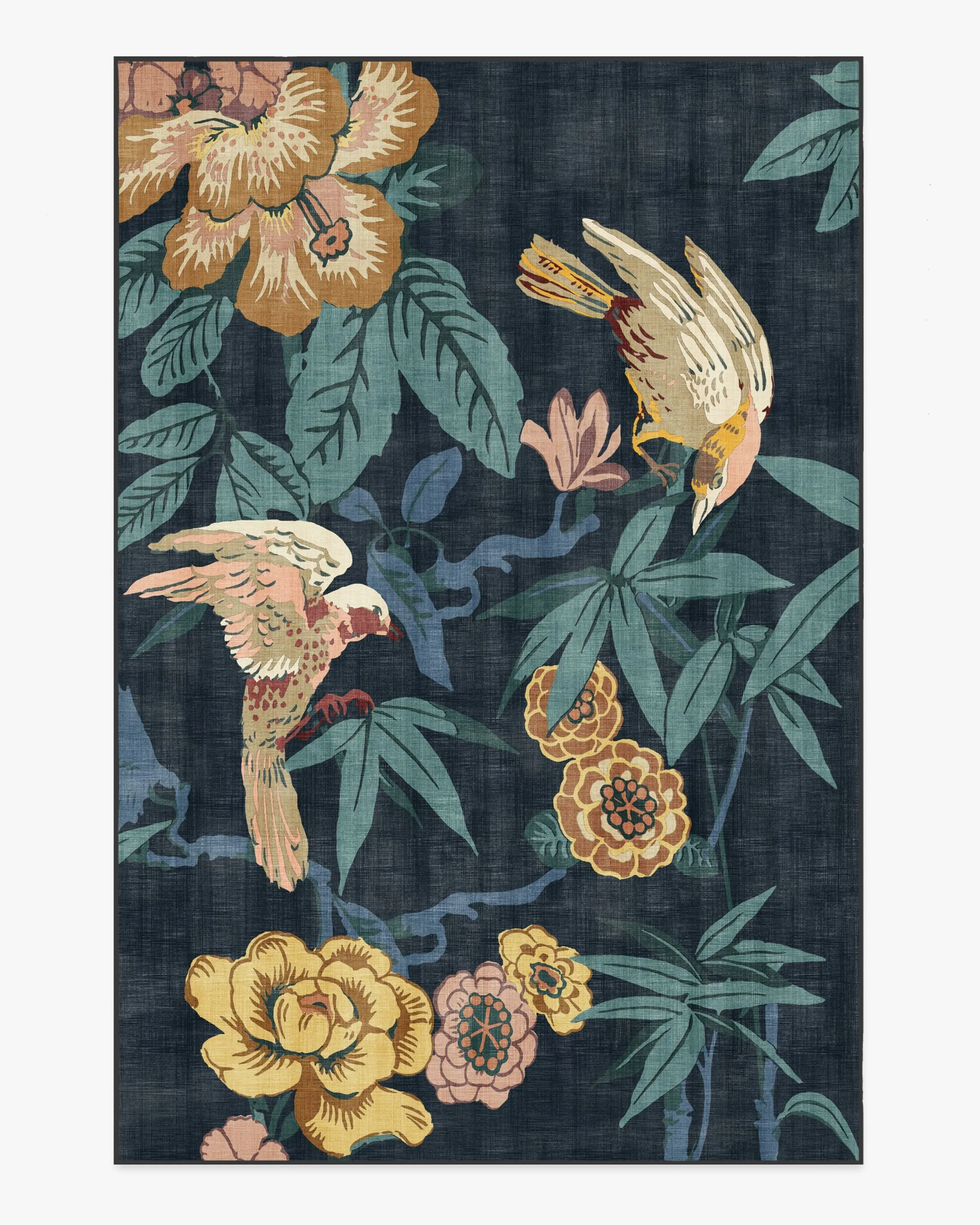 Bring home the tropics with our Sanderson Bamboo & Bird Indigo Rug. Delicate bamboo, hibiscus, hydrangea, and wisteria motifs create a twisting framework for birds to perch. Its palette blends turquoise and bright blues, yellows, ochres, oranges, pinks, corals, and beiges, with pops of light cream against a deep indigo blue background. Water-resistant, stain-resistant, and machine-washable. Rug colours may vary slightly according to your device and the lighting in your space. 60x90 | Machine Washable Area Rug | Kid & Pet Friendly | Indoor Rugs | Bamboo & Bird Indigo Flatwoven Rug by Sanderson | Ruggable