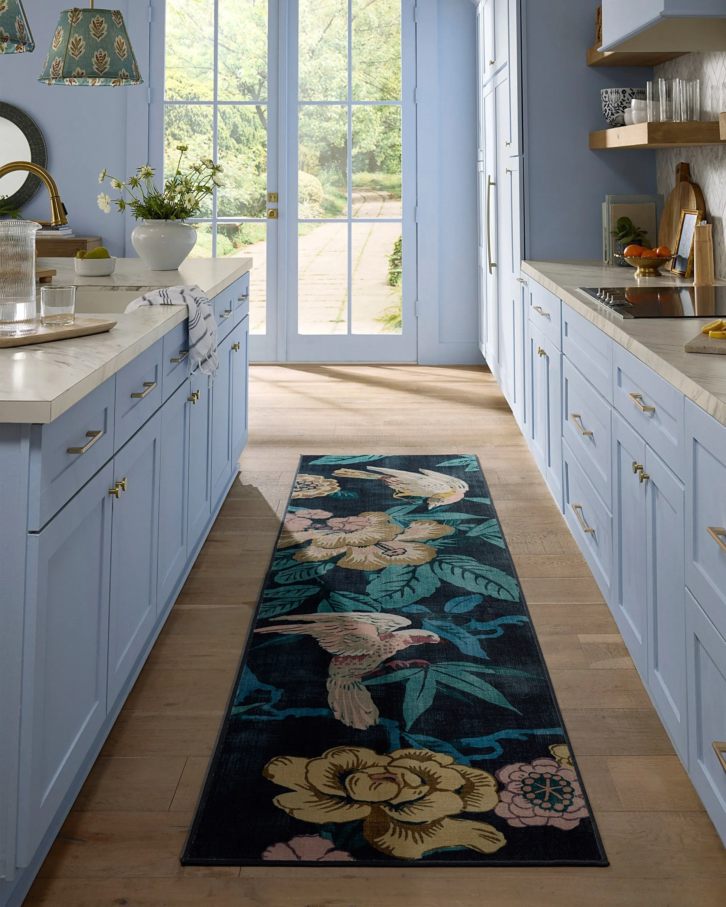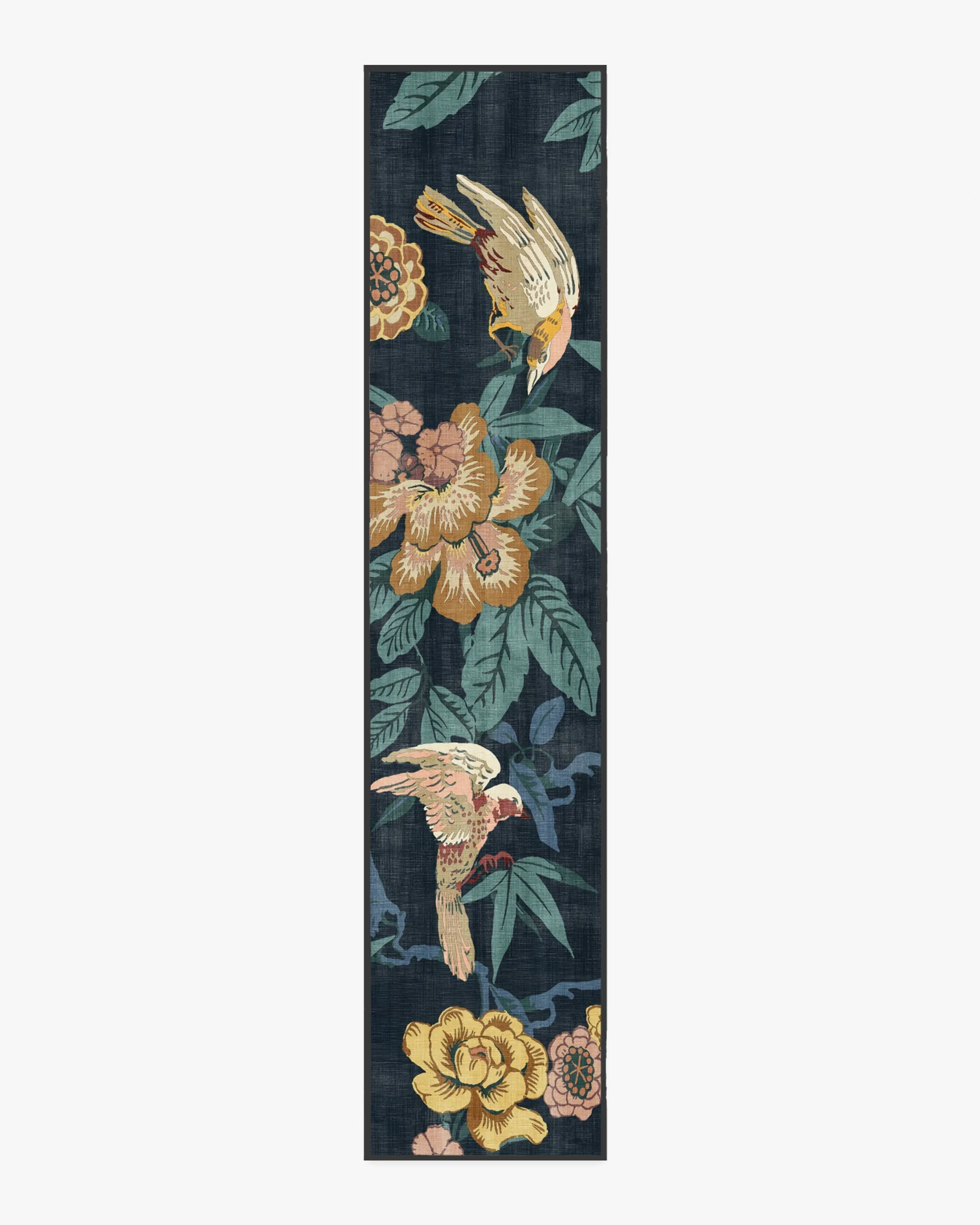 The area rug features delicate bamboo, hibiscus, hydrangea, and wisteria motifs that create a botanical framework for perched birds. Its vibrant palette blends turquoise and bright blues with yellows, ochres, oranges, pinks, and corals against a deep indigo background. The flatwoven construction provides durability, while the water-resistant and stain-resistant properties ensure easy maintenance. Machine-washable design offers convenient care for busy households. W60 x L90 cm.