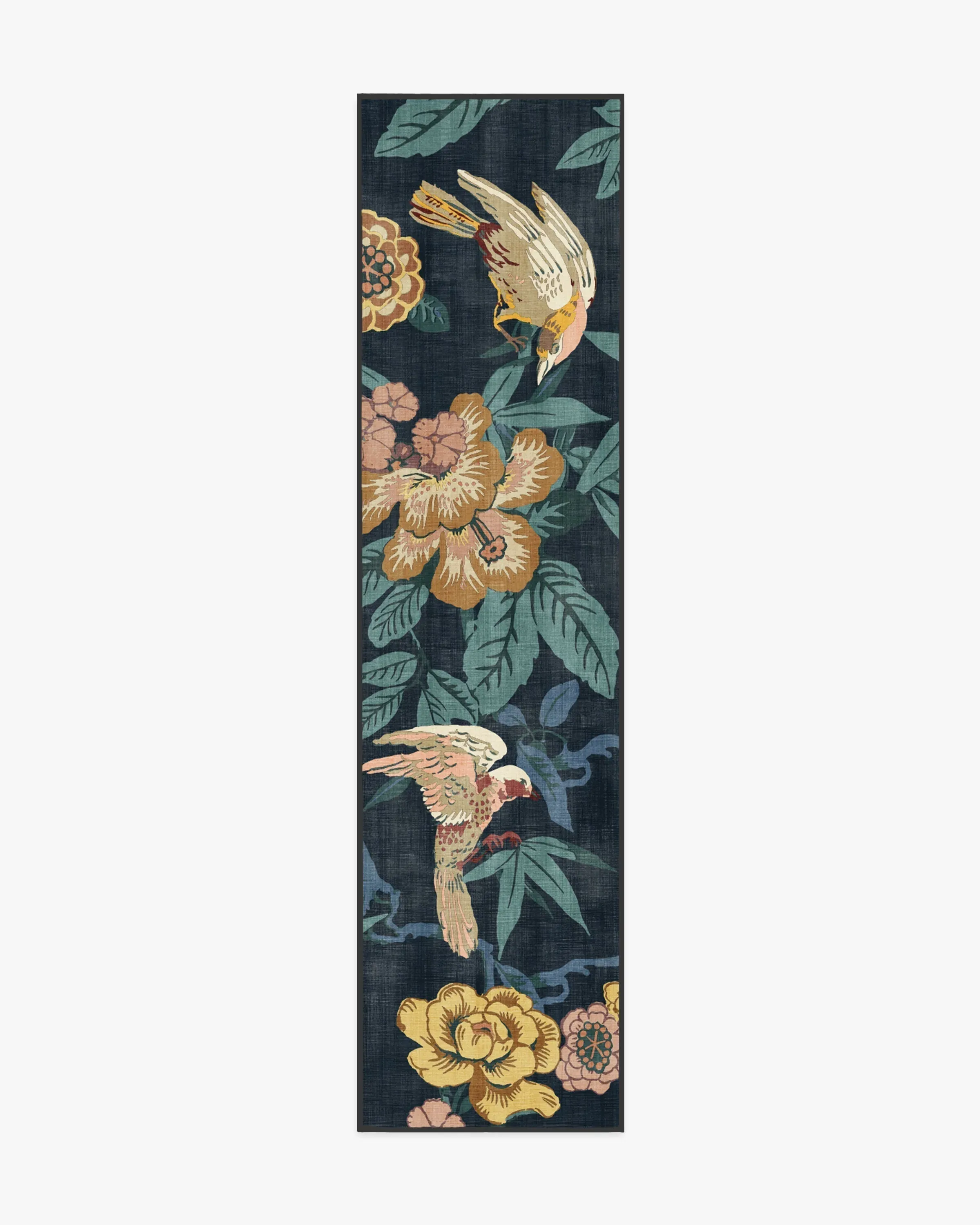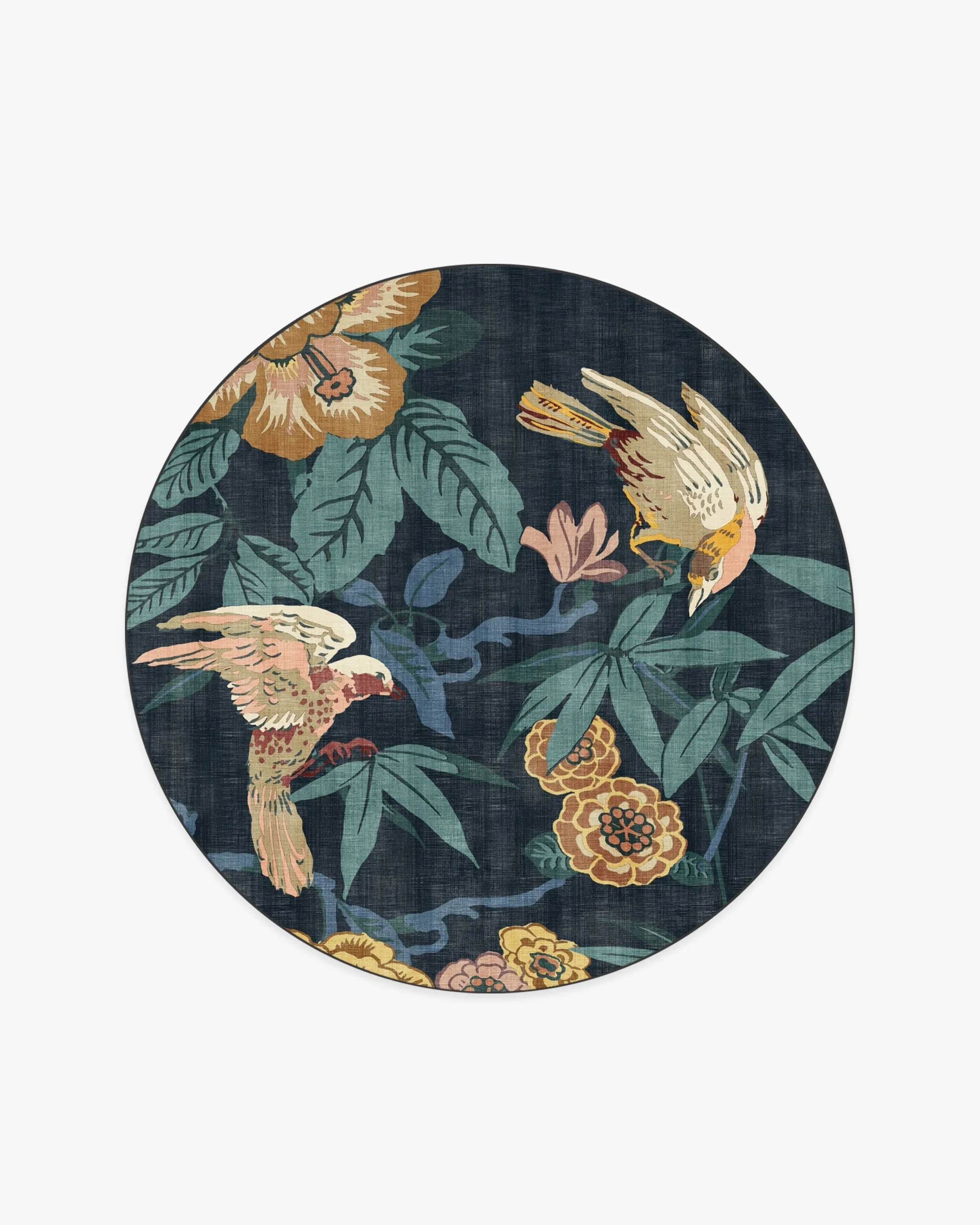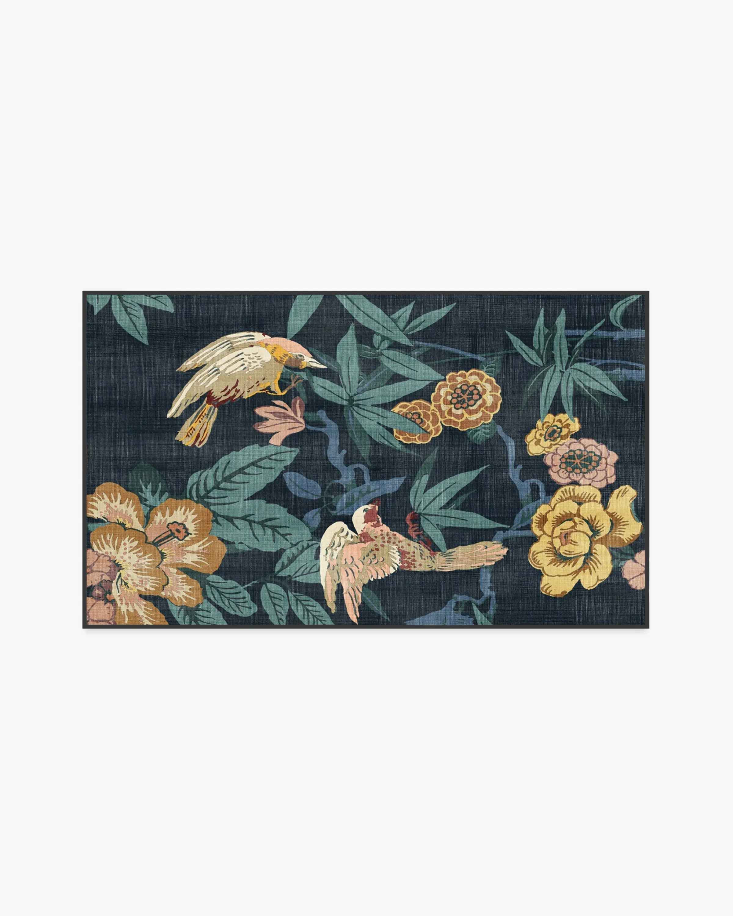 Bring home the tropics with our Sanderson Bamboo & Bird Indigo Rug. Delicate bamboo, hibiscus, hydrangea, and wisteria motifs create a twisting framework for birds to perch. Its palette blends turquoise and bright blues, yellows, ochres, oranges, pinks, corals, and beiges, with pops of light cream against a deep indigo blue background. Water-resistant, stain-resistant, and machine-washable. Rug colours may vary slightly according to your device and the lighting in your space. 60x90 | Machine Washable Area Rug | Kid & Pet Friendly | Indoor Rugs | Bamboo & Bird Indigo Rug by Sanderson | Ruggable