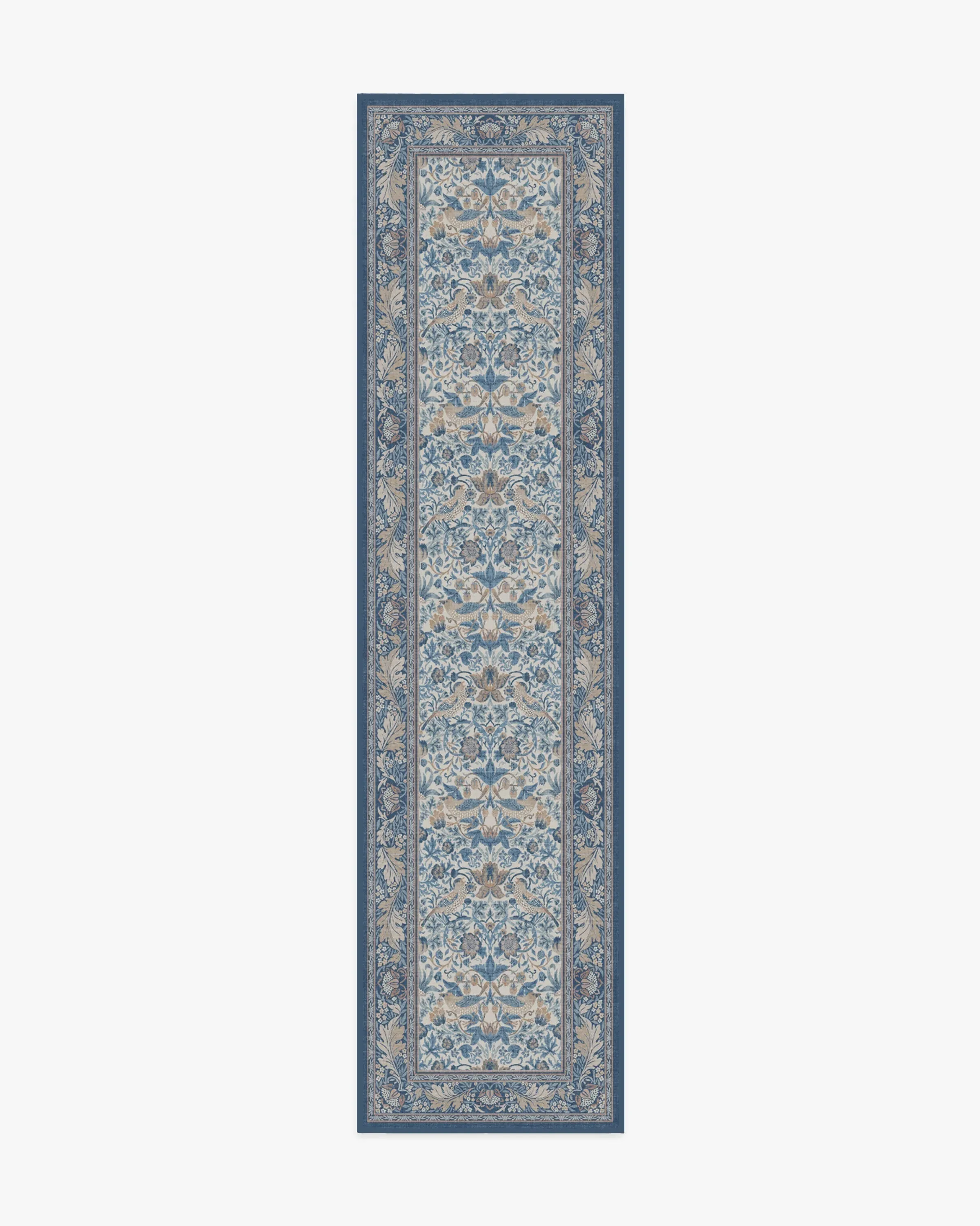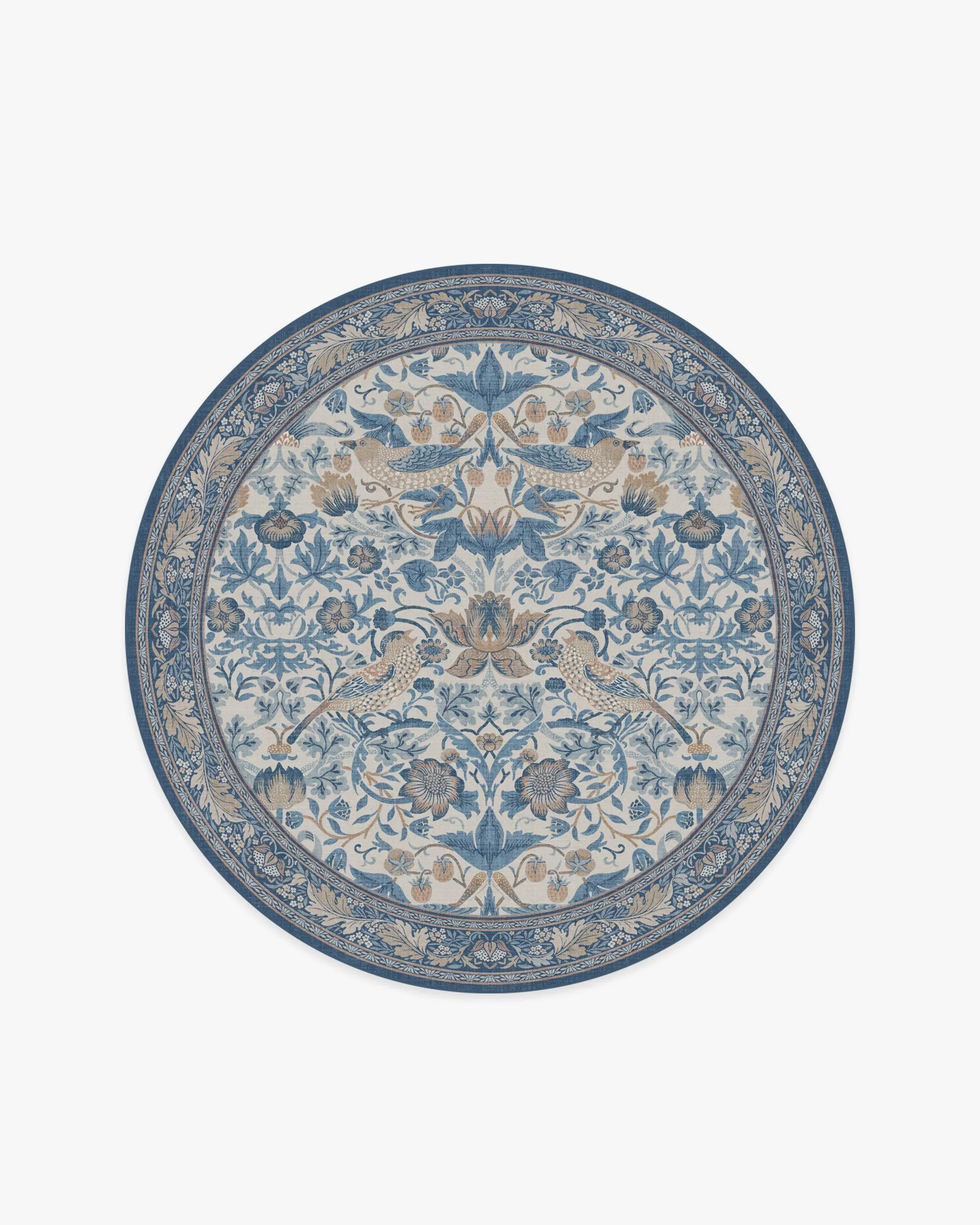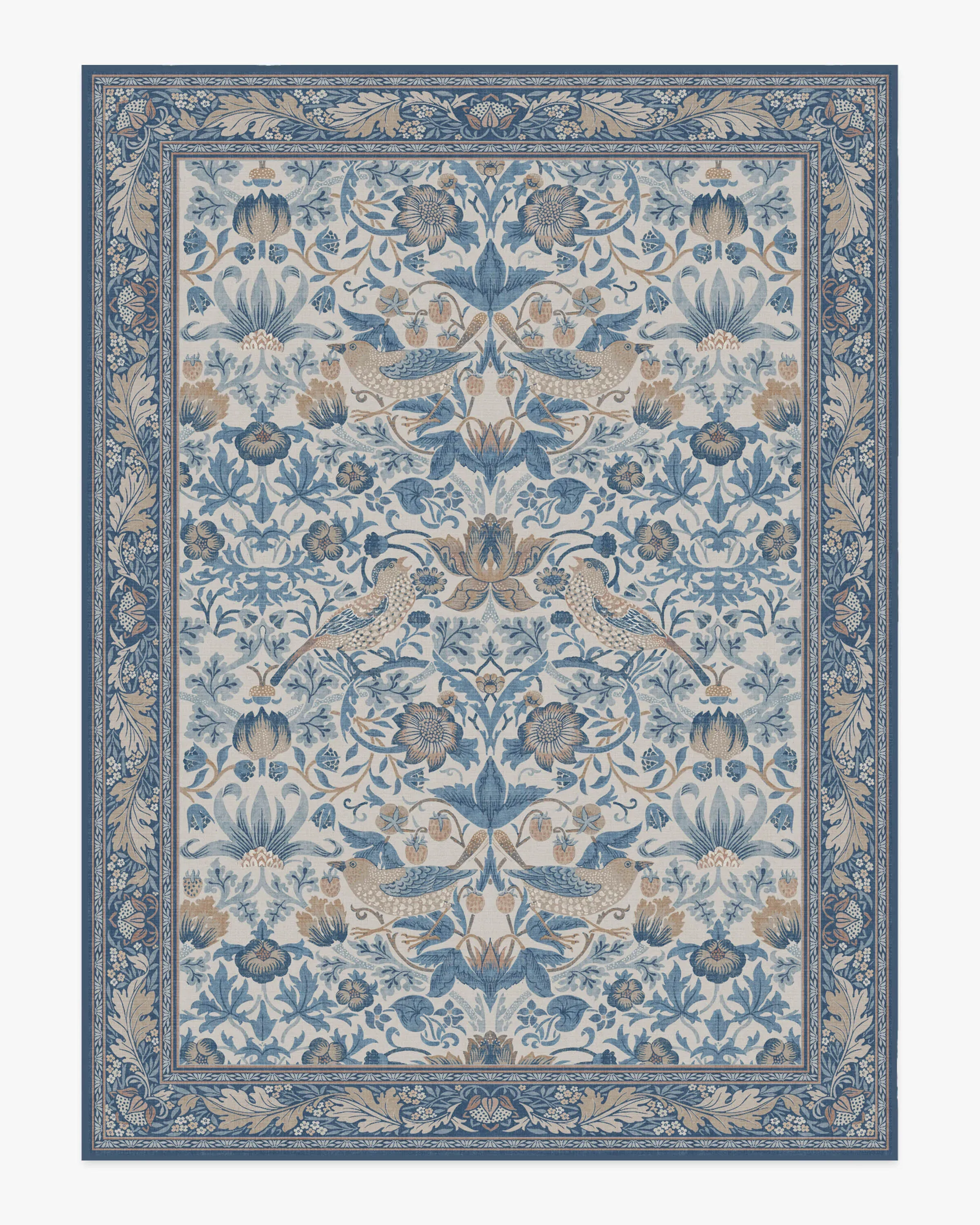 Step into Kelmscott Manor's garden with the Morris & Co. Strawberry Thief Indigo & Ivory Rug. A direct translation of William Morris's recognisable block print textile, this rug depicts Morris's thrushes stealing fruit from his kitchen garden. A classic blue and white recolour of the original design, this colourway balances warm and cool tones with indigo, delft, and dusty blues complementing taupe, ivory, and beige accents, for traditional grandeur. Water-resistant, stain-resistant, and machine-washable. Rug colours may vary slightly according to your device and the lighting in your space. 60x90 | Machine Washable Area Rug | Kid & Pet Friendly | Indoor Rugs | Strawberry Thief Indigo & Ivory Rug by Morris & Co. | Ruggable