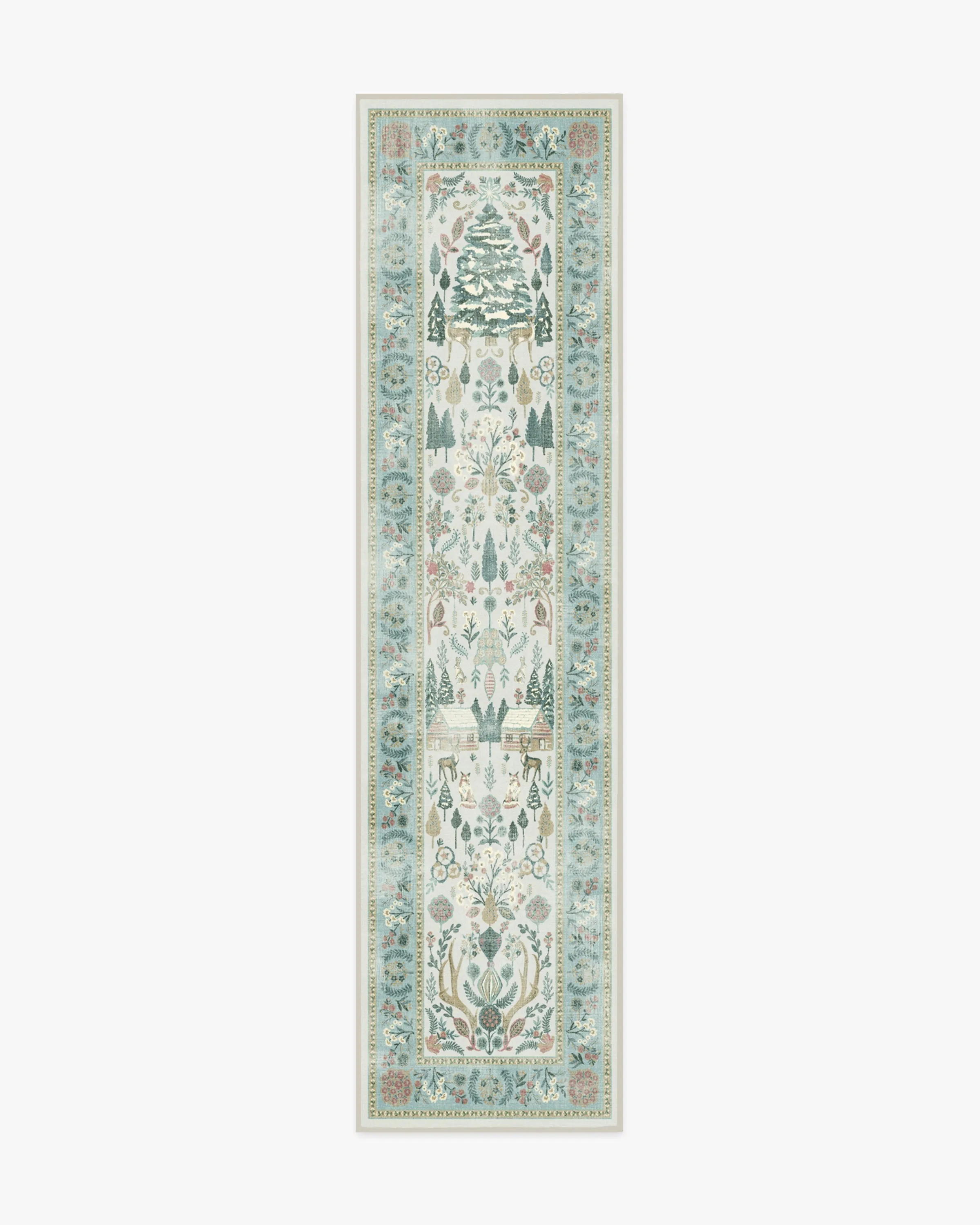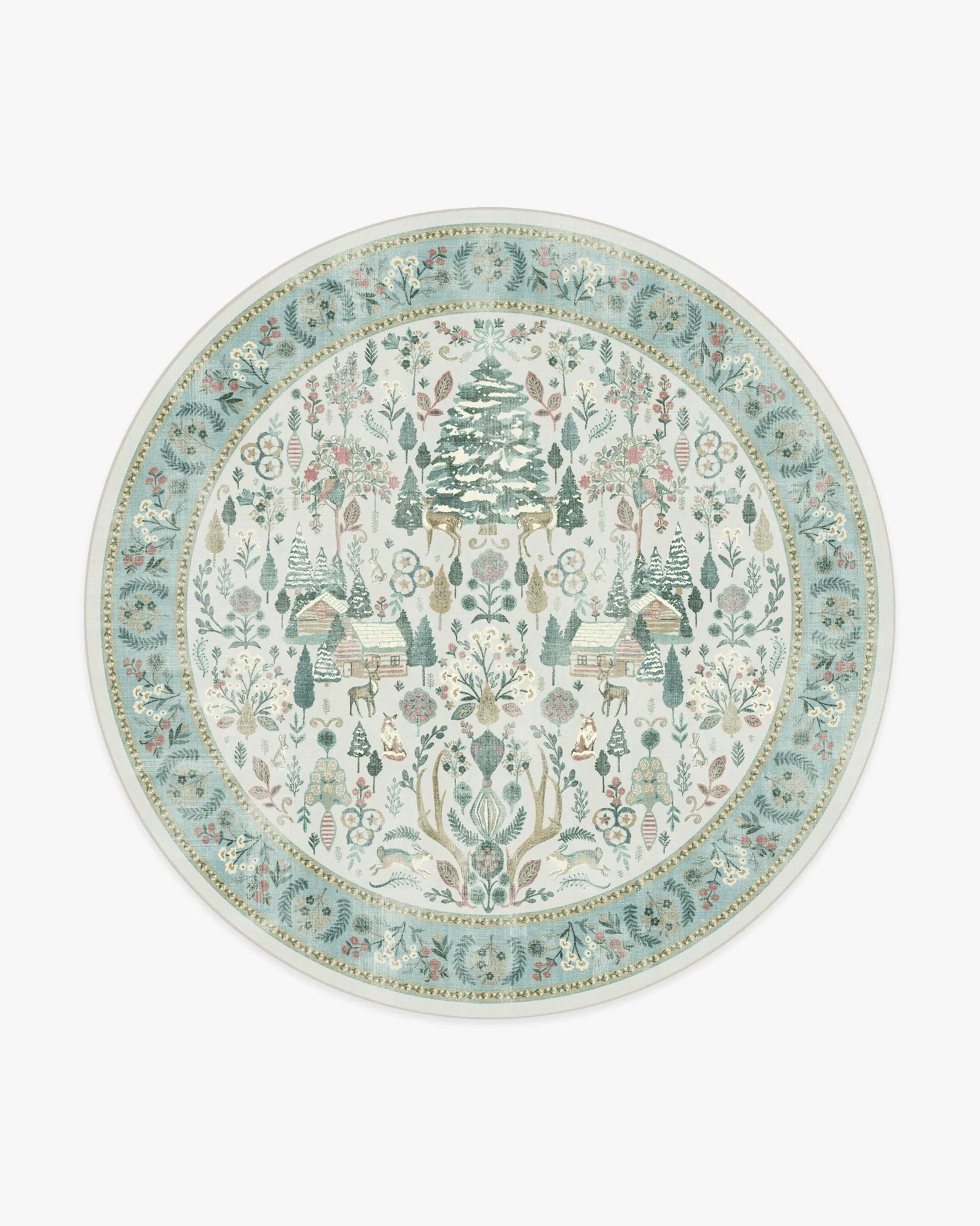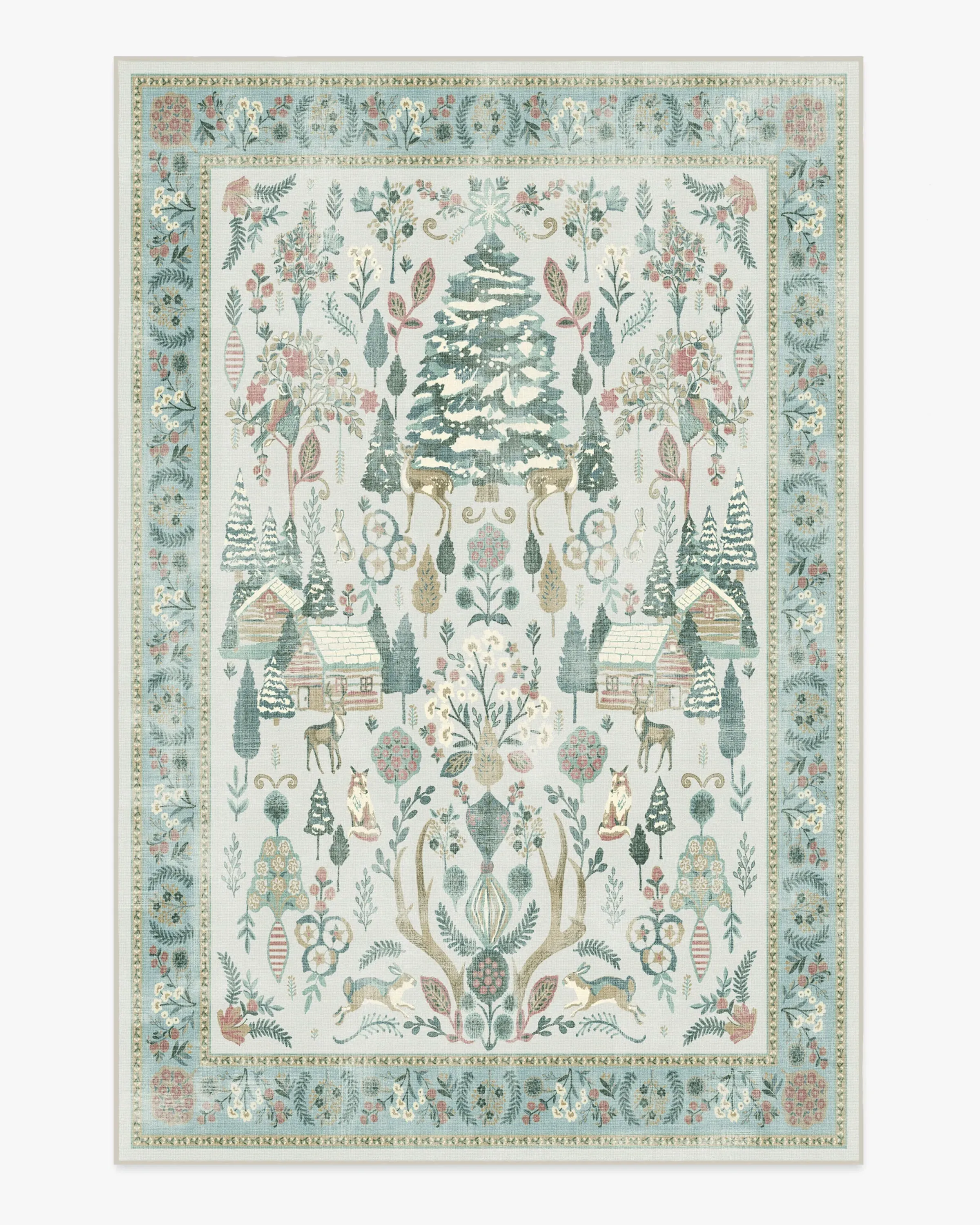 Step into a whimsical wonderland with our Juniper Pastel Multicolour Rug. This cottagecore-inspired tapestry design features a silvery grey ground and pale teal border, with soft pinks, greens, and ivory that bring retro Christmas charm to any room. Pine trees, cosy cabins, and woodland friends will give you all the festive feels. Water-resistant, stain-resistant, and machine-washable. Colours may vary by device and lighting. 60x90 | Machine Washable Area Rug | Kid & Pet Friendly | Indoor Rugs | Juniper Pastel Rug | Ruggable