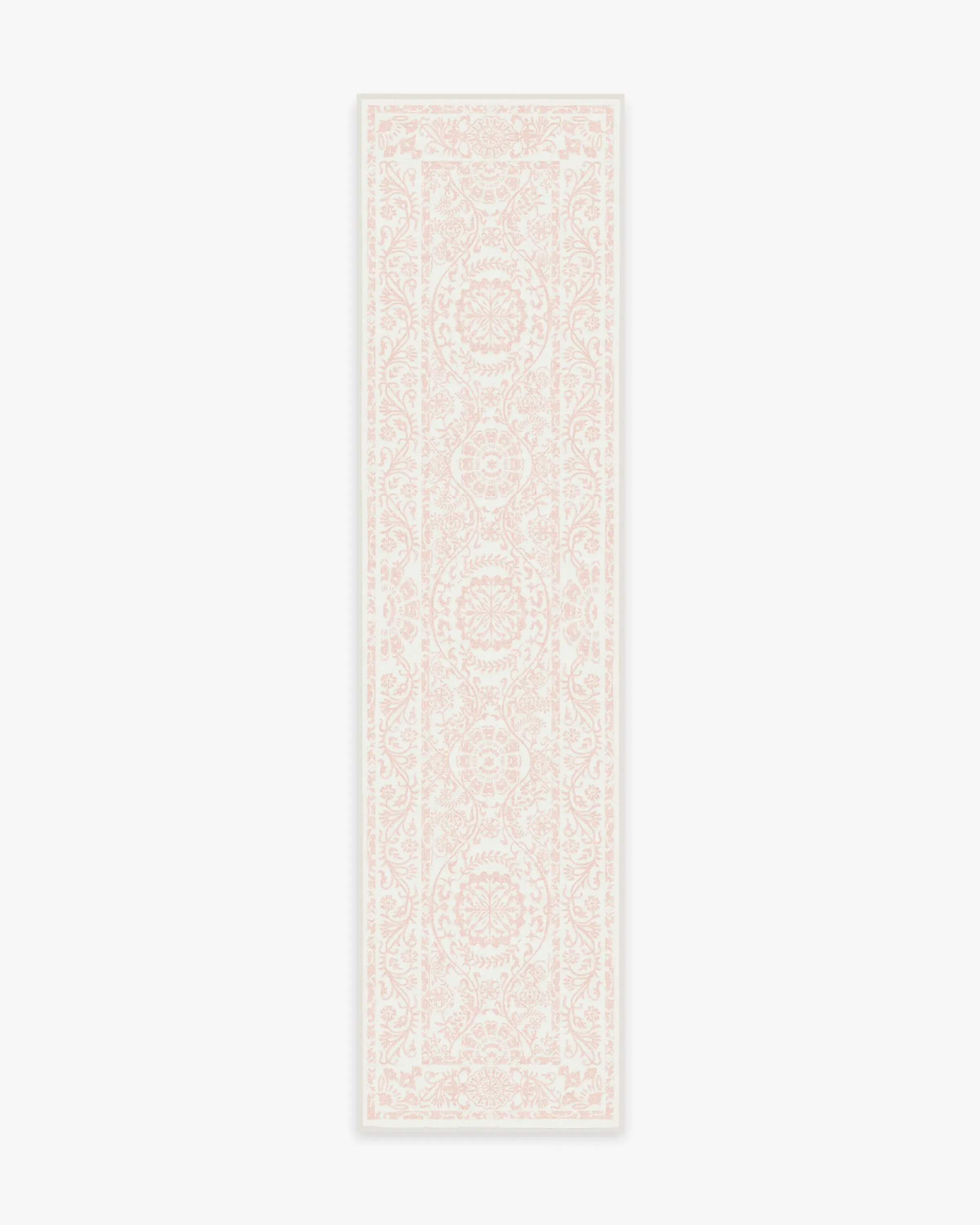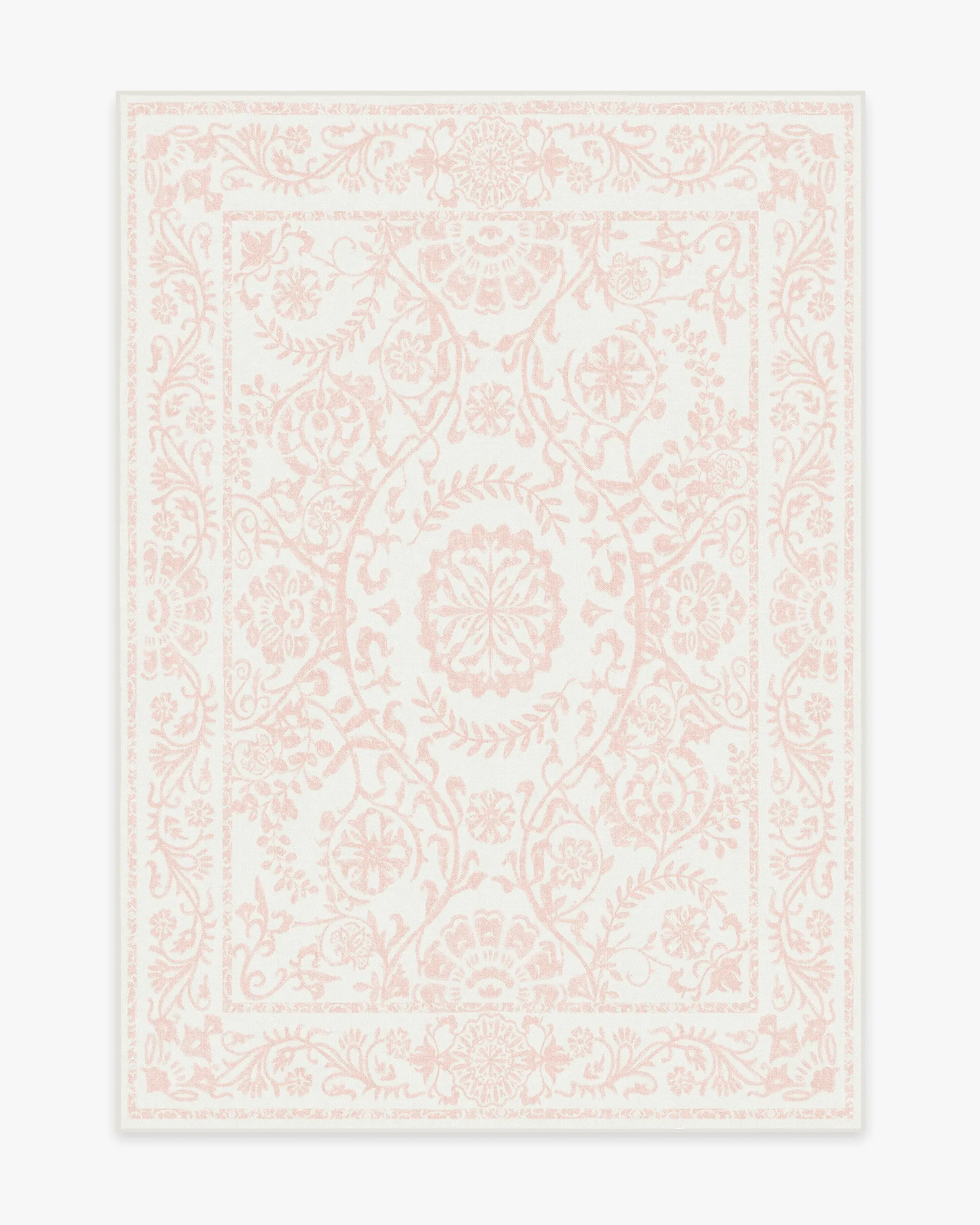 Pink power. Our Delphina Powder Pink Rug features a lovely design texture inspired by the art of woodblock printing. Highlighted by a web of ombre pink floral vines that lead to a blossoming central medallion, its two-tone colour palette harmoniously blends into a titanium white background, creating a soothing vibe for your home. Made from our water-resistant, stain-resistant, and machine-washable low-pile Chenille material. 60x90 | Machine Washable Area Rug | Kid & Pet Friendly | Indoor Rugs | Delphina Powder Pink Rug | Ruggable