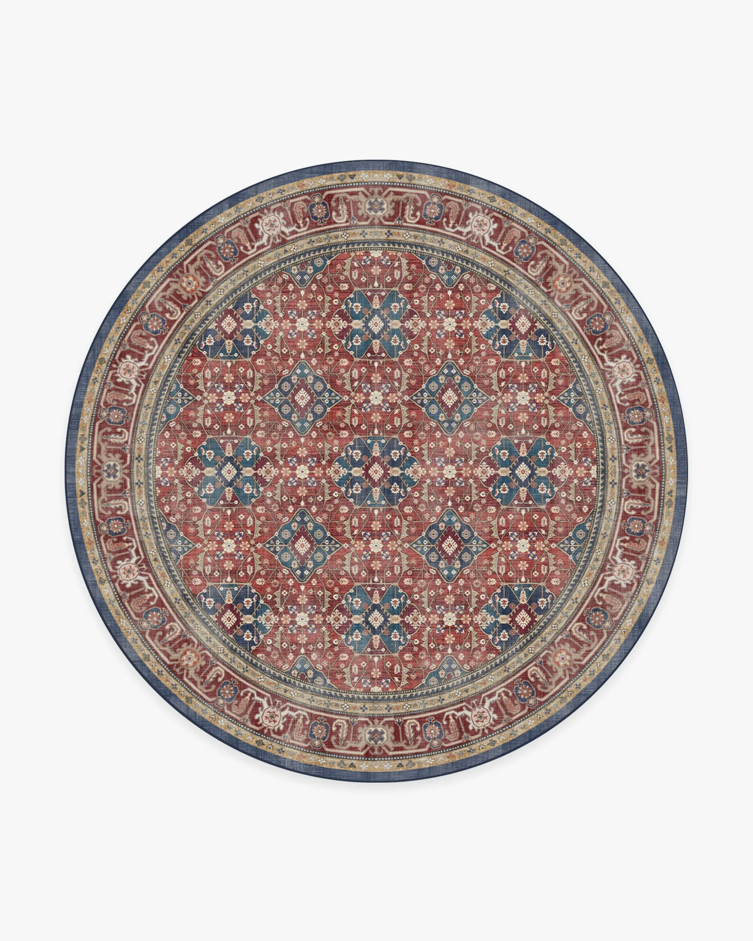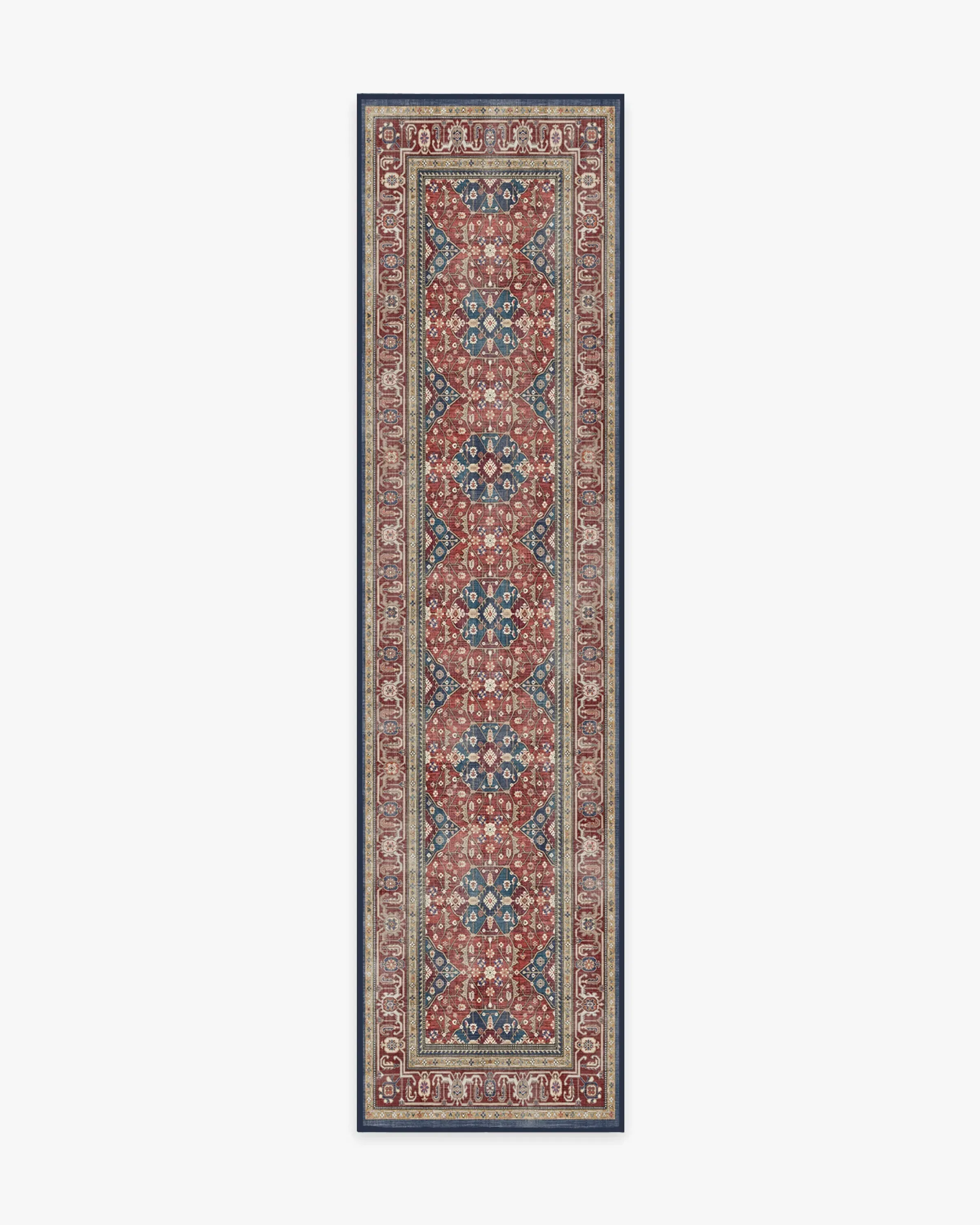 A statement-maker. The checkerboarding coloration and highly decorated border of this rug look striking in rich reds and deep blues with hints of gold. Water-resistant, stain-resistant, and machine-washable. 60x90 | Machine Washable Area Rug | Kid & Pet Friendly | Indoor Rugs | Alessia Royal Red Rug | Ruggable