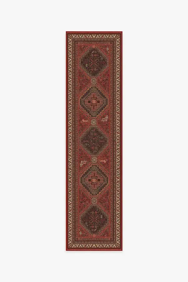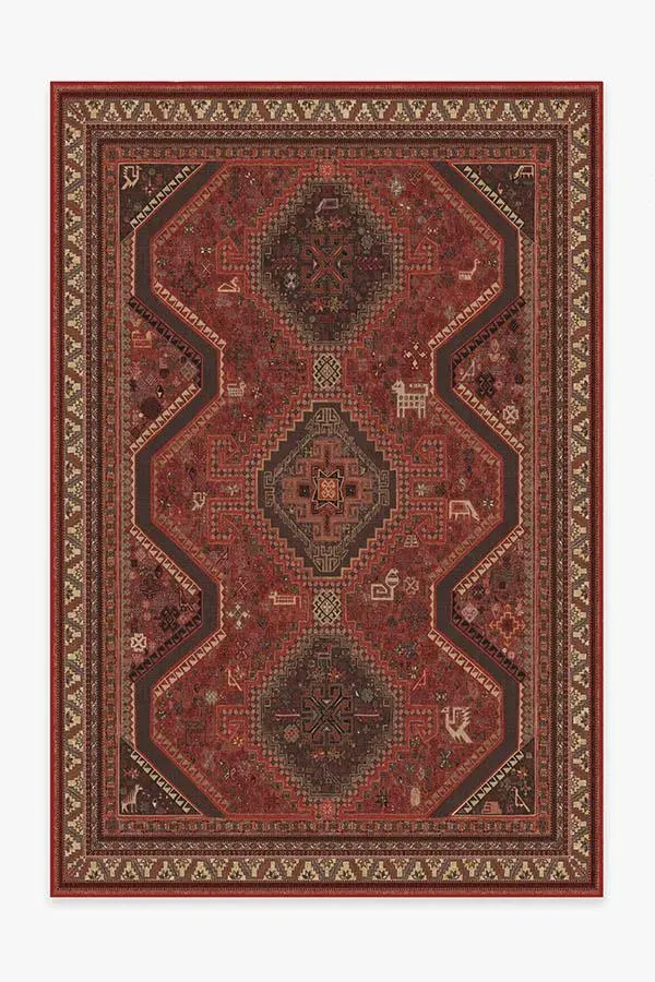 Zareen Scarlet Red Rug brings the timeless elegance of traditional Persian carpets to modern spaces. Tinted in bold and vivid hues of rich red, with pops of light yellow and chocolate brown, this bordered rug features animal figures peppered around hexagon and diamond shapes. A rich and visually riveting design chronicling the lives of the nomadic Persian people. 60x90 | Machine Washable Area Rug | Kid & Pet Friendly | Indoor Rugs | Zareen Scarlet Red Rug | Ruggable