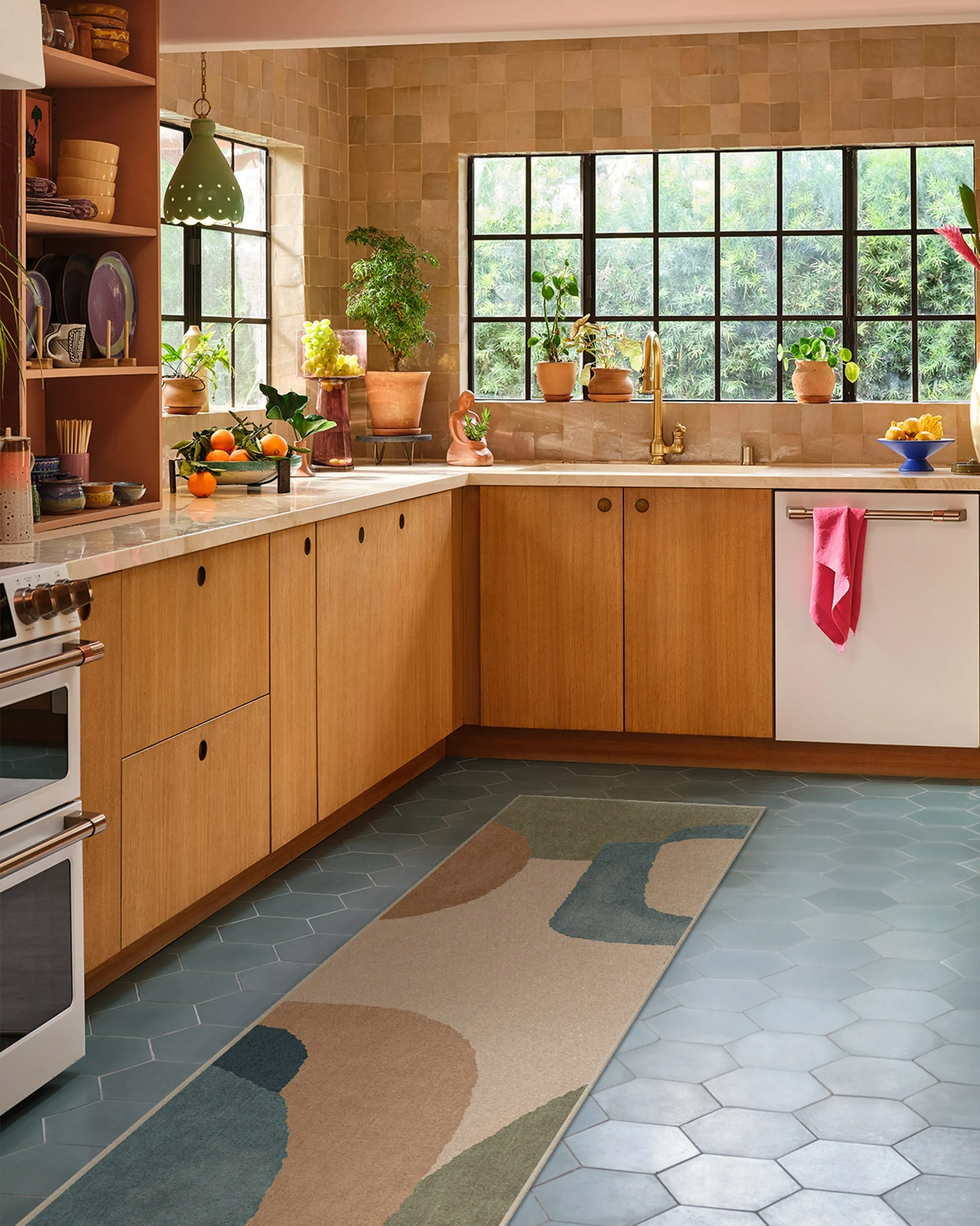 Decorate wild with our Justina Blakeney Sonia Sand & Ocean Rug. Inspired by Justina's original painting, "Tomorrow," this Orphism-like design features Justina's hand-painted geometric shapes playfully intertwined. The colour palette seamlessly blends warm neutrals and creams with and cool blues and soft sage greens. Water-resistant, stain-resistant, and machine-washable. Rug colours may vary slightly according to your device and the lighting in your space. 60x90 | Machine Washable Area Rug | Kid & Pet Friendly | Indoor Rugs | Sonia Sand & Ocean Flatwoven Rug by Justina Blakeney | Ruggable