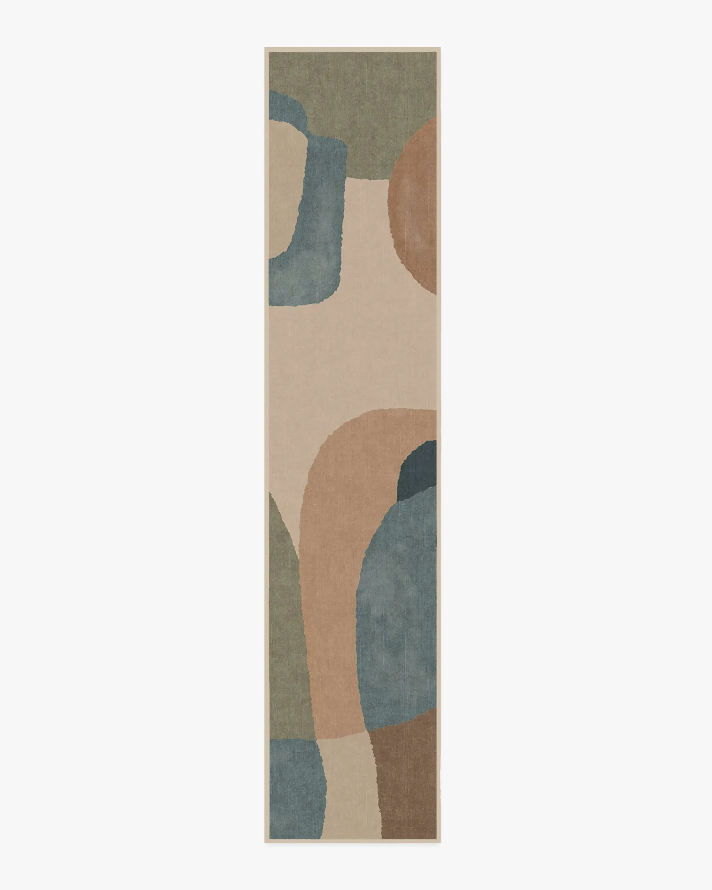 The area rug features hand-painted geometric shapes in an Orphism-inspired design, blending warm neutrals and creams with cool blues and soft sage greens. Its flatwoven construction provides durability, while the water-resistant and stain-resistant properties ensure easy maintenance. The machine-washable design offers convenient care for busy households. Dimensions: W60 x D90 cm.