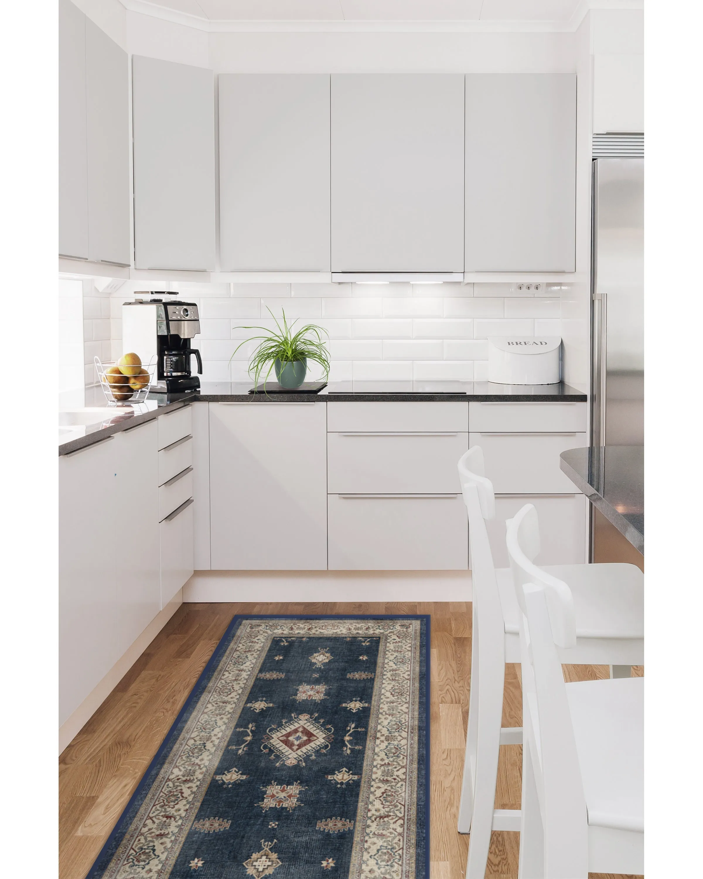 The area rug combines traditional Persian-style design with modern farmhouse appeal, featuring an ornate border around geometric shapes in distressed textures. Its sapphire blue, brown, and ruby red palette creates visual depth, while the flatwoven construction provides durability. The machine washable feature offers easy maintenance, and the pet-friendly material ensures long-lasting use. W60 x D90 cm