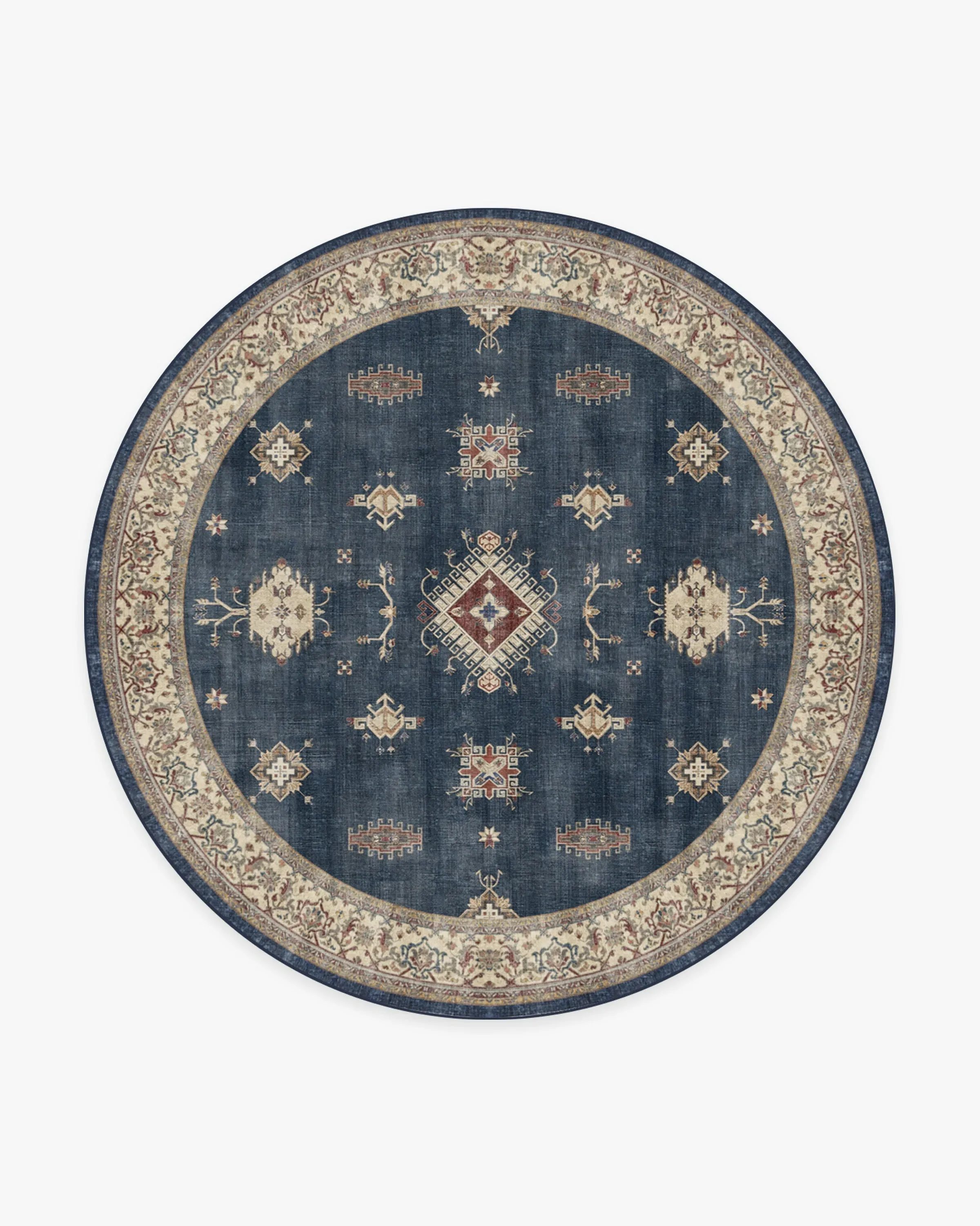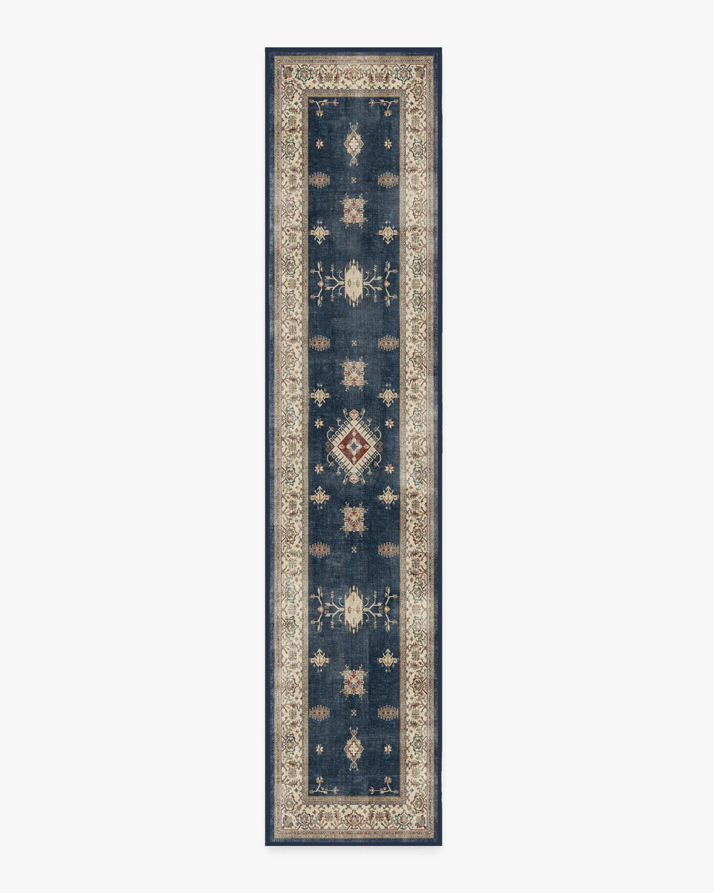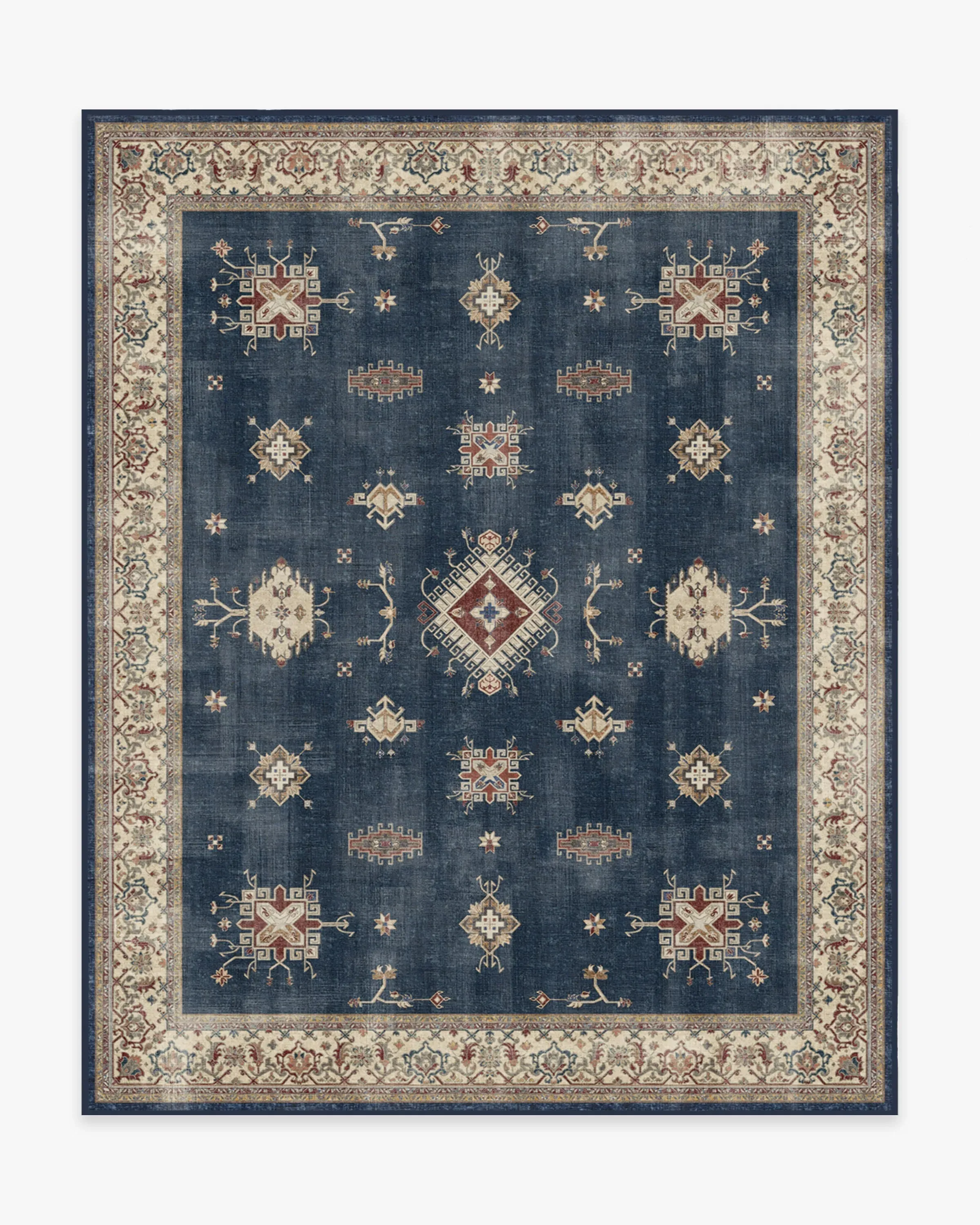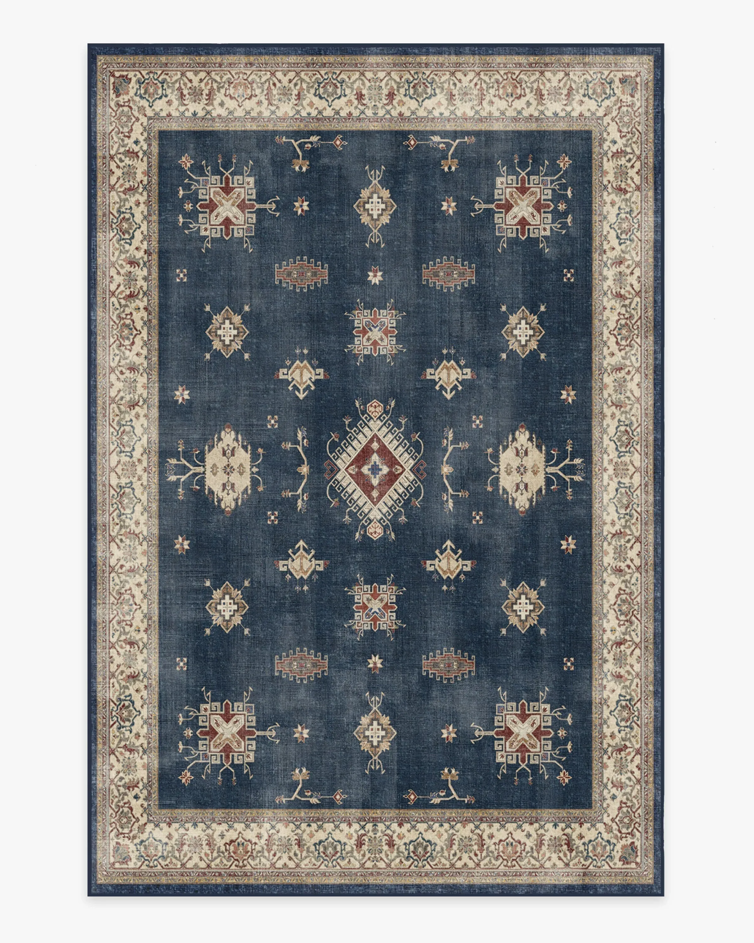Verena Sapphire Rug puts a modern farmhouse spin on a traditional Persian-style design. Tinted in a distress-textured palette of sapphire blue, brown, and ruby red, this area rug features an ornate border around a grid of geometric shapes reminiscent of embellished jewels. 60x90 | Machine Washable Area Rug | Kid & Pet Friendly | Indoor Rugs | Verena Sapphire Flatwoven Rug | Ruggable
