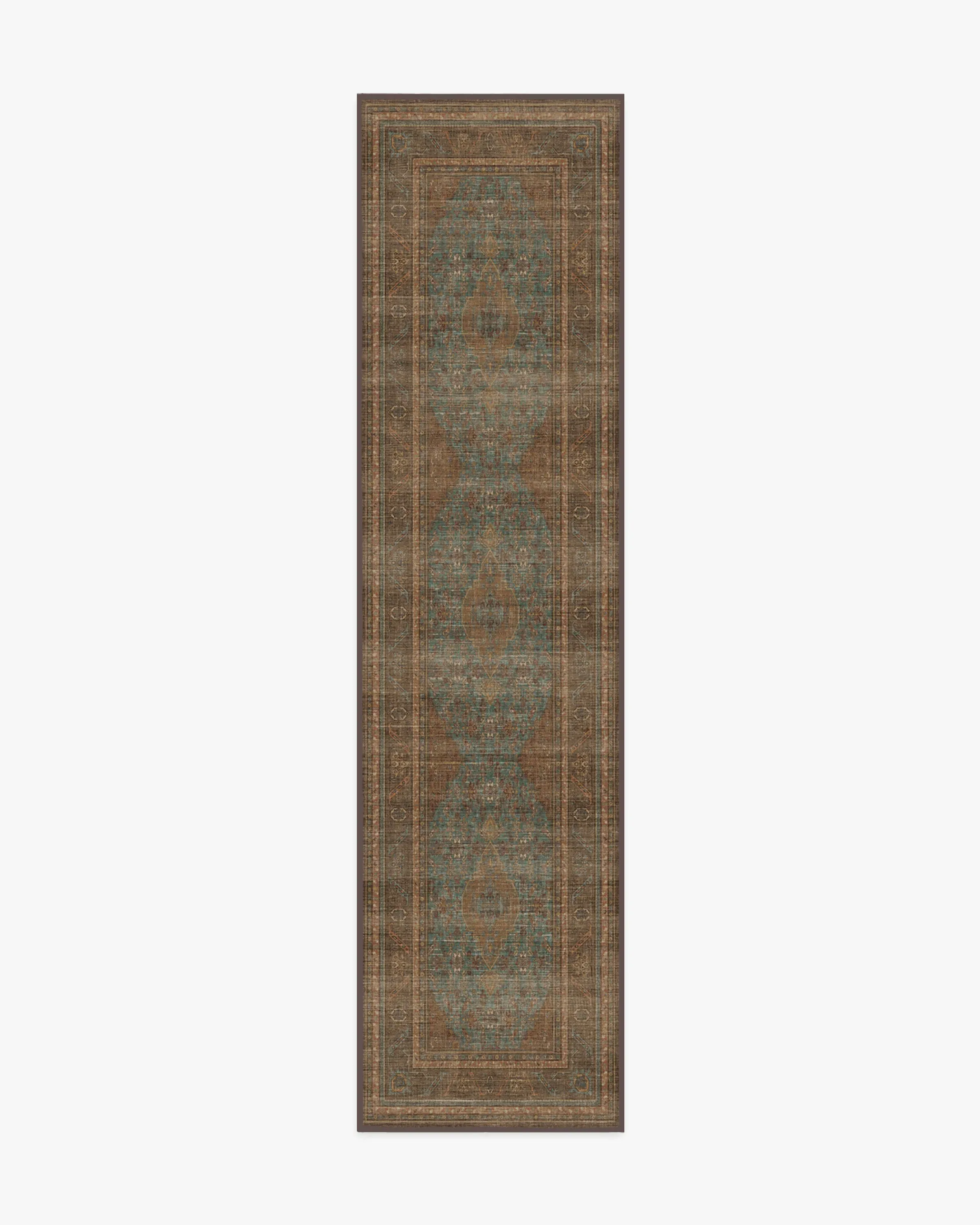Trusted. Tested. Timeless. Inspired by Iraqi and Turkish medallions, our Rowan Teal Blue & Copper Rug features delicate fleurished details and an embellished border. This vintage design blends rich browns, orange copper tones, and soft creams, layering antique charm against a warm teal blue field. Its bold, contrasting colours evoke the warmth of a sunset palette, adding timeless elegance to your decor. Water-resistant, stain-resistant, and machine-washable. Rug colours may vary slightly according to your device and the lighting in your space. 60x90 | Machine Washable Area Rug | Kid & Pet Friendly | Indoor Rugs | Rowan Teal Blue & Copper Rug | Ruggable
