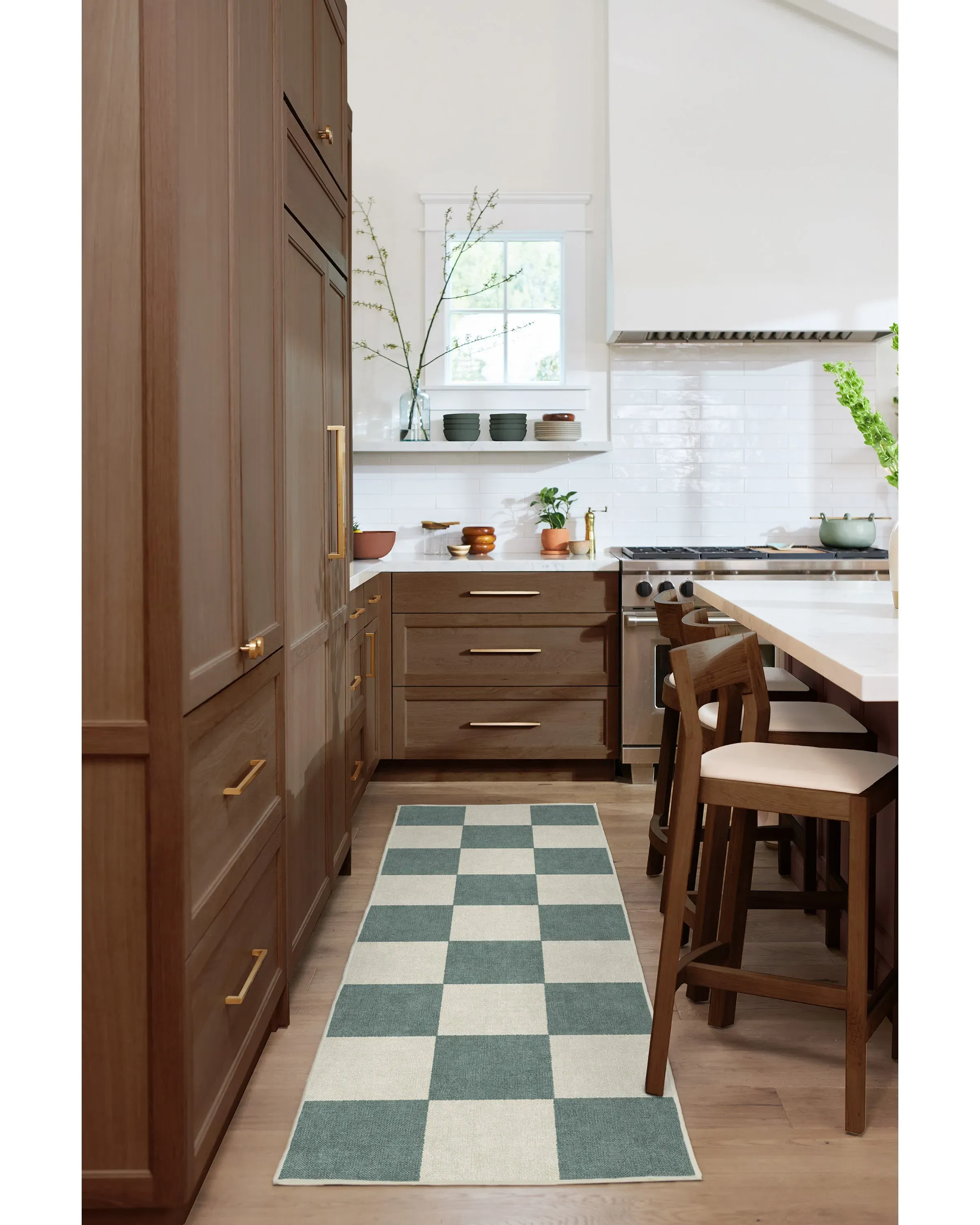 The checkered area rug combines classic design with modern functionality through its machine-washable construction. Its low-pile flatweave features soft spruce green squares against a neutral pearl background, woven from velvety smooth chenille yarn. The water-resistant and stain-resistant material provides durability for daily use, while the washable design offers easy maintenance. W60 x D90 cm.