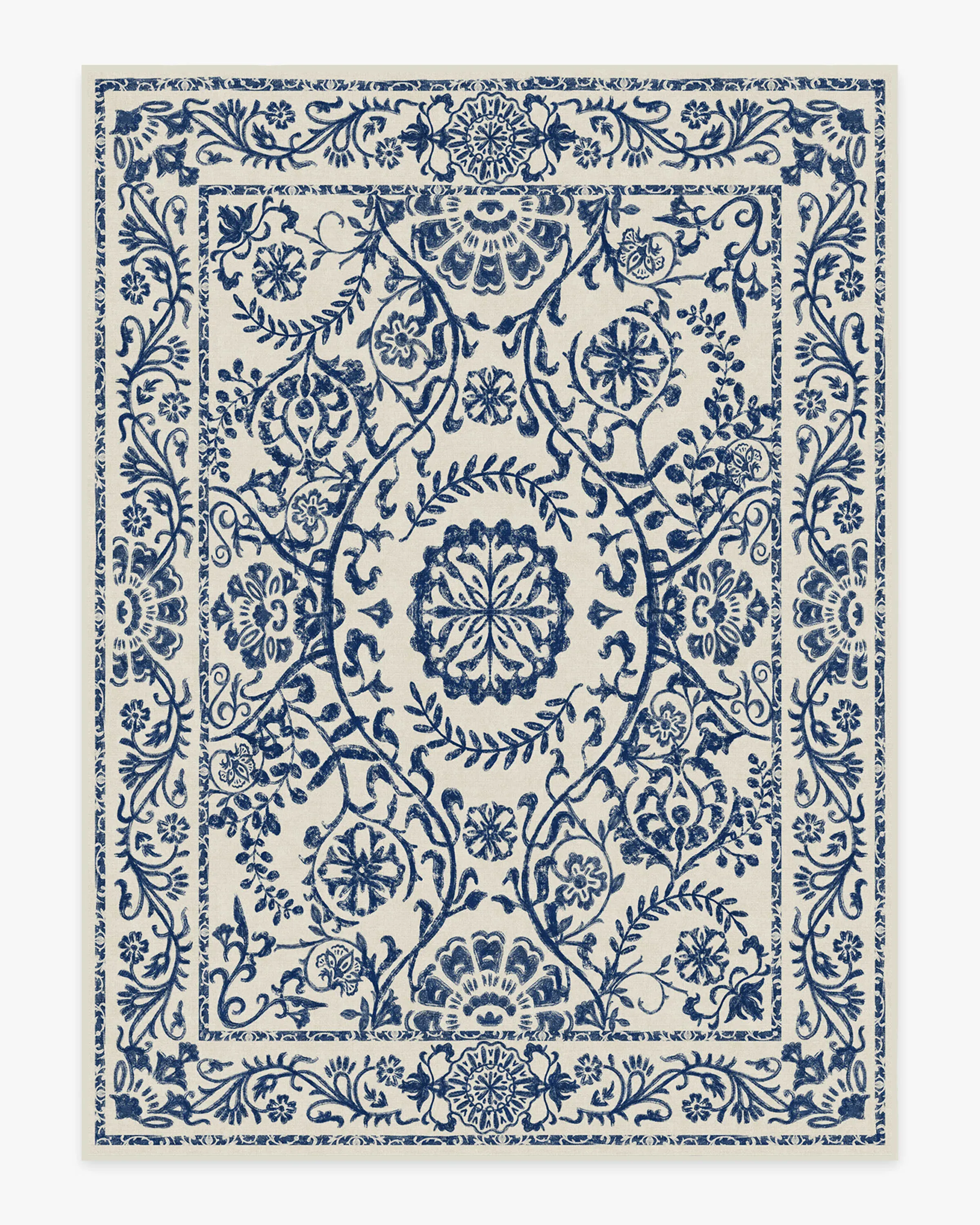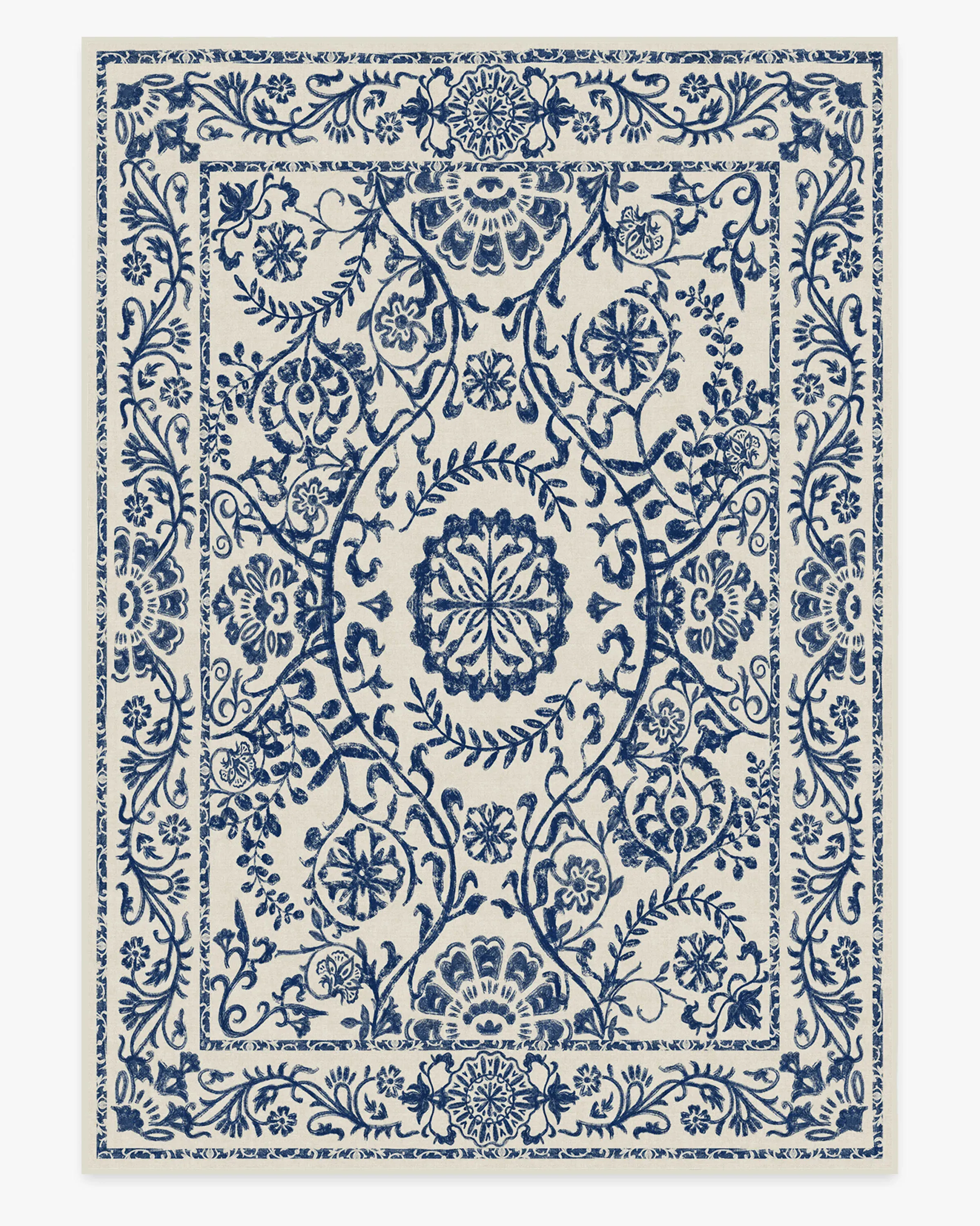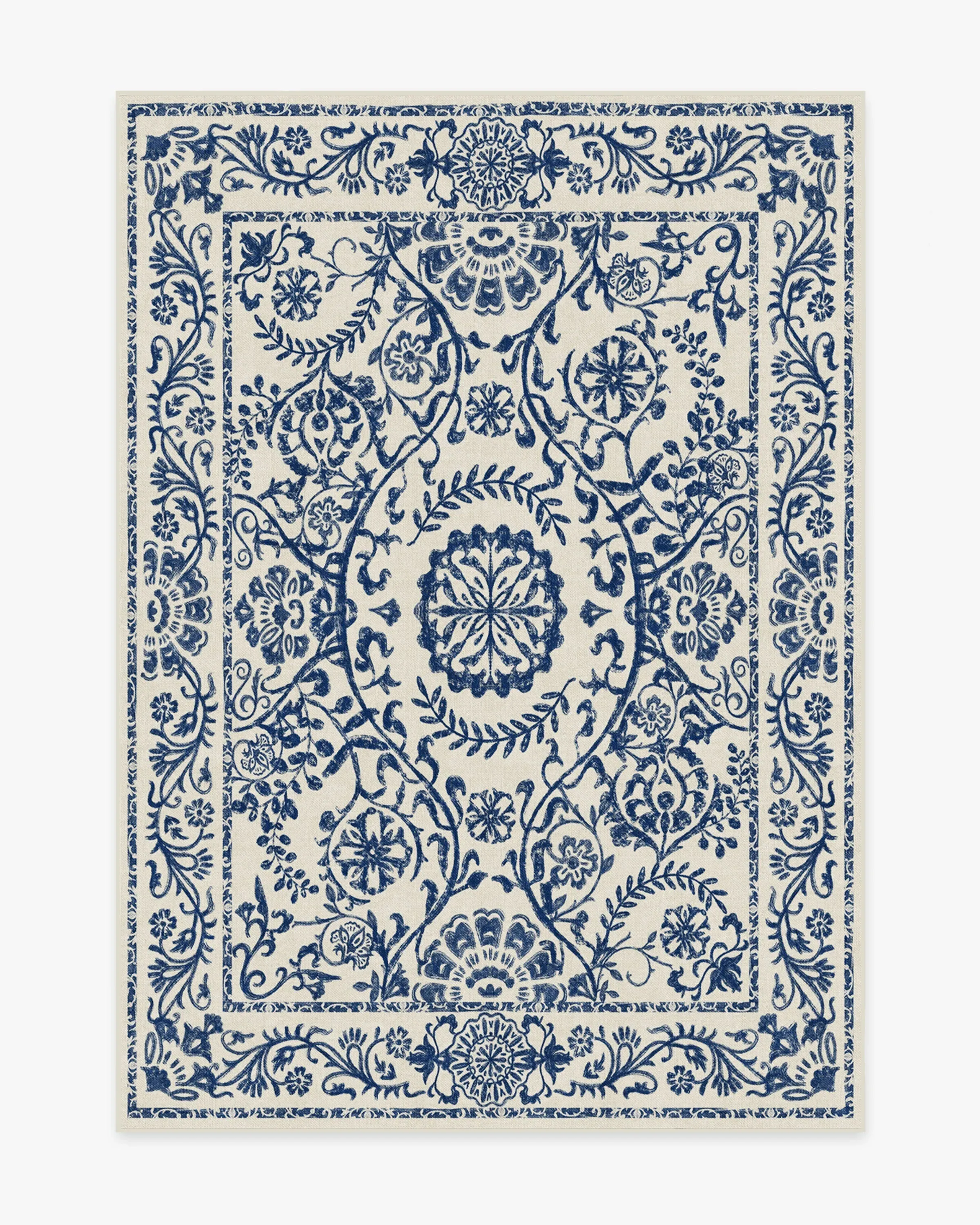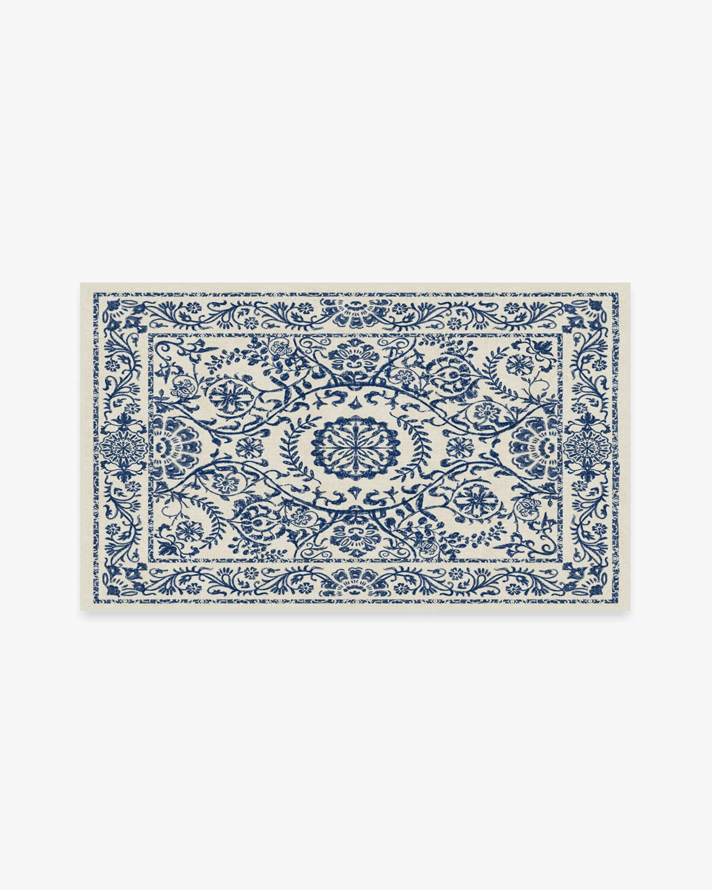 Inspired by the ancient Greek city of Delphi. Our Delphina Delft Blue Rug features a web of intricate floral vines and mimics the uneven texture of traditional woodblock printing. Its bicolour scheme of dark denim blue and pearl white is reminiscent of 17th-century porcelain. Made from our water-resistant, stain-resistant, and machine-washable low-pile Chenille material. 60x90 | Machine Washable Area Rug | Kid & Pet Friendly | Indoor Rugs | Delphina Delft Blue Flatwoven Rug | Ruggable