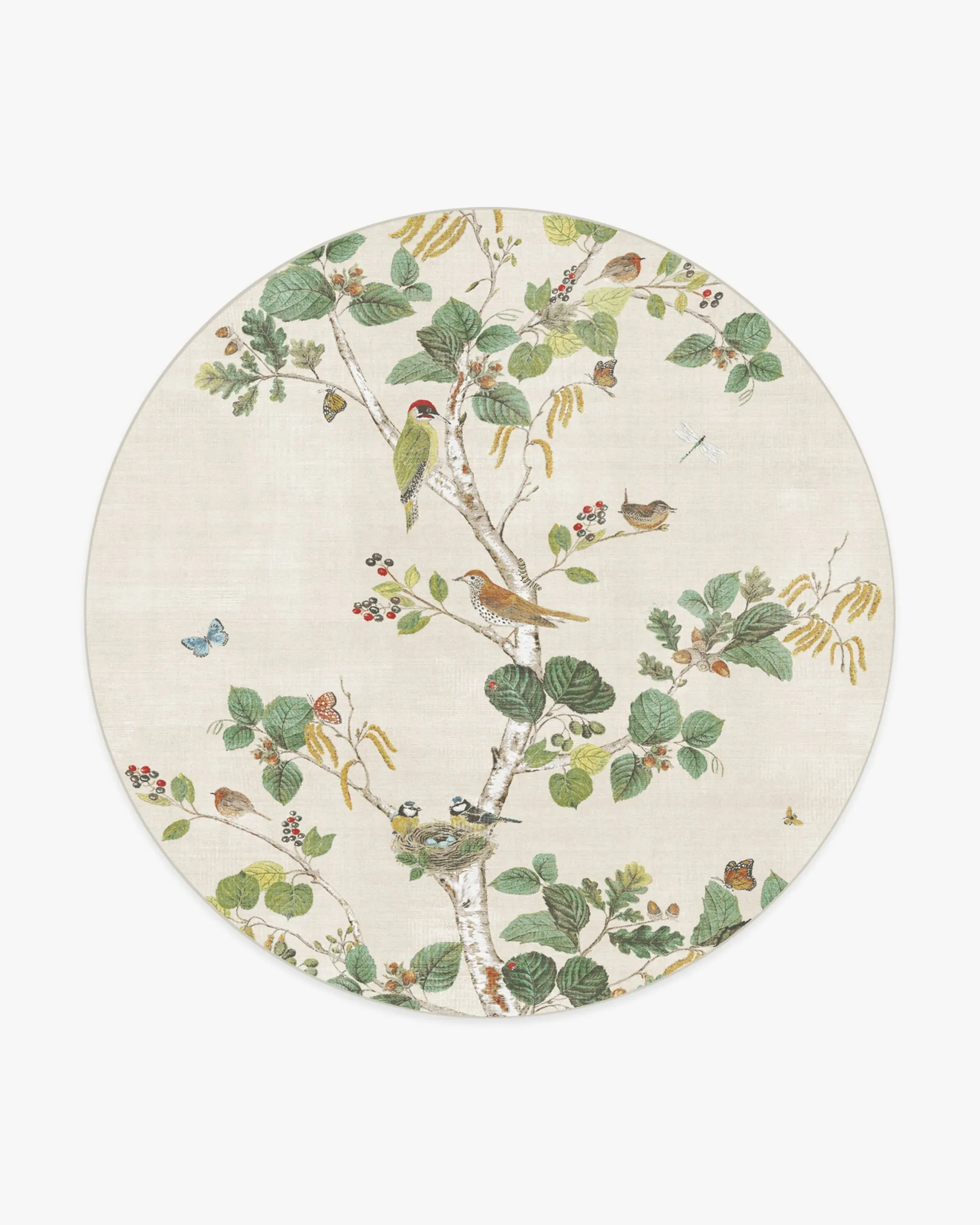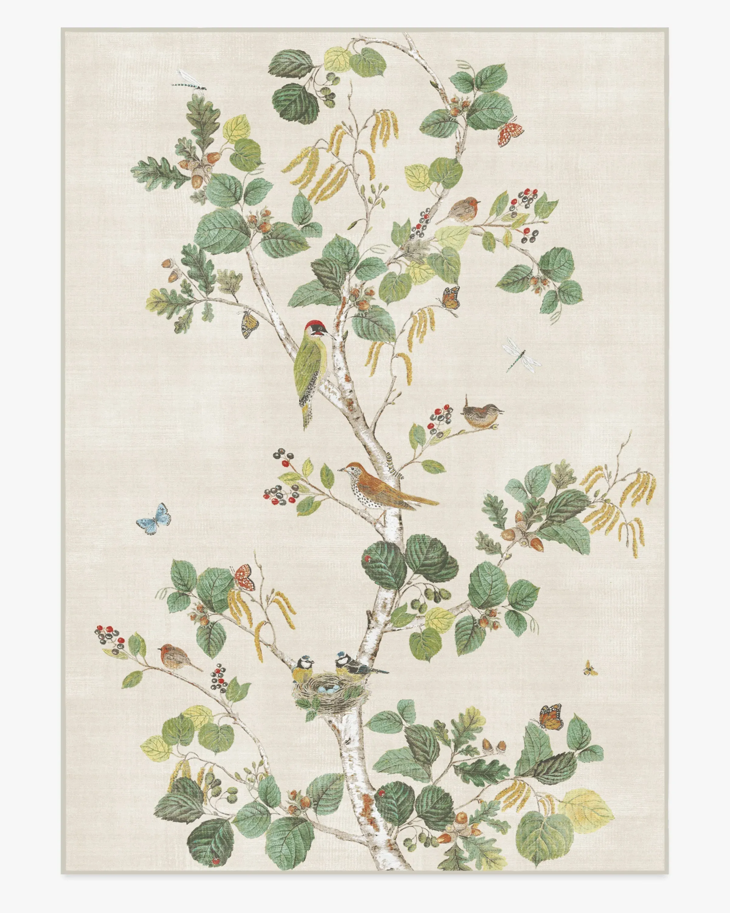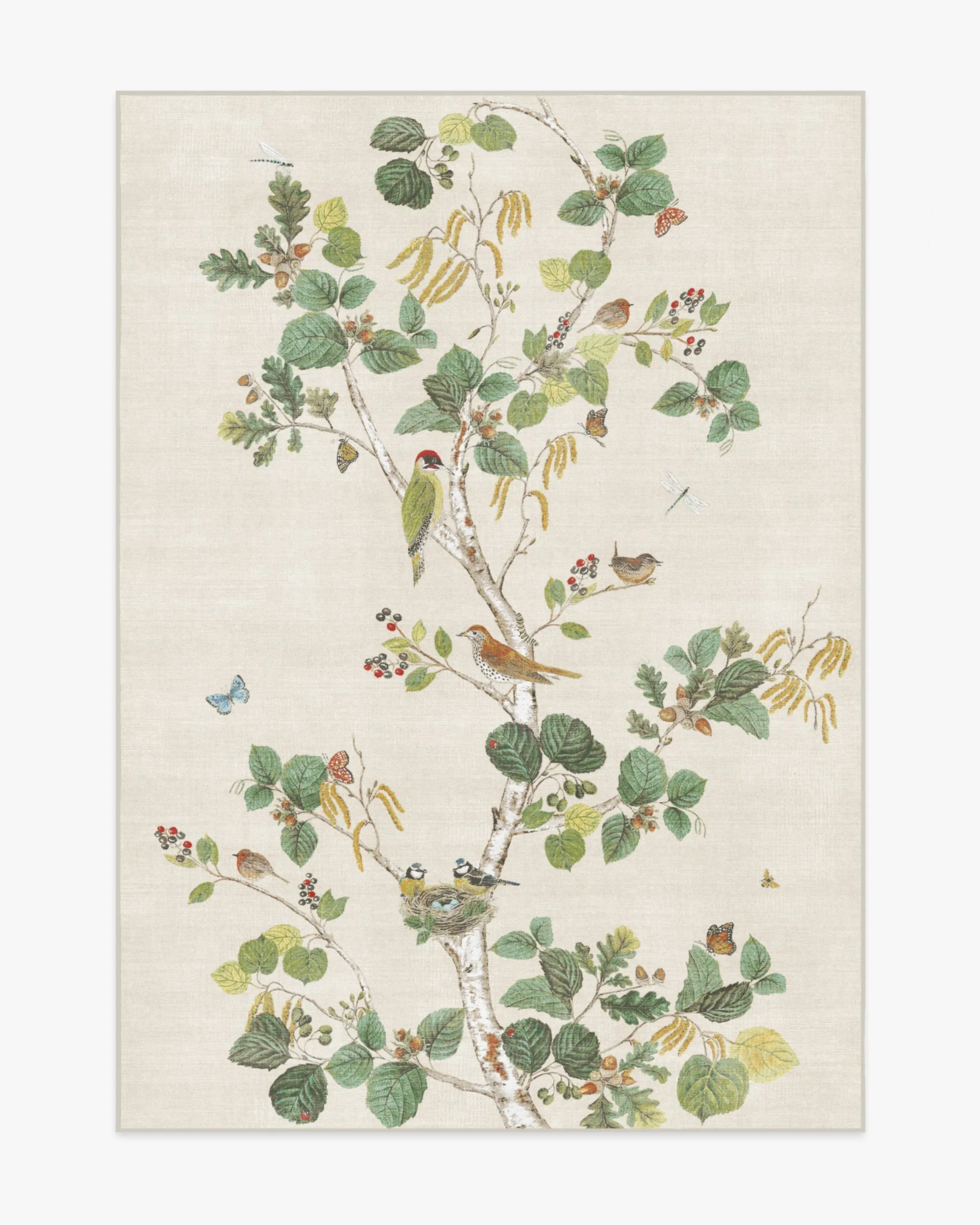 Referencing Woodland Chorus, a Sanderson design inspired by an 18th-century botanical painting, our Sanderson Woodland Chorus Fawn Rug features a variety of birdsâwoodpeckers, wrens, robins, thrushes, and blue tits. Butterflies, insects, ladybirds, and various woodland berries embellish the branches, adding extra life and movement to the design. A palette of natural greens, browns, taupes, yellows, oranges, and reds, set against a beige background, helps create a nature-inspired aesthetic. Water-resistant, stain-resistant, and machine-washable. Rug colours may vary slightly according to your device and the lighting in your space. 60x90 | Machine Washable Area Rug | Kid & Pet Friendly | Indoor Rugs | Woodland Chorus Fawn Flatwoven Rug by Sanderson Off White/cream | Ruggable