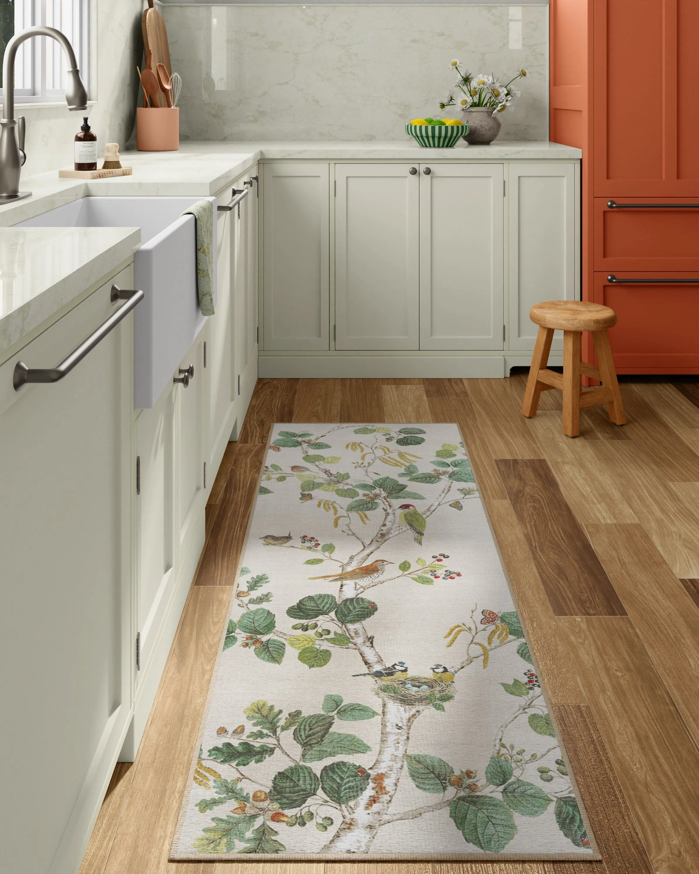 The flatwoven area rug features a botanical woodland design with birds, butterflies, and berries against a beige background. Its machine-washable construction provides easy maintenance, while the water-resistant and stain-resistant properties ensure lasting durability. The flatwoven weave offers comfort underfoot with natural tones of greens, browns, and oranges creating a nature-inspired aesthetic. W60 x D90 cm.