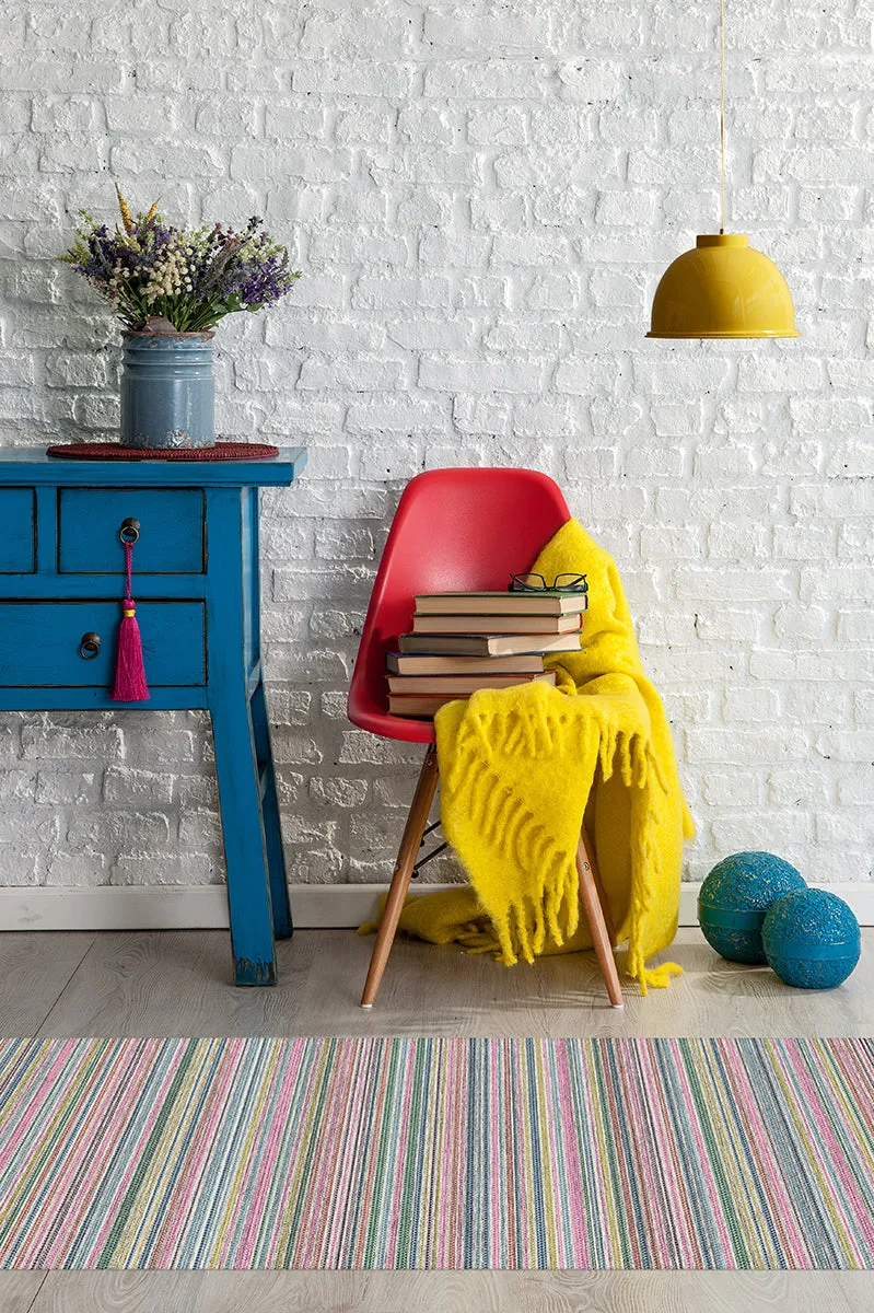 The flatwoven area rug offers vibrant multi-stripe design with its contemporary woven texture, featuring pearl, coconut, ocean blue, concord grape, fuchsia pink, tomato red, evergreen, seafoam blue and limoncello tones. Its machine washable construction provides easy maintenance, while the flatwoven weave adds durability and comfort underfoot. The kid and pet friendly surface suits high-traffic areas, and the polychrome pattern brings colorful style to any space. W60 x D90 cm.