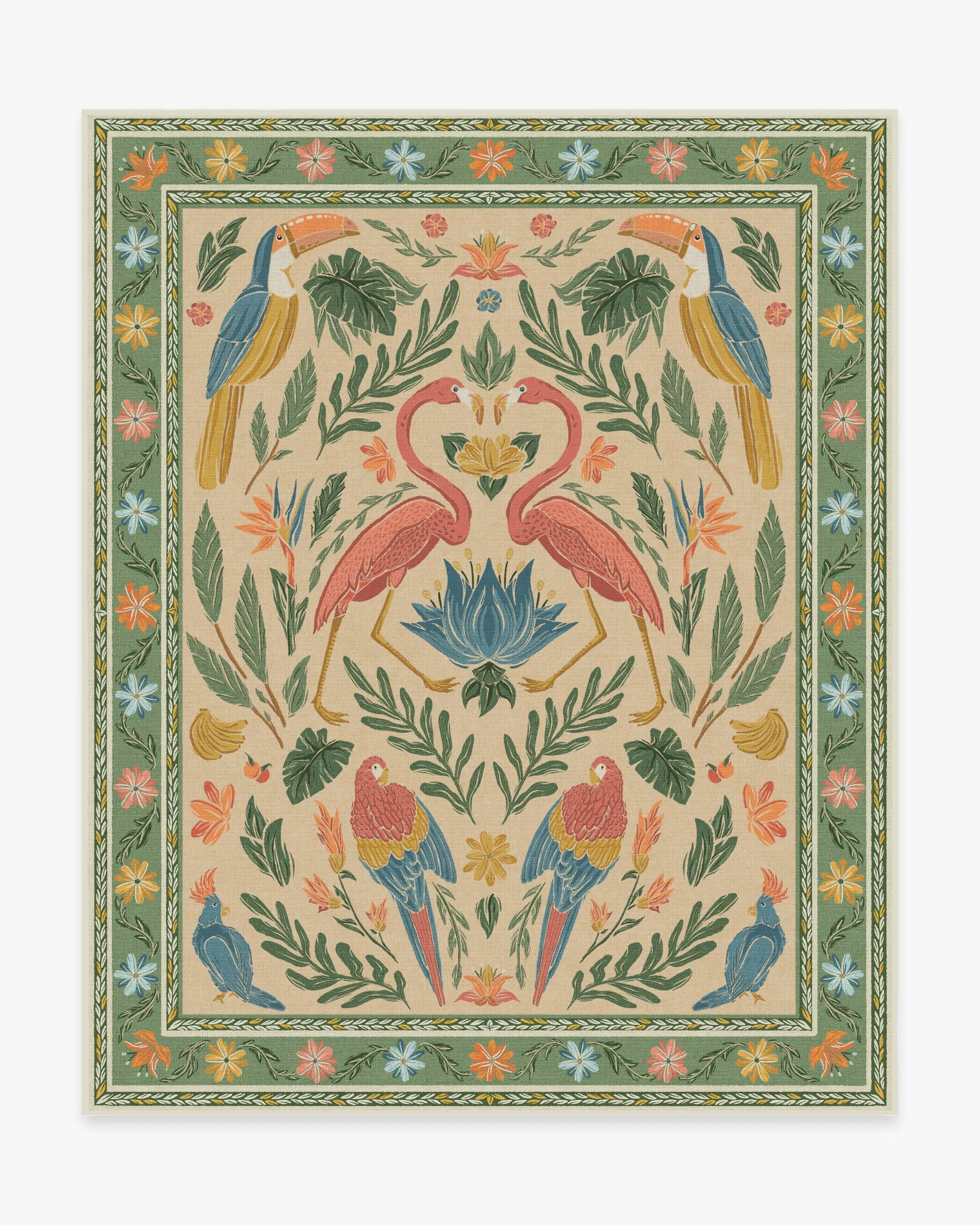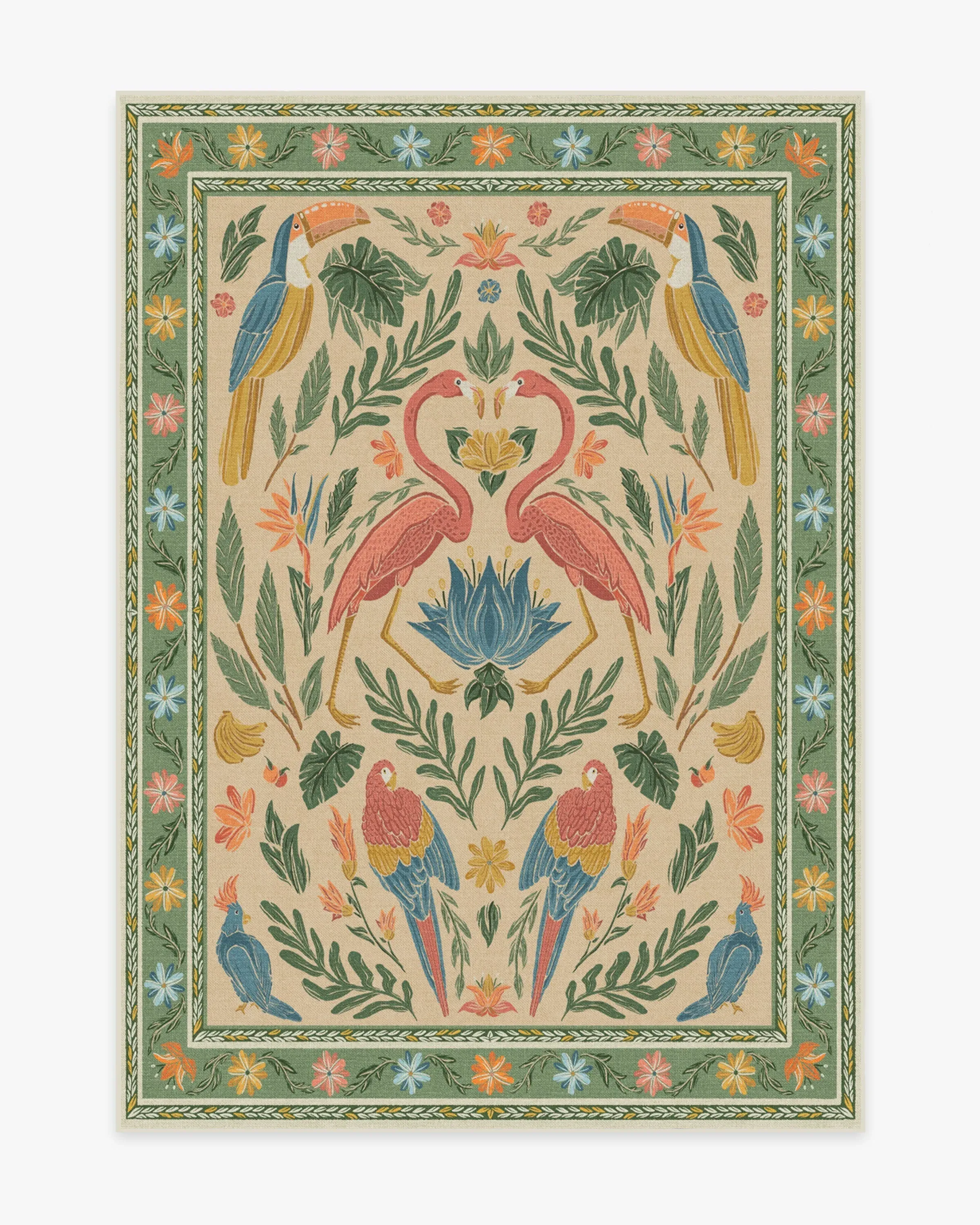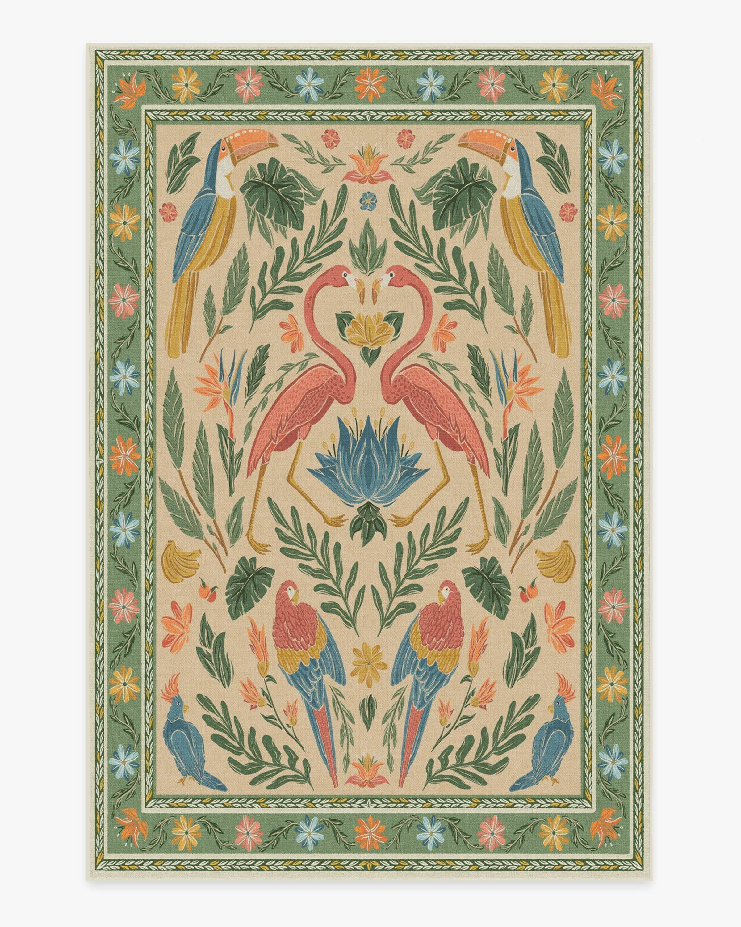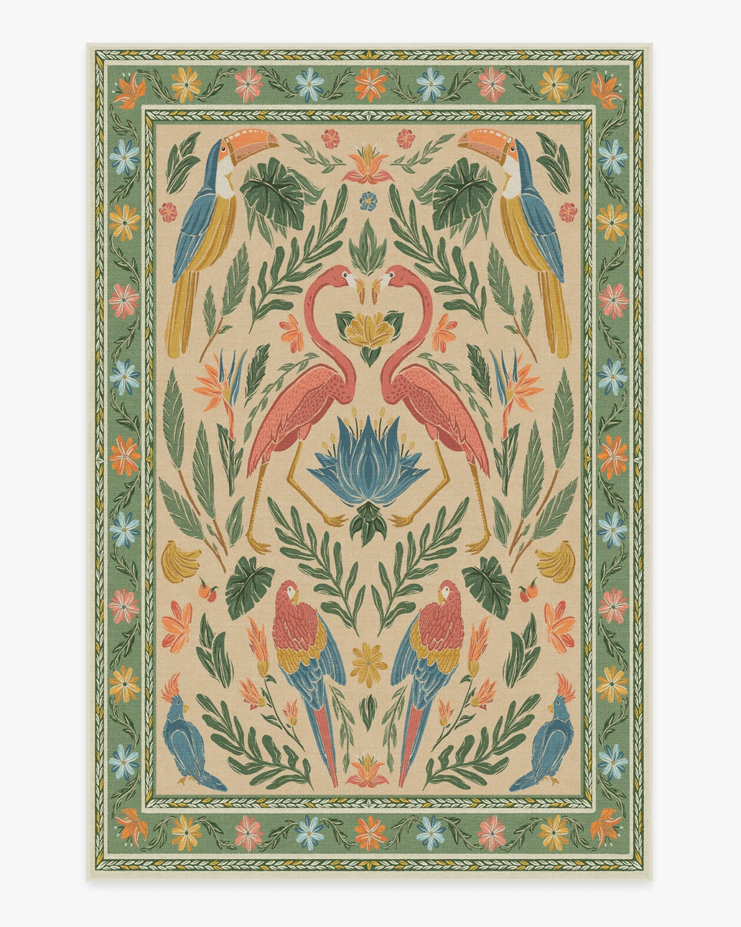 Im-peck-able. Our Birds of a Feather Green & Peach Rug is a bold and bright celebration of tropical birds including toucans, parrots, and flamingos. This mirrored design boasts a green and peach palette of tangerine, pink, yellow, and leafy green. Set against a nude background with a green border reminiscent of Palm Beach, the bold contrast evokes lively, playful energy similar to that of the exotic birds depicted. Made from our water-resistant, stain-resistant, and machine-washable low-pile Classic material. Our Classic Rugs are woven from a velvety smooth chenille yarn. Rug colours may vary slightly according to your device and the lighting in your space. 60x90 | Machine Washable Area Rug | Kid & Pet Friendly | Indoor Rugs | Birds Of A Feather Green & Peach Flatwoven Rug by Iris Apfel | Ruggable