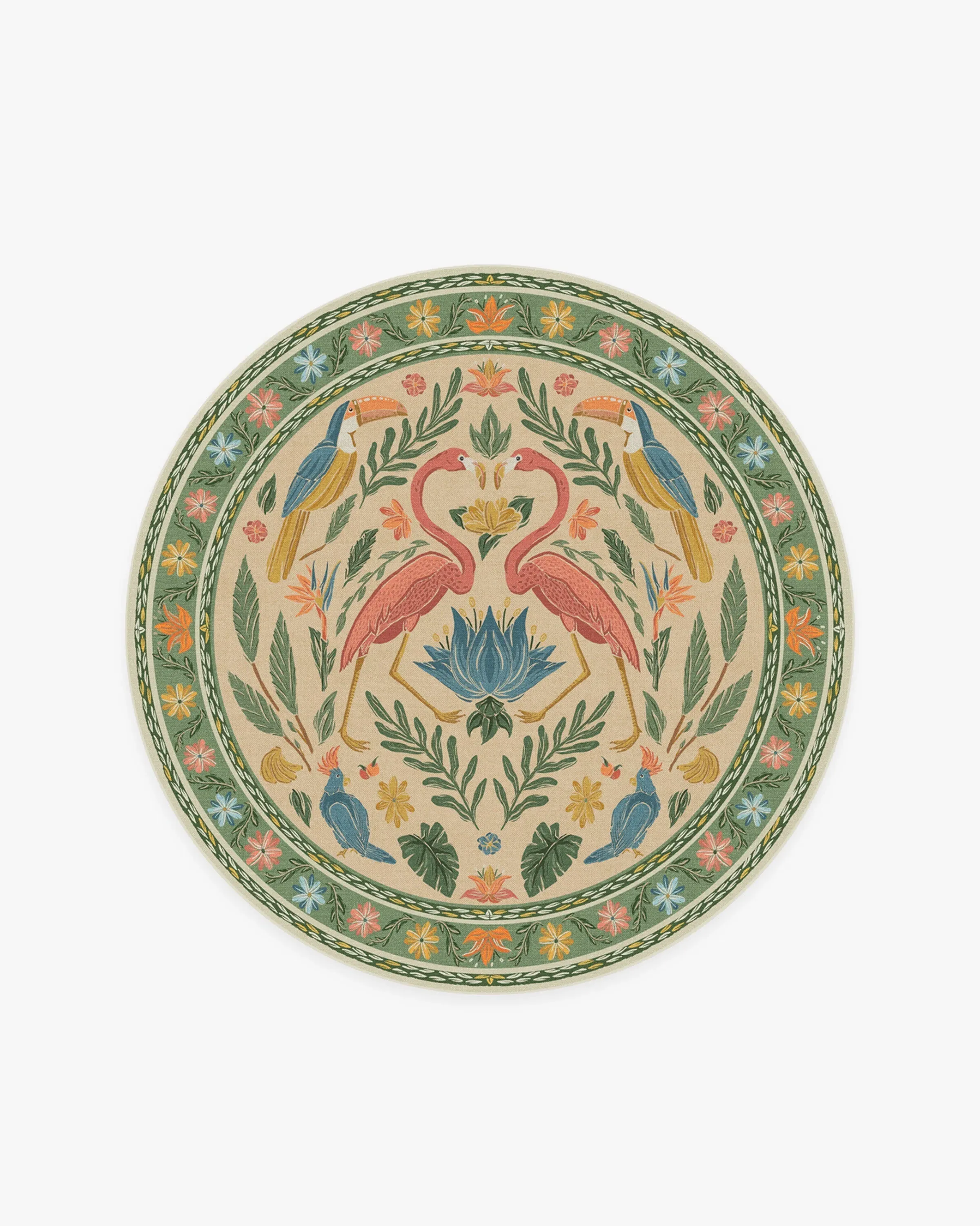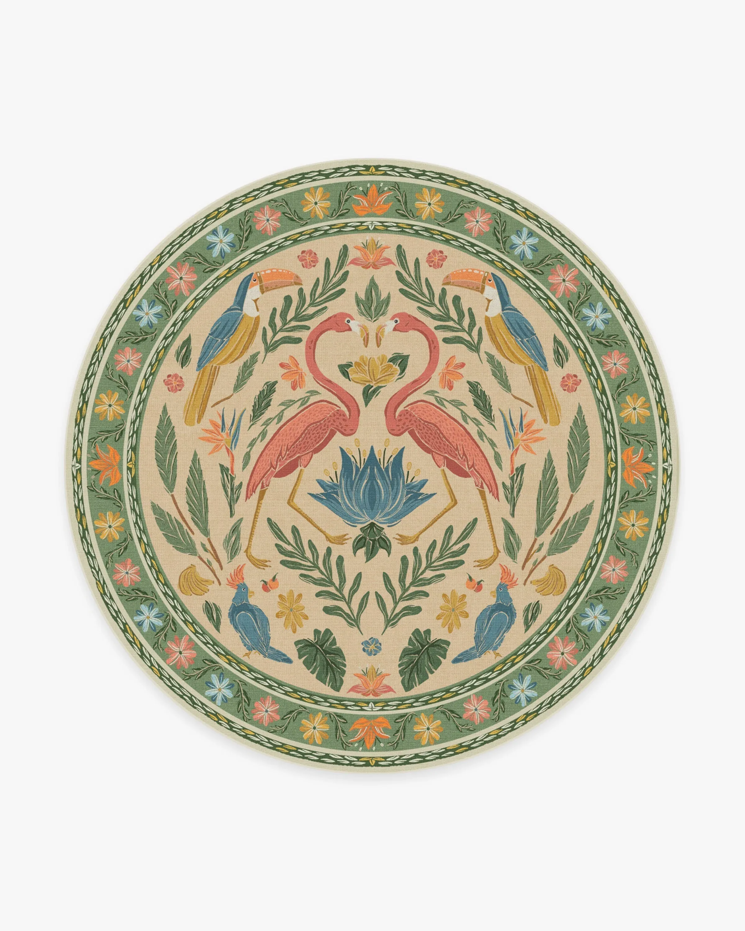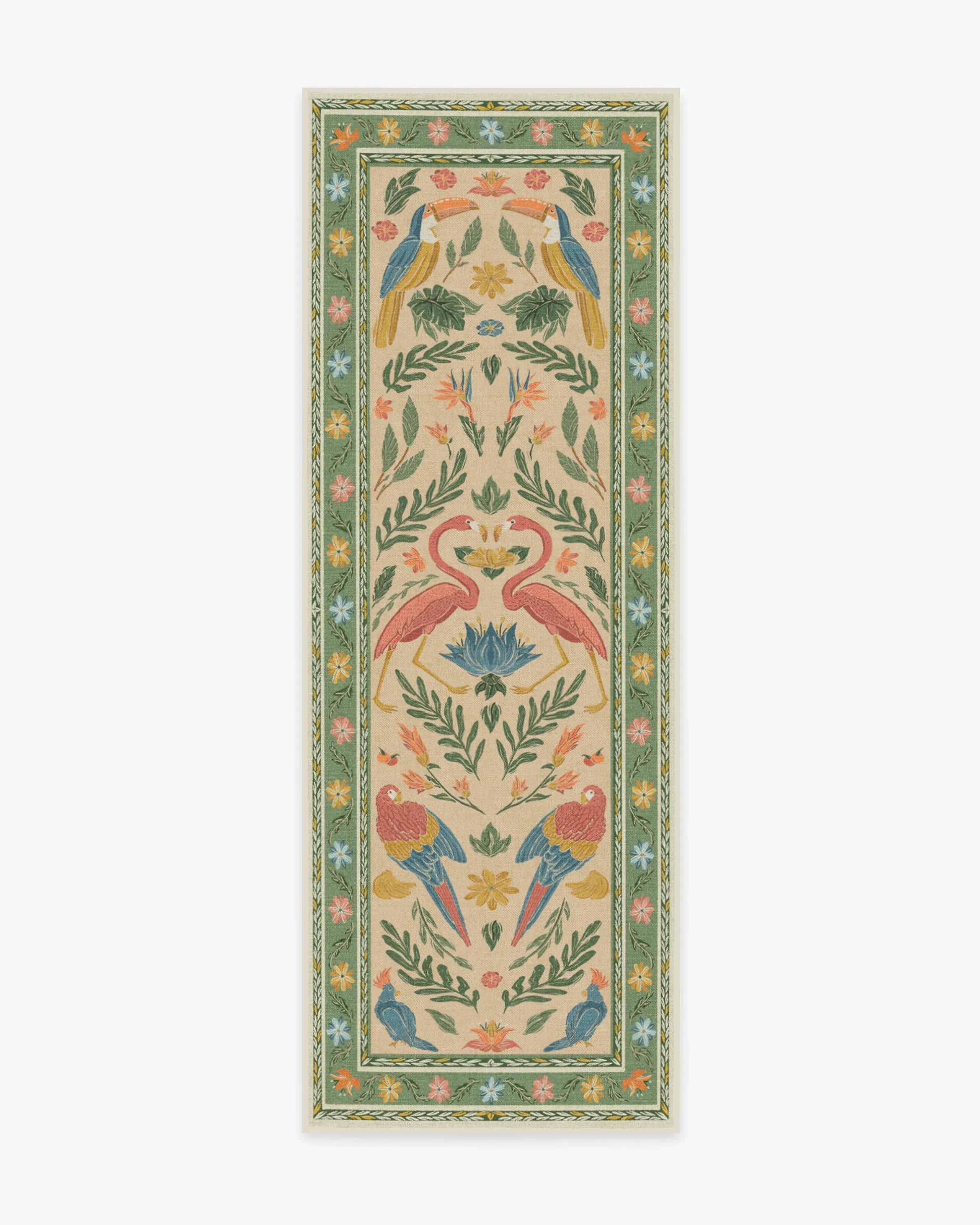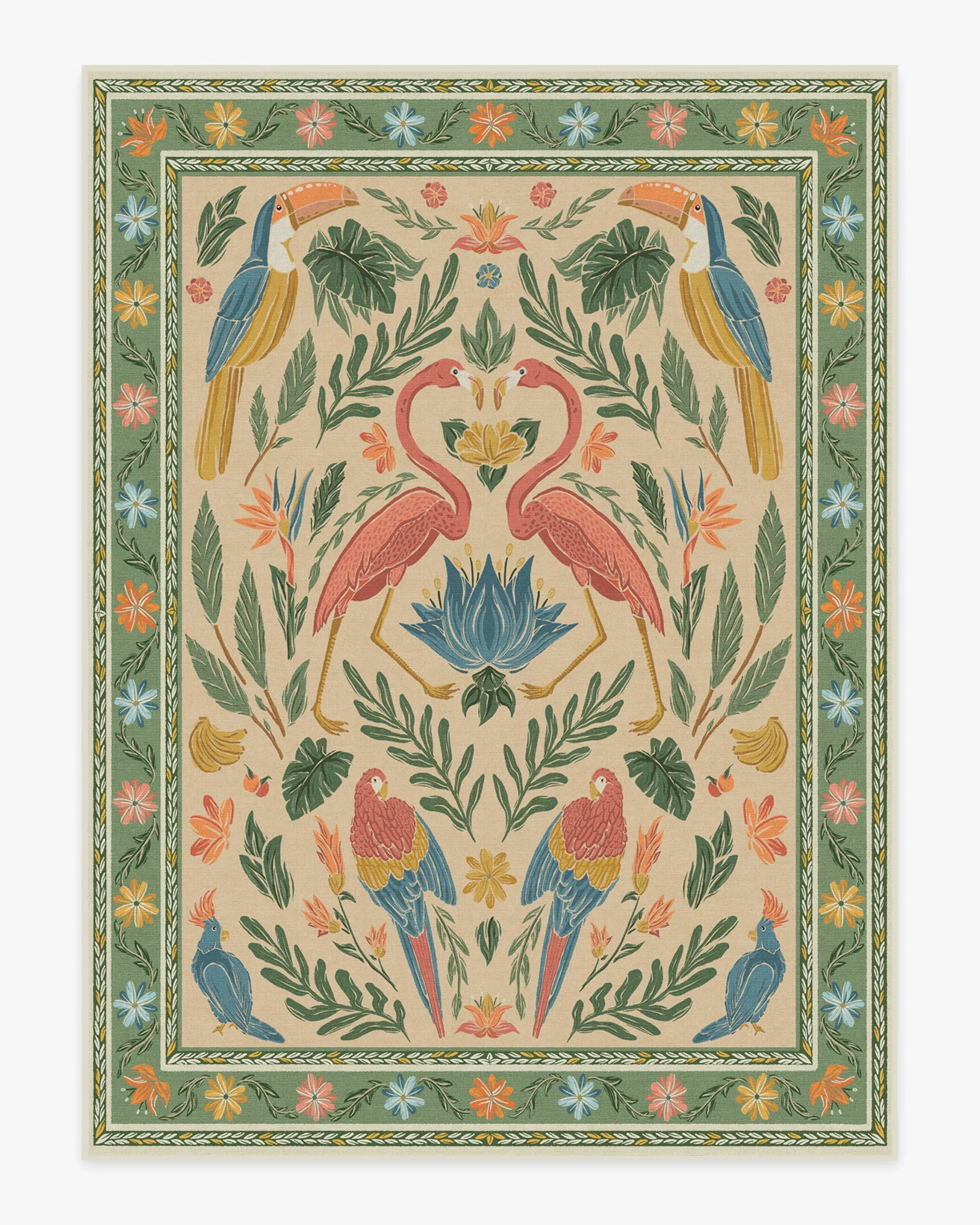 Im-peck-able. Our Birds of a Feather Green & Peach Rug is a bold and bright celebration of tropical birds including toucans, parrots, and flamingos. This mirrored design boasts a green and peach palette of tangerine, pink, yellow, and leafy green. Set against a nude background with a green border reminiscent of Palm Beach, the bold contrast evokes lively, playful energy similar to that of the exotic birds depicted. Made from our water-resistant, stain-resistant, and machine-washable low-pile Classic material. Our Classic Rugs are woven from a velvety smooth chenille yarn. Rug colours may vary slightly according to your device and the lighting in your space. 60x90 | Machine Washable Area Rug | Kid & Pet Friendly | Indoor Rugs | Birds Of A Feather Green & Peach Flatwoven Rug by Iris Apfel | Ruggable