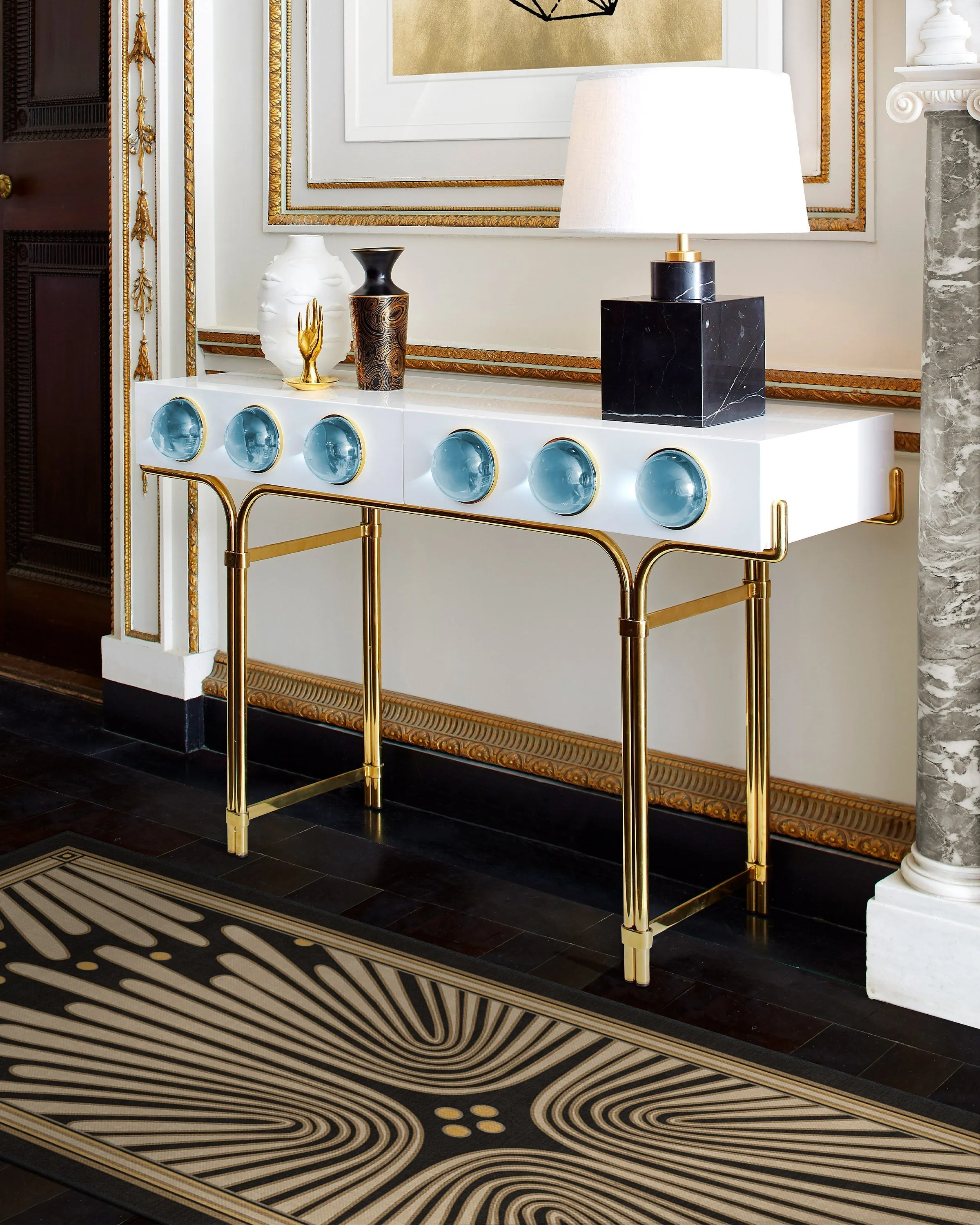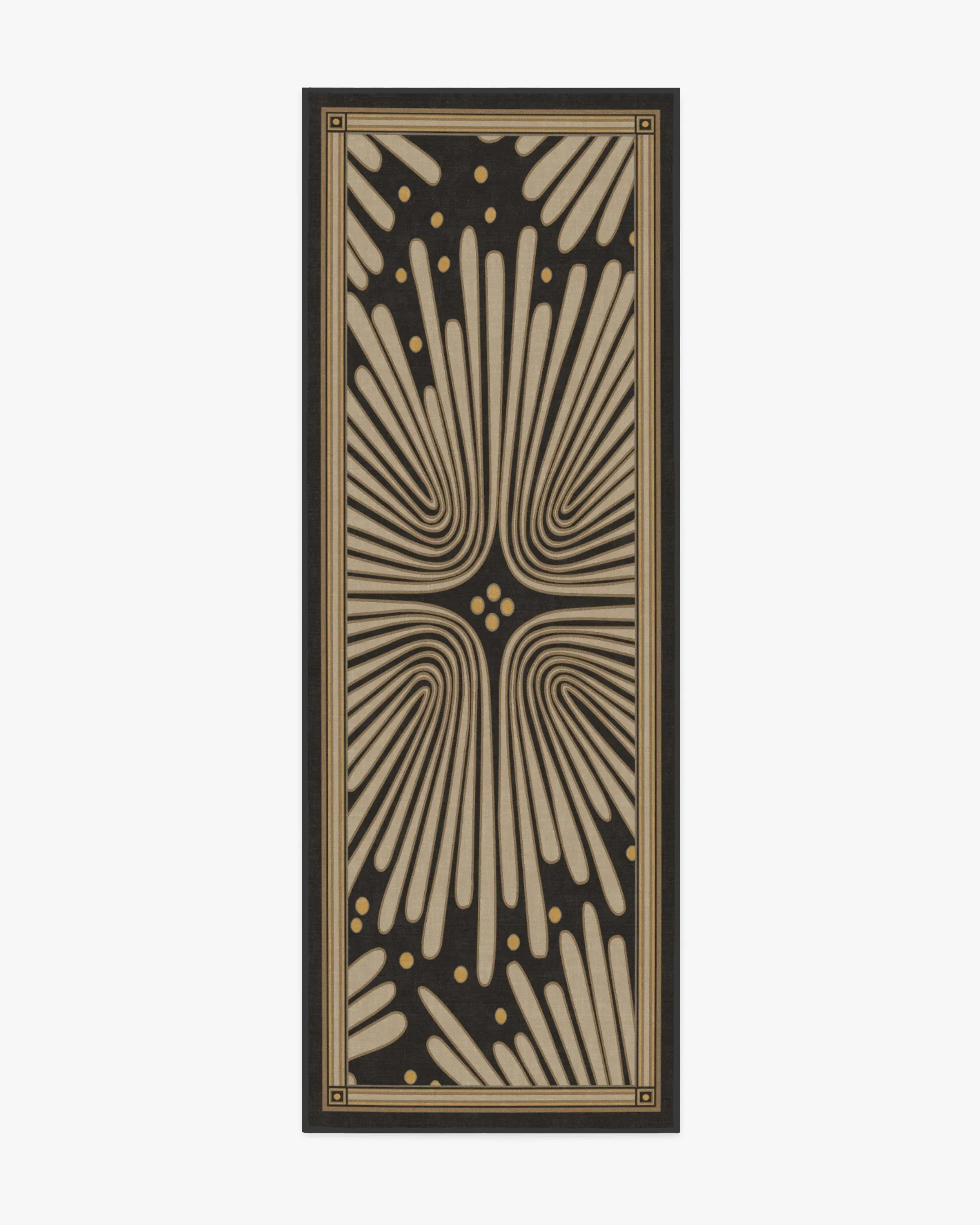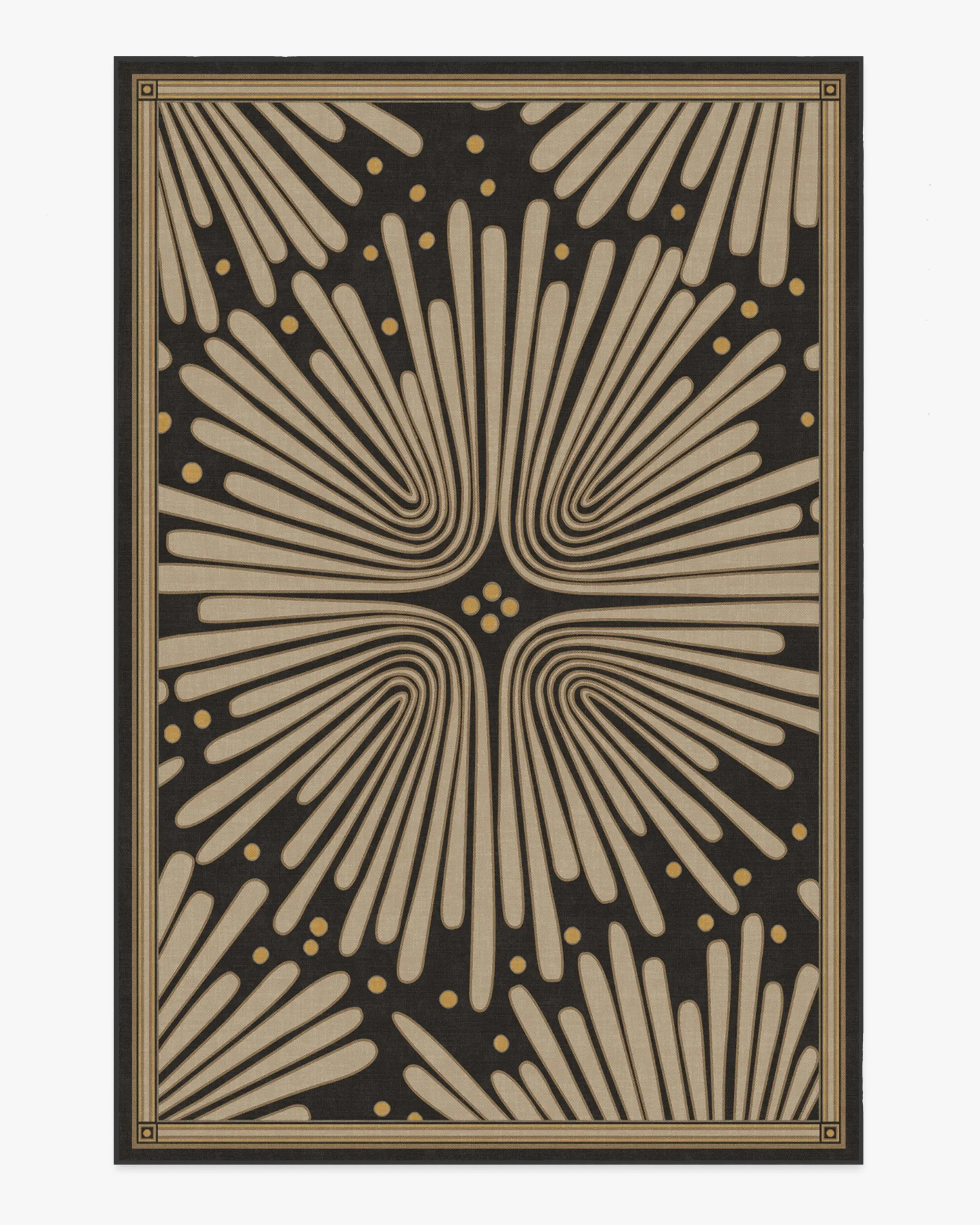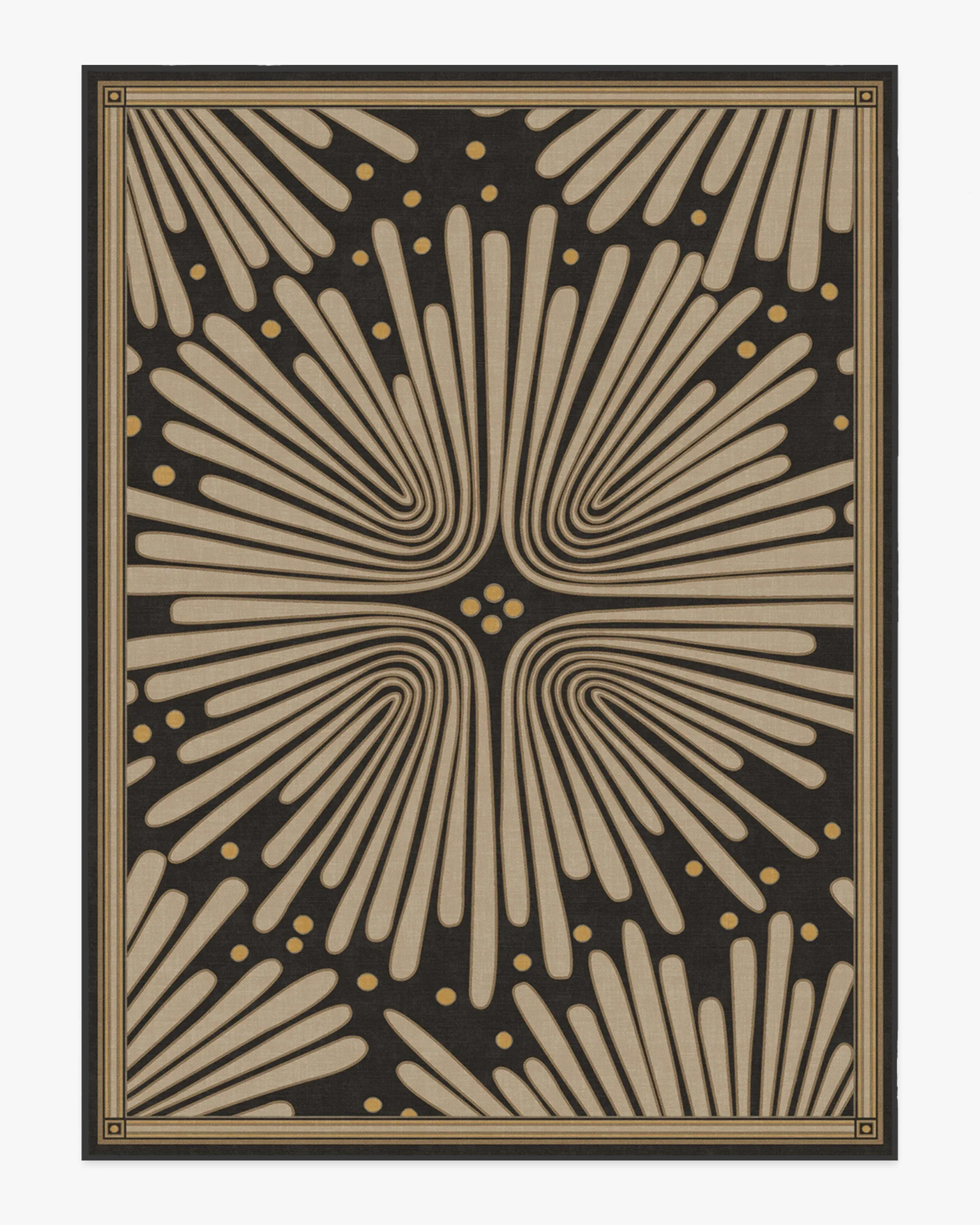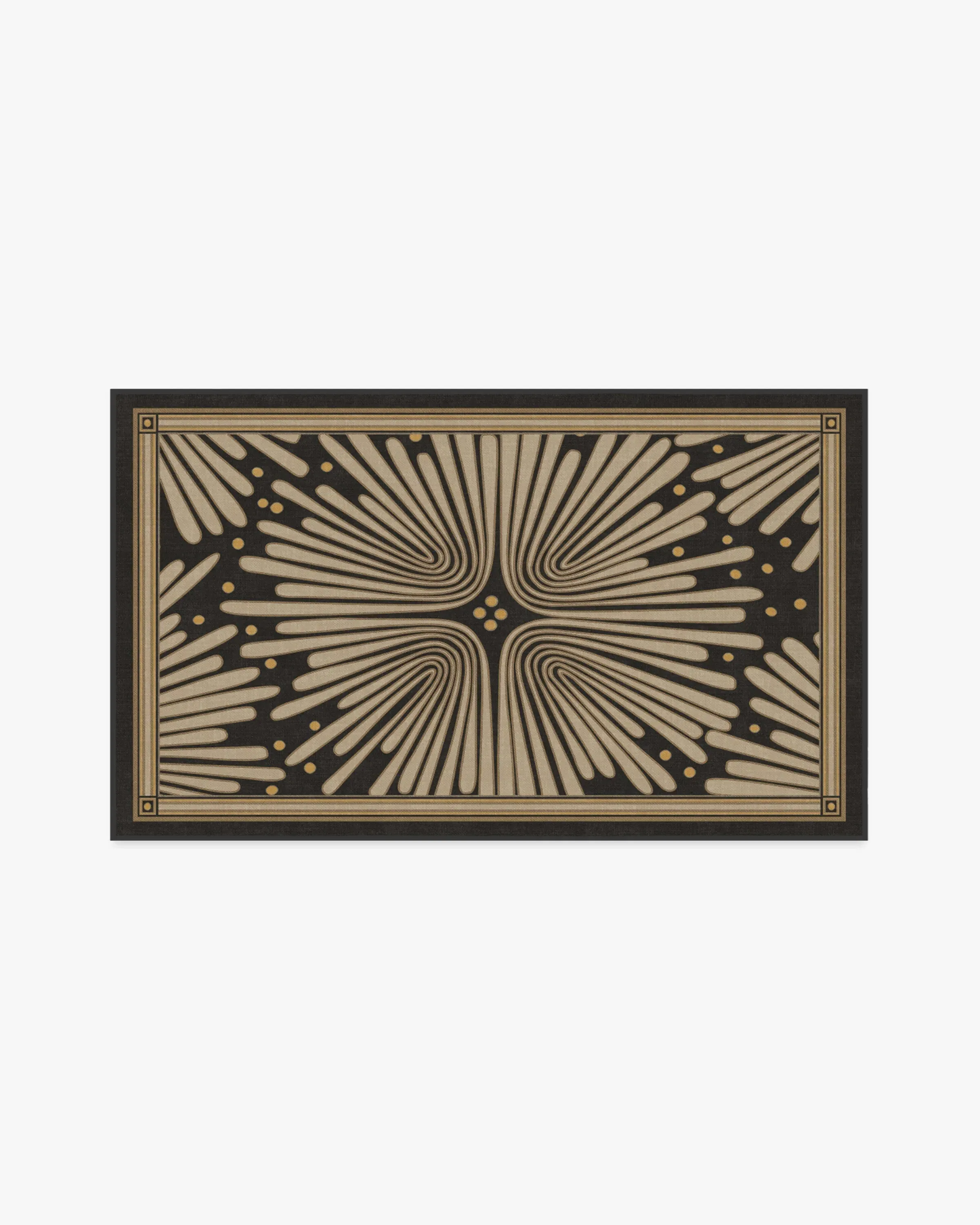 Let's party! Bring home jazz-age glamour with our Jonathan Adler Gatsby Black & Gold Rug. This bold design features a cream floral motif against a soft black background, creating a striking contrast that adds an air of sophistication to any room. Water-resistant, stain-resistant, and machine-washable. Rug colours may vary slightly according to your device and the lighting in your space. 60x90 | Machine Washable Area Rug | Kid & Pet Friendly | Indoor Rugs | Gatsby Black & Gold Flatwoven Rug by Jonathan Adler | Ruggable