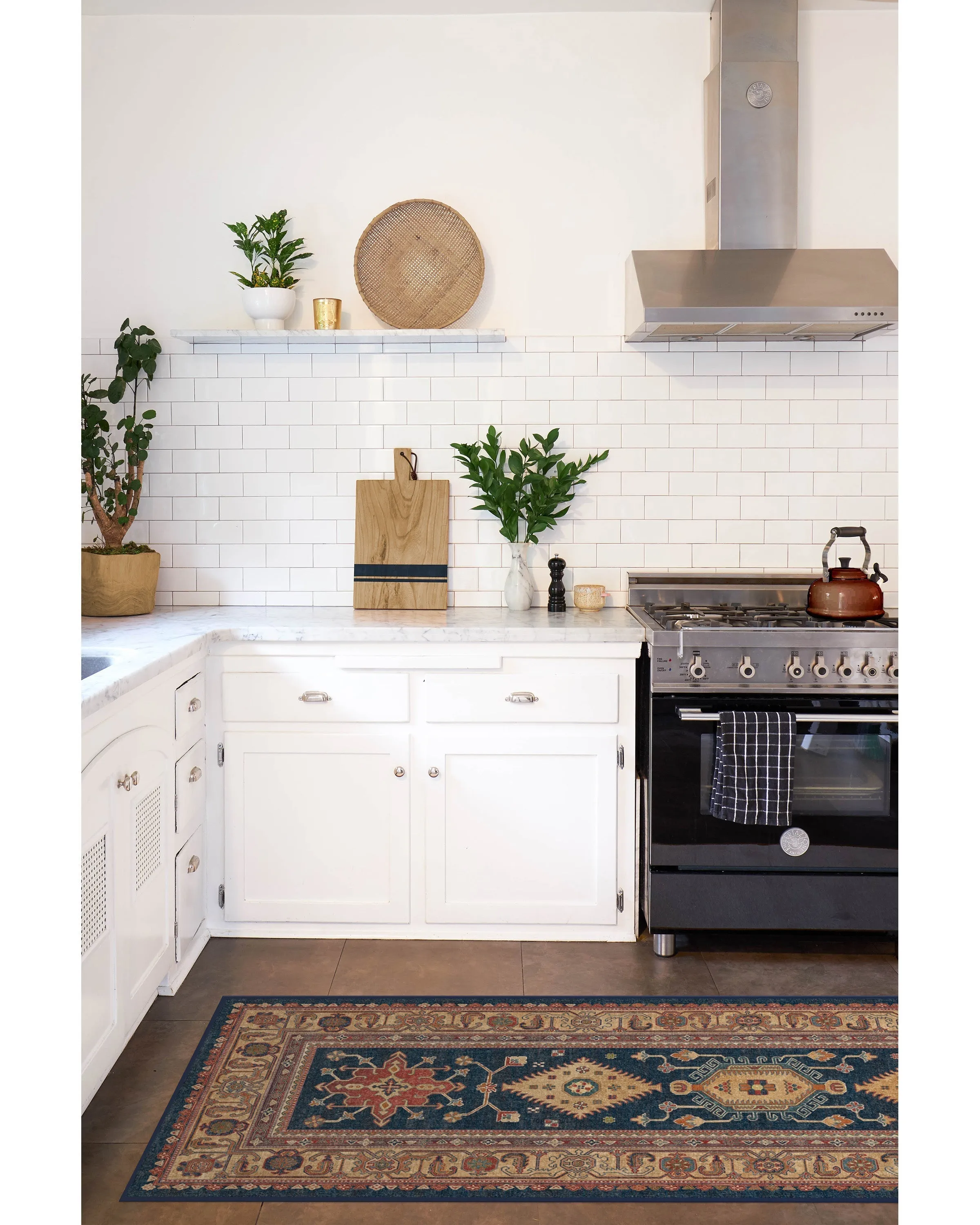 The Cambria Sapphire Rug features an intricate Persian pattern with sapphire blue as the dominant color, accented by rust red, orange, and teal details. Its flatwoven construction provides durability while maintaining a low profile, and the machine washable design offers easy maintenance. The time-honored pattern combines traditional motifs with modern practicality, making it suitable for high-traffic areas. W60 x D90 cm.