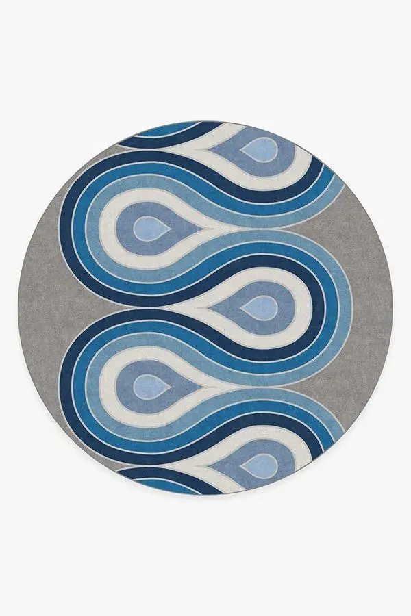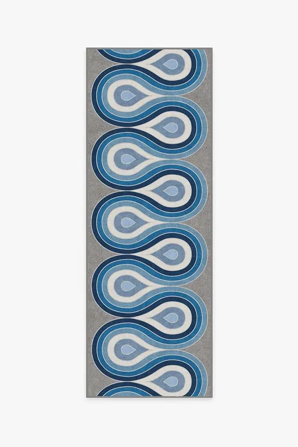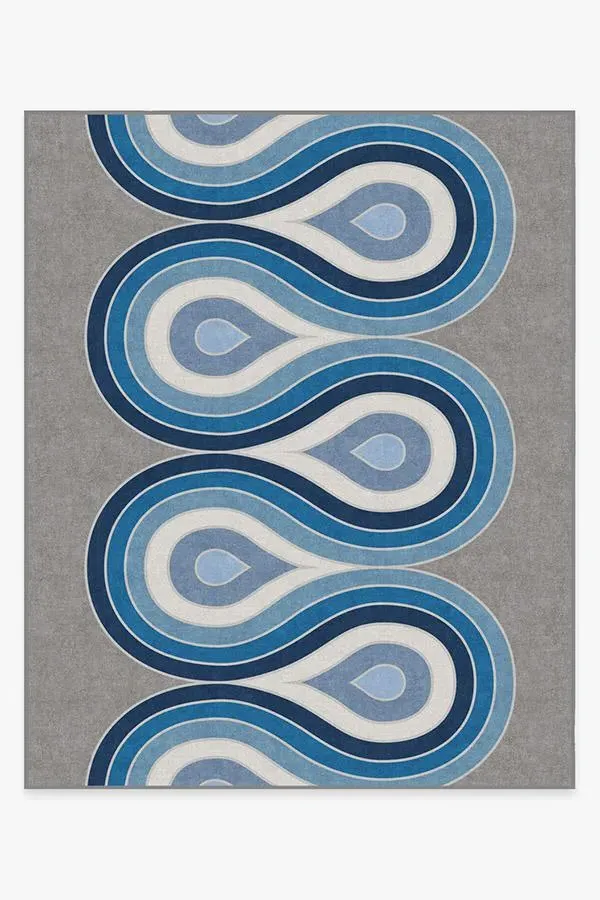 Fun, flowy, and fabulous. This rug features a continuous, multi-layered curve in shades of brilliant blue hues with pops of pearl on a grey background. Water-resistant, stain-resistant, and machine-washable. 60x90 | Machine Washable Area Rug | Kid & Pet Friendly | Indoor Rugs | Milano Blue Steel Flatwoven Rug by Jonathan Adler | Ruggable