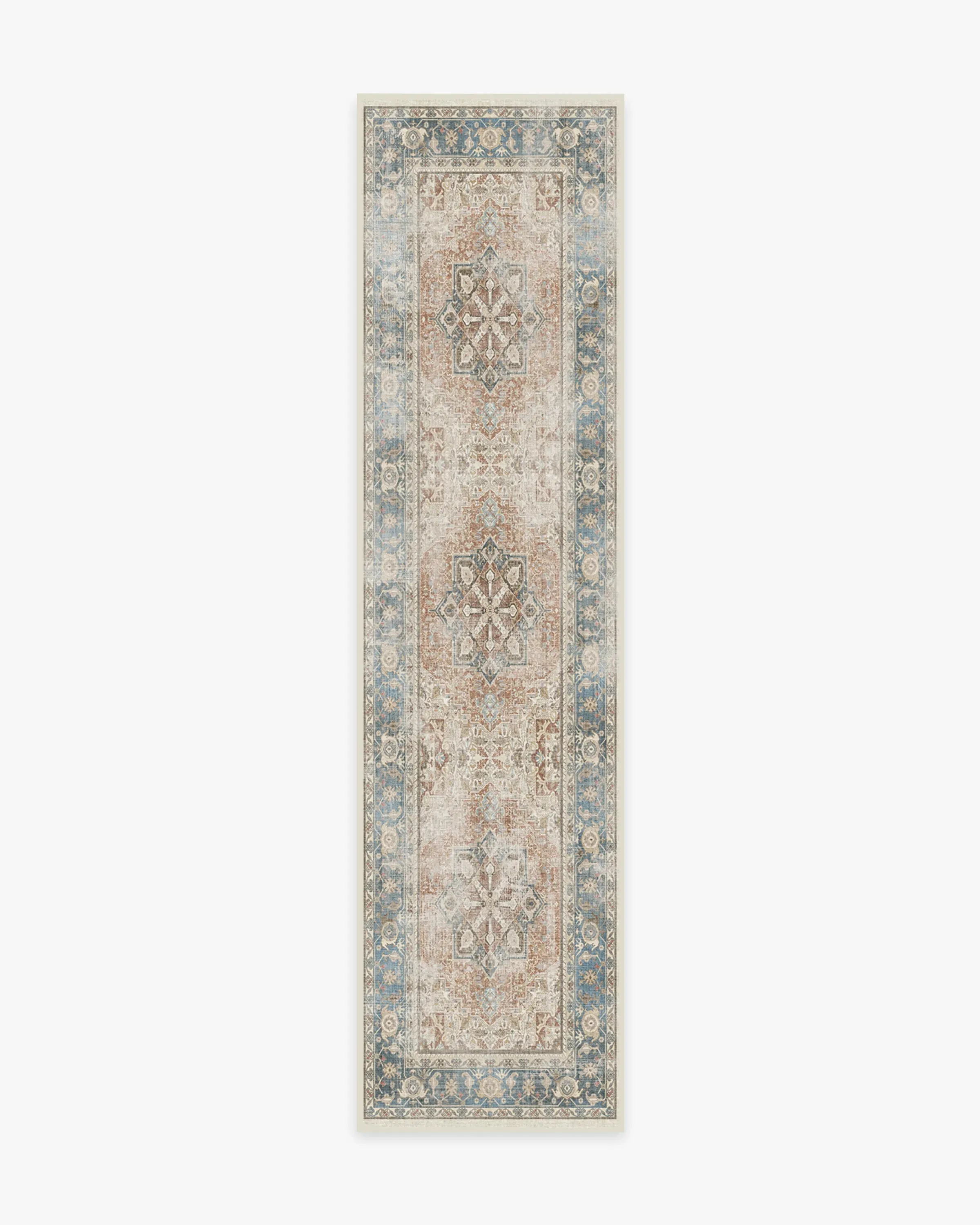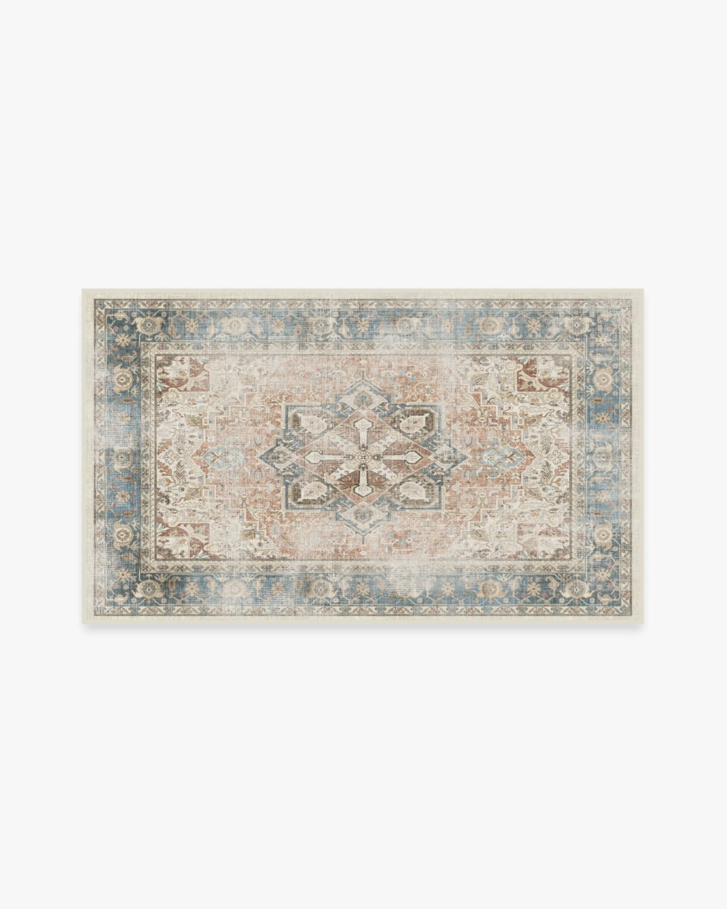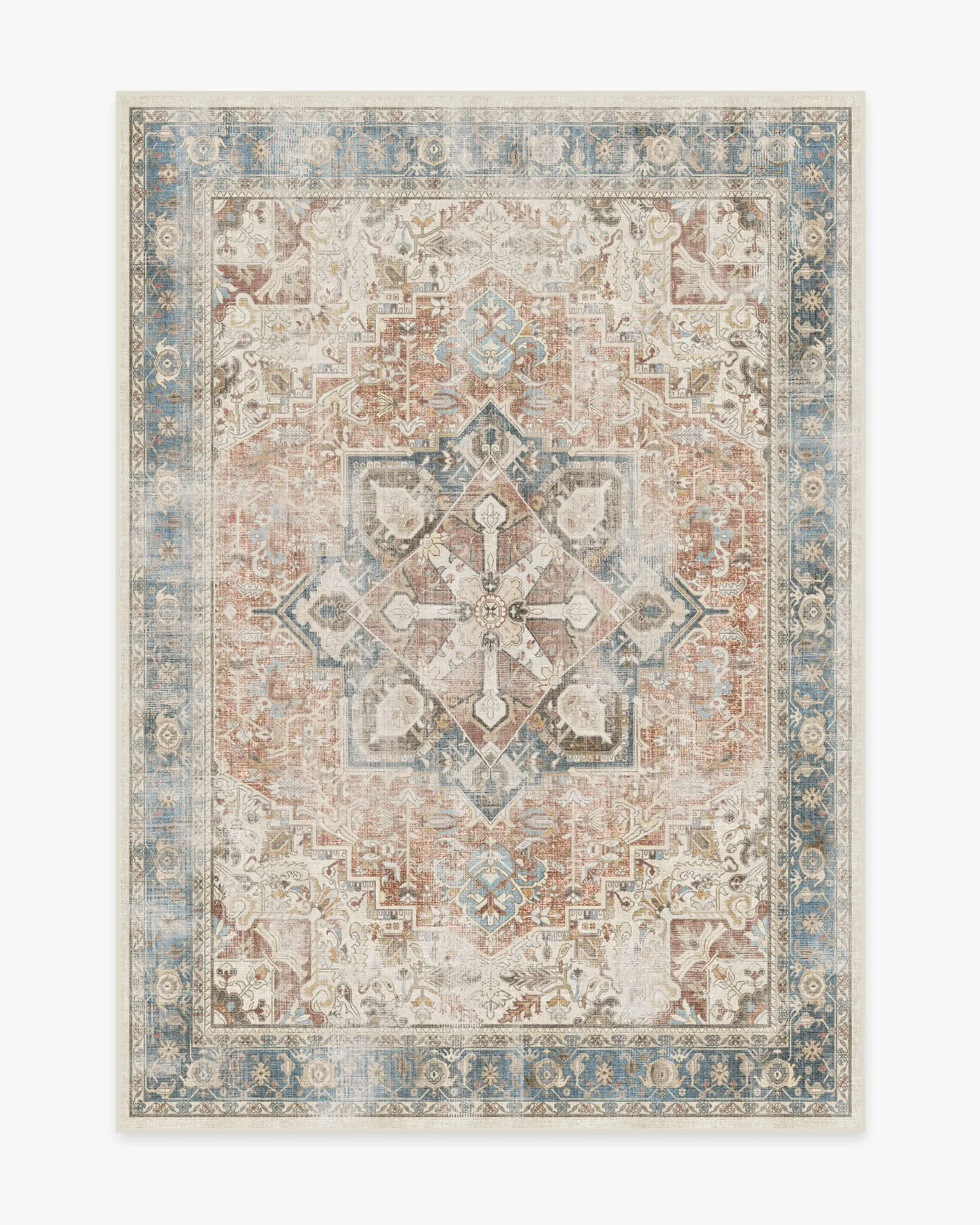 Kamran Coral Rug blends a brilliant palette of sophisticated colors with a classic, Persian-inspired design. Inspired by traditional Heriz rugs, this rug features a bold geometric pattern with a large medallion and ornate border. It's tinted in stone blue and coral red rug, purposefully distressed for that weathered, rustic look. 60x90 | Machine Washable Area Rug | Kid & Pet Friendly | Indoor Rugs | Kamran Coral Rug | Ruggable
