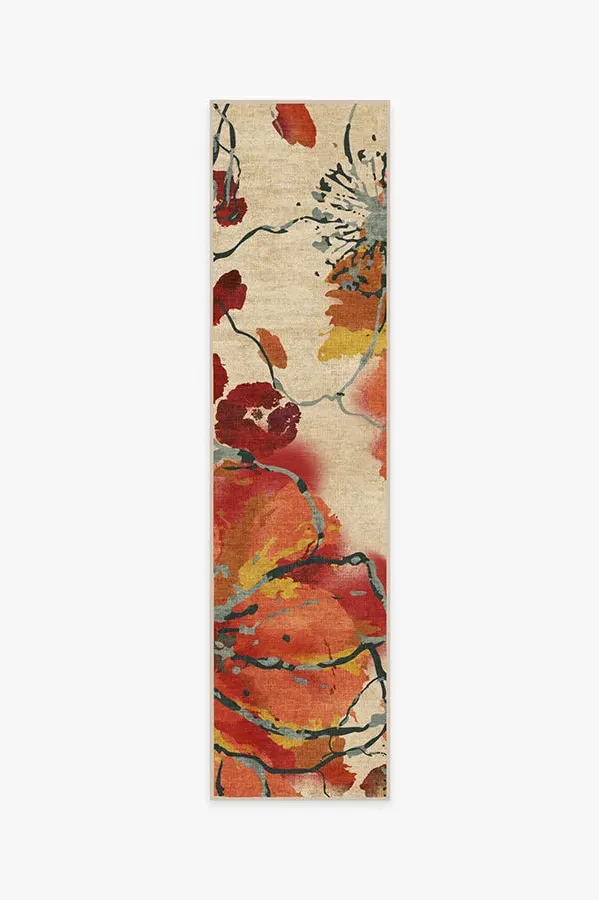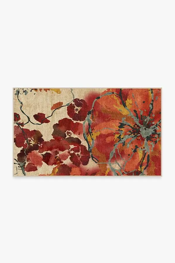 Bring artistic flair to your home's interior with our Watercolor Floral Coral rug. The contemporary floral motif features dramatic brushstrokes of vibrant colors on a canvas of cream and natural peach hues. Add this work-of-art accent piece to complete the look of any contemporary, modern or transitional style room. 60x90 | Machine Washable Area Rug | Kid & Pet Friendly | Indoor Rugs | Watercolour Floral Coral Rug | Ruggable