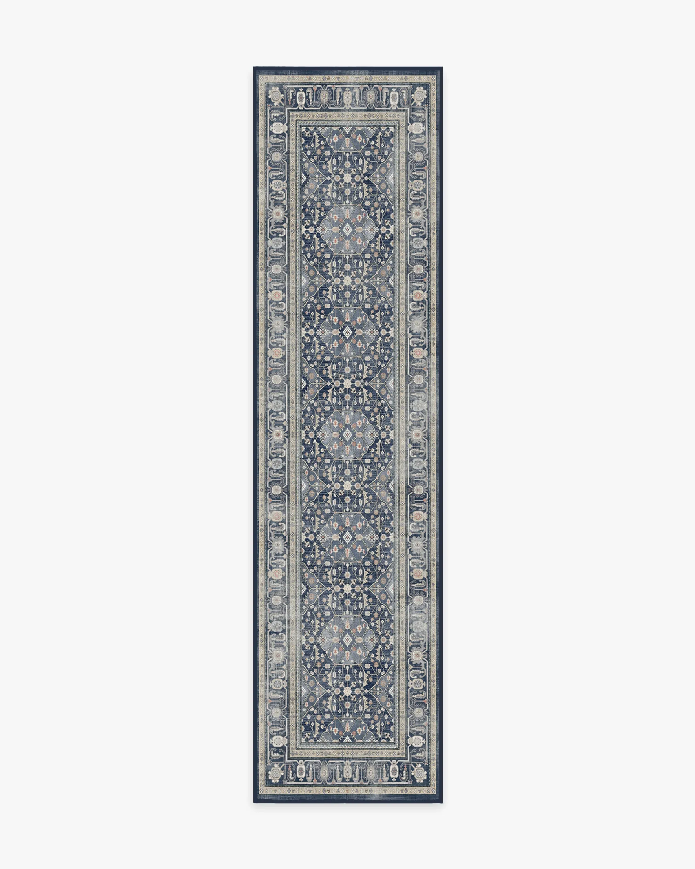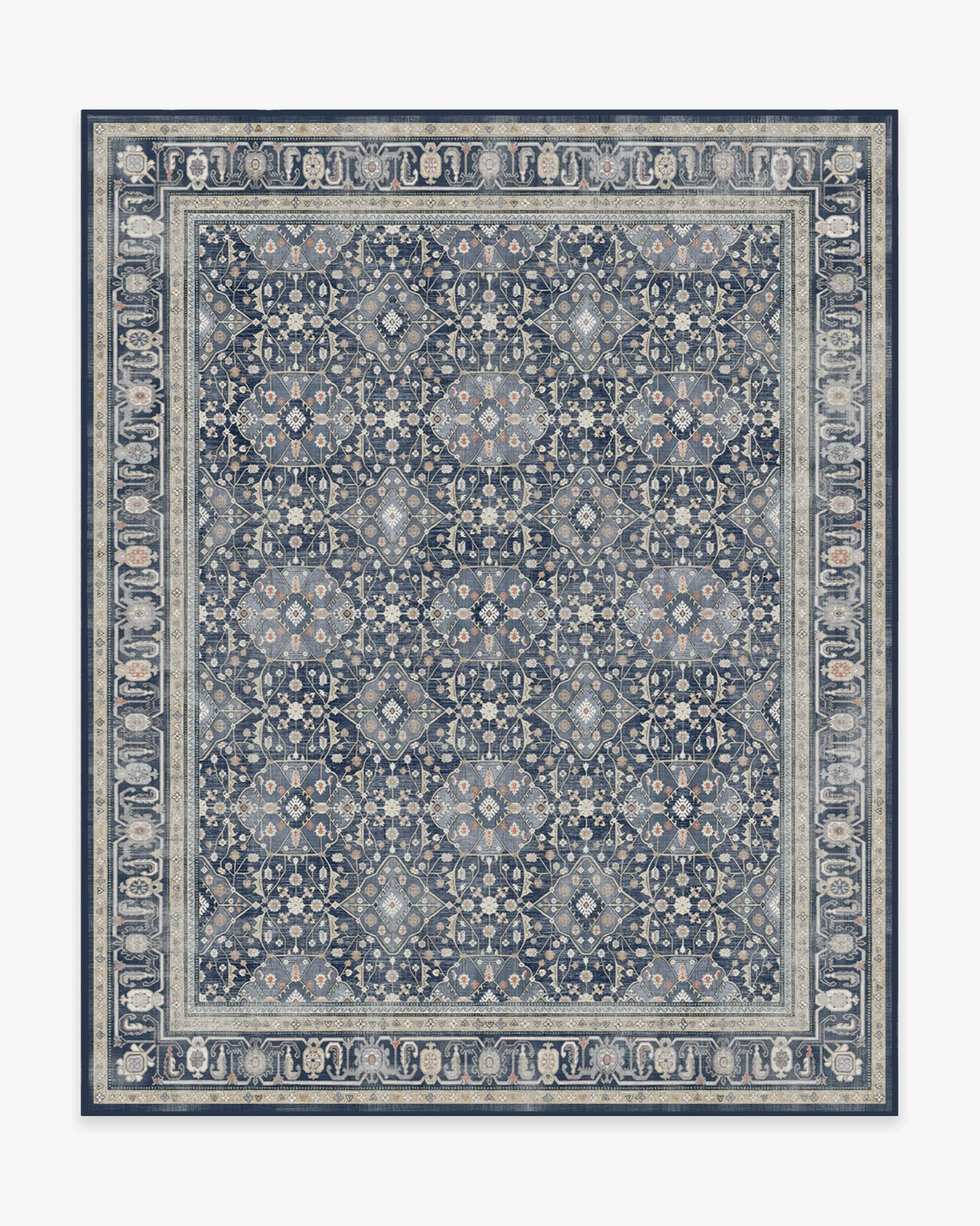 Blue and beautiful. This rug features checkerboarding coloration and a highly decorated border in slate blue with cream and subtle hints of coral. Water-resistant, stain-resistant, and machine-washable. 60x90 | Machine Washable Area Rug | Kid & Pet Friendly | Indoor Rugs | Alessia Dusk Blue Rug | Ruggable