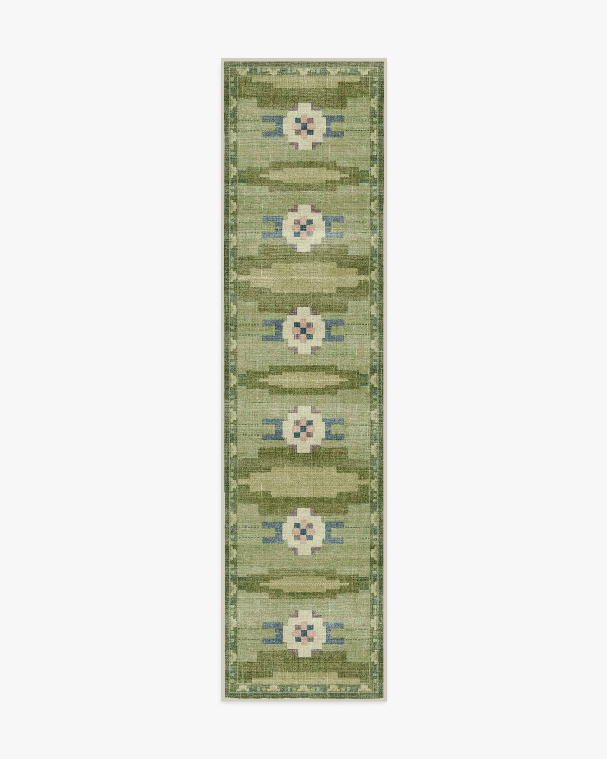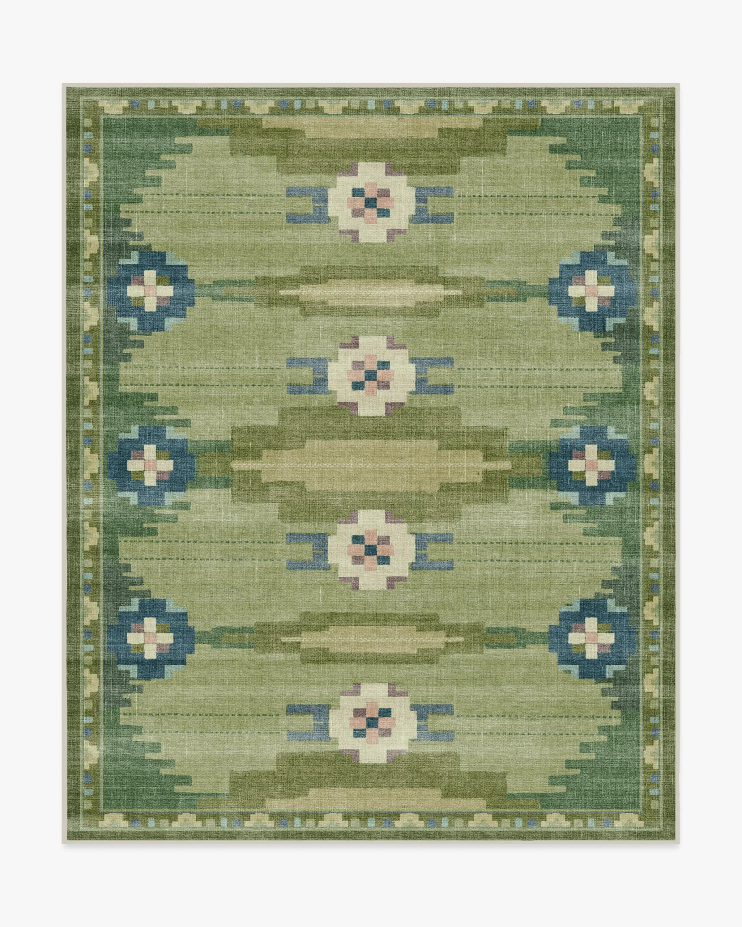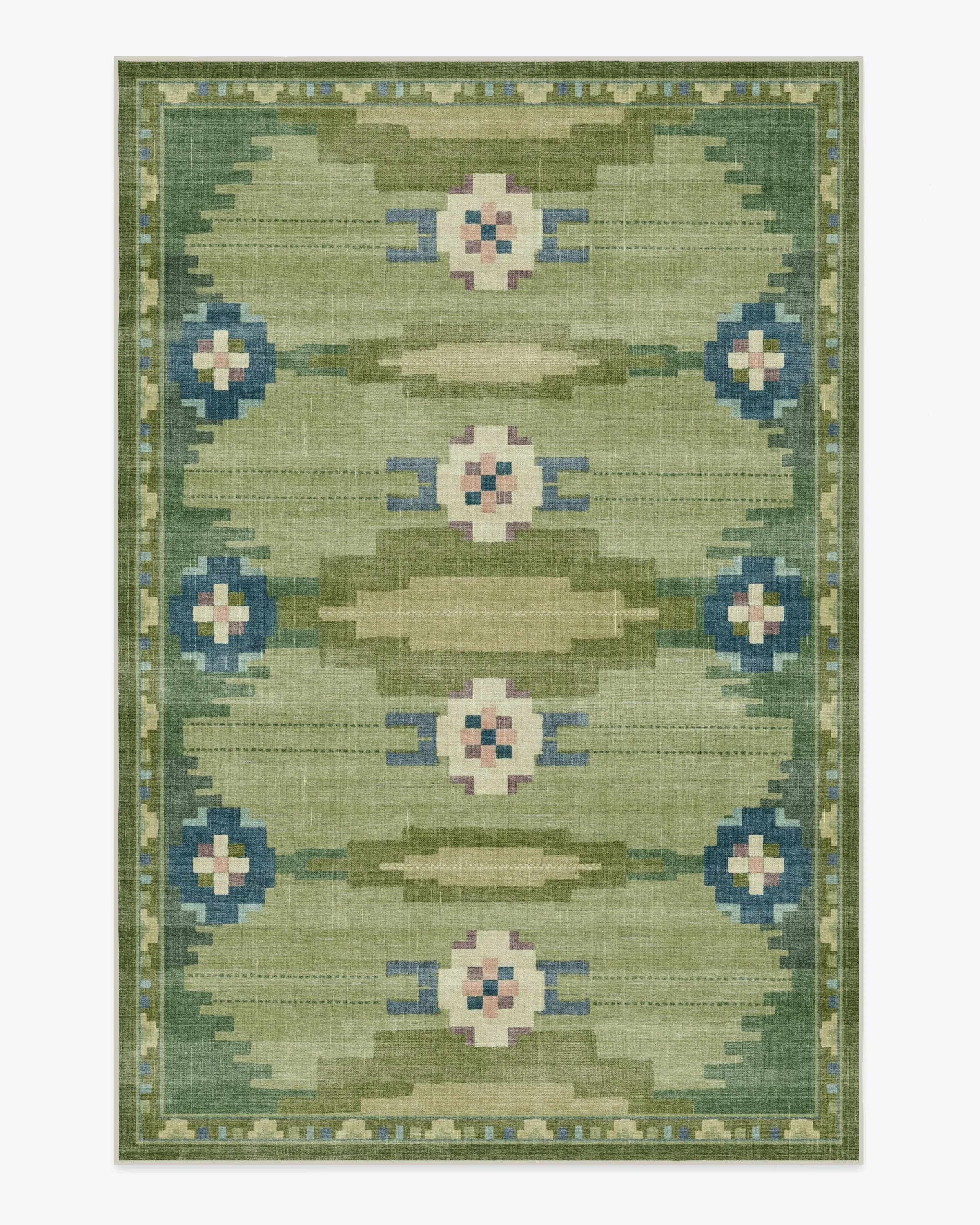 Inspired by the rich heritage of Nordic design, the Annika Green Rug seamlessly blends folk tradition with modern geometric sophistication. A palette of fern greens, antiqued chartreuse, deep blue, and light slate blue is complemented by soft cream, mauve, and pale pink for a balanced look. Water-resistant, stain-resistant, and machine-washable. Colours may vary slightly according to your device and the lighting in your space. 60x90 | Machine Washable Area Rug | Kid & Pet Friendly | Indoor Rugs | Annika Green Rug | Ruggable