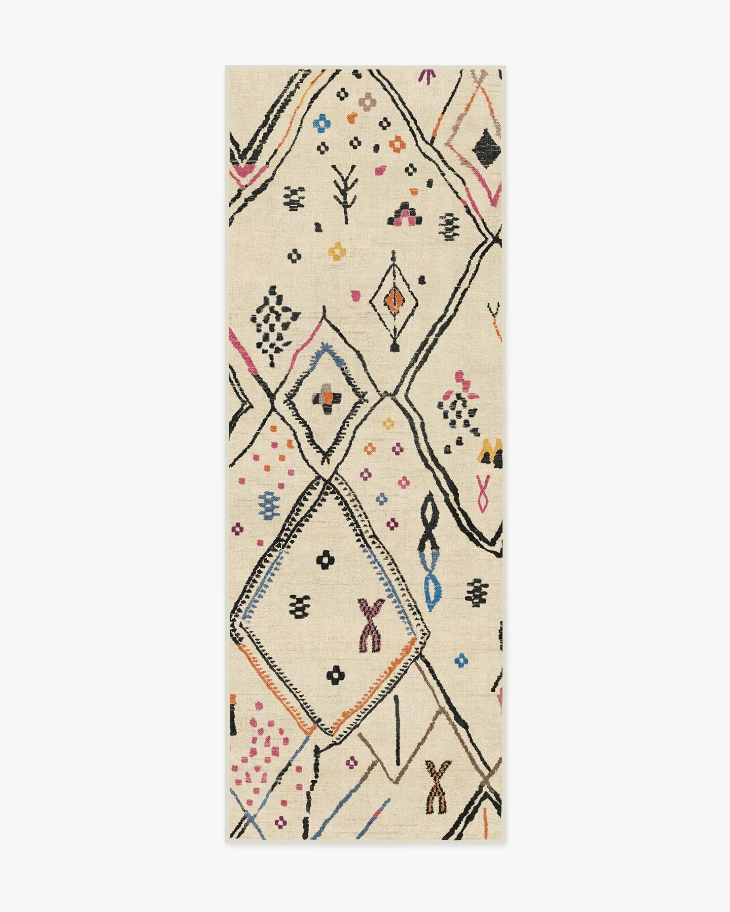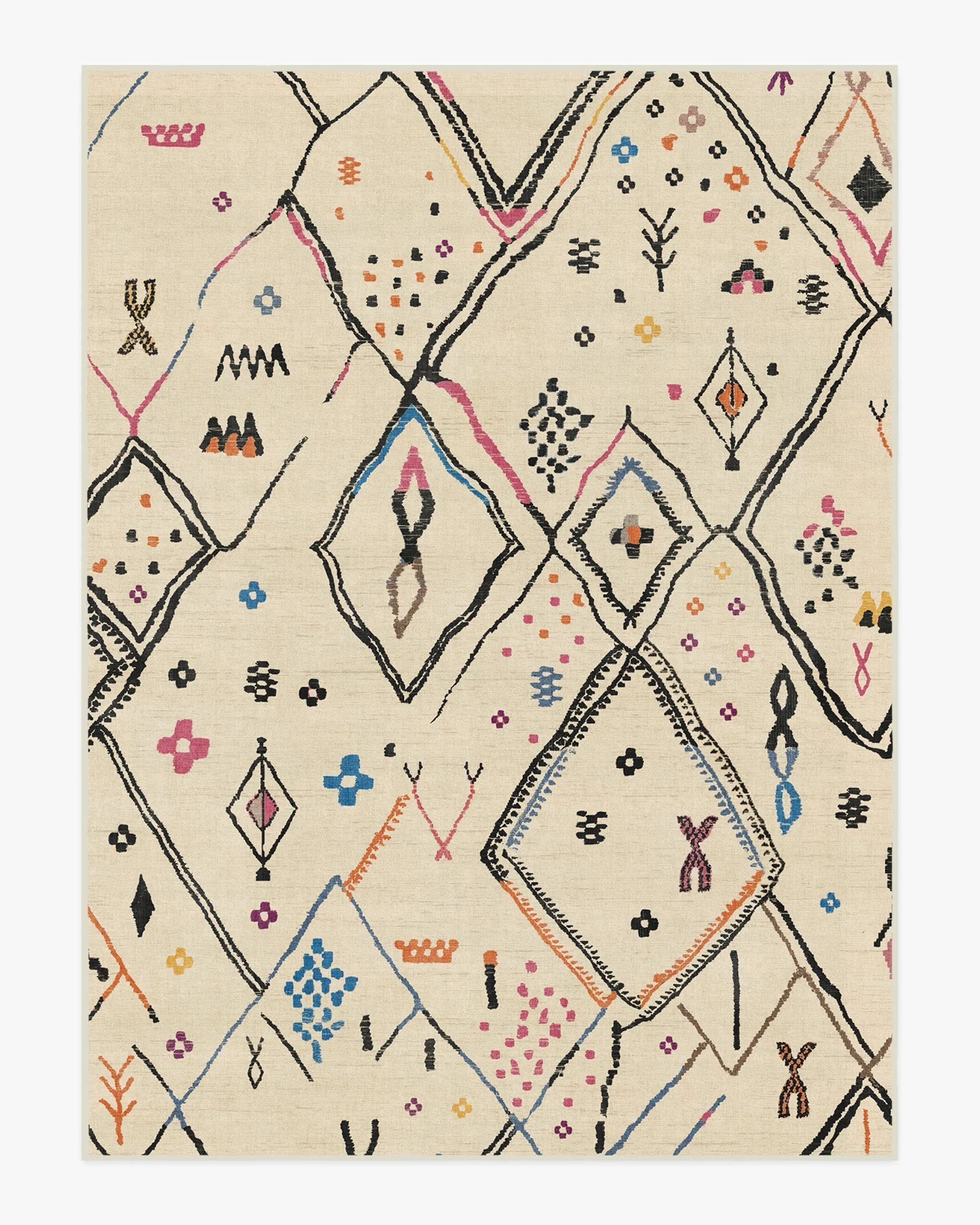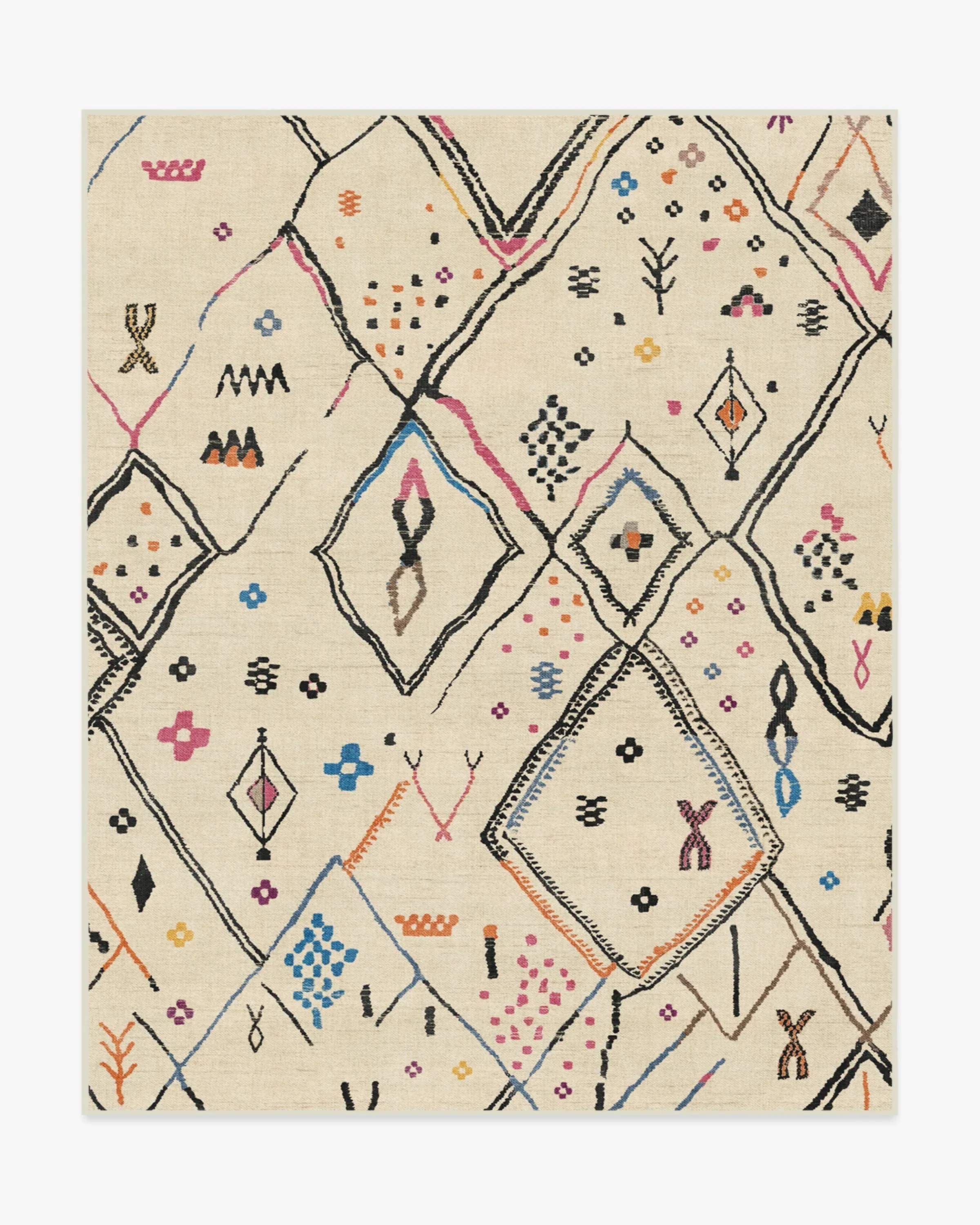 Bring home the vibrant charm of our Pamir Ivory Multicolour Rug. Inspired by Azilal Moroccan designs, this bold style bursts with bright pops of colour. With vivid shades of pinks, electric blues, ochre yellows, and hints of charcoal against a warm cream background, the organic linework provides a homey, hand-woven feel. Water-resistant, stain-resistant, and machine-washable. Rug colours may vary slightly according to your device and the lighting in your space. 60x90 | Machine Washable Area Rug | Kid & Pet Friendly | Indoor Rugs | Pamir Ivory Rug | Ruggable