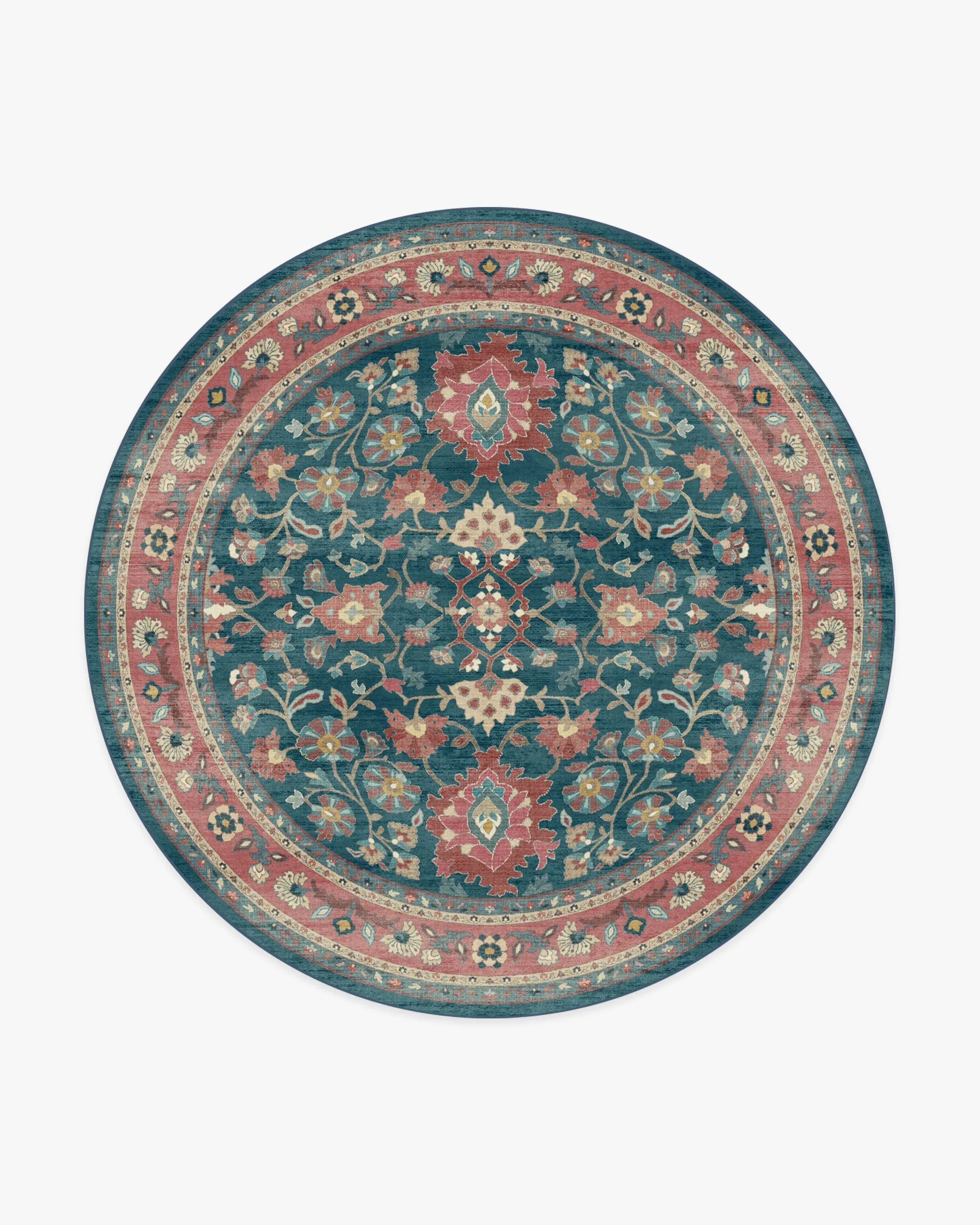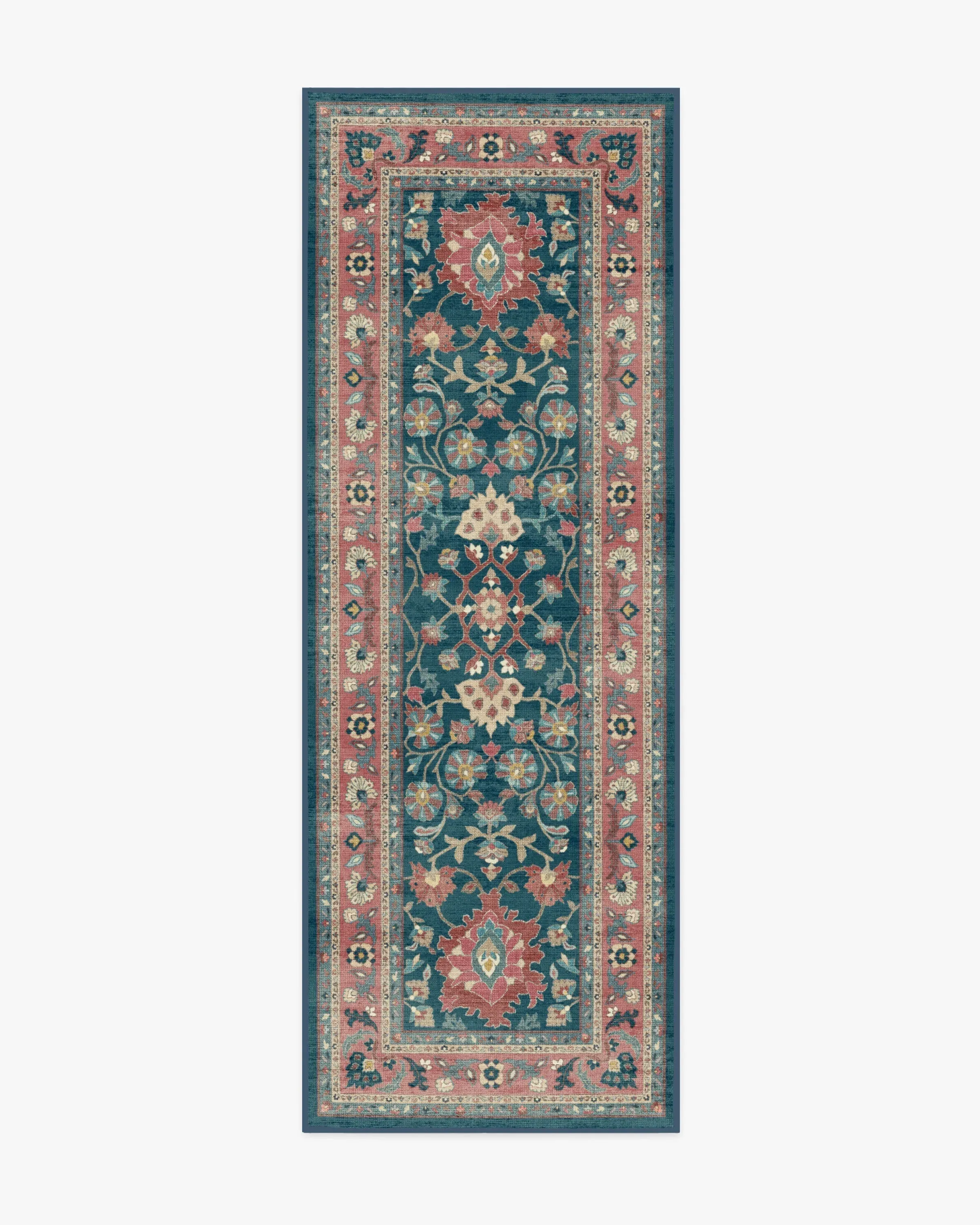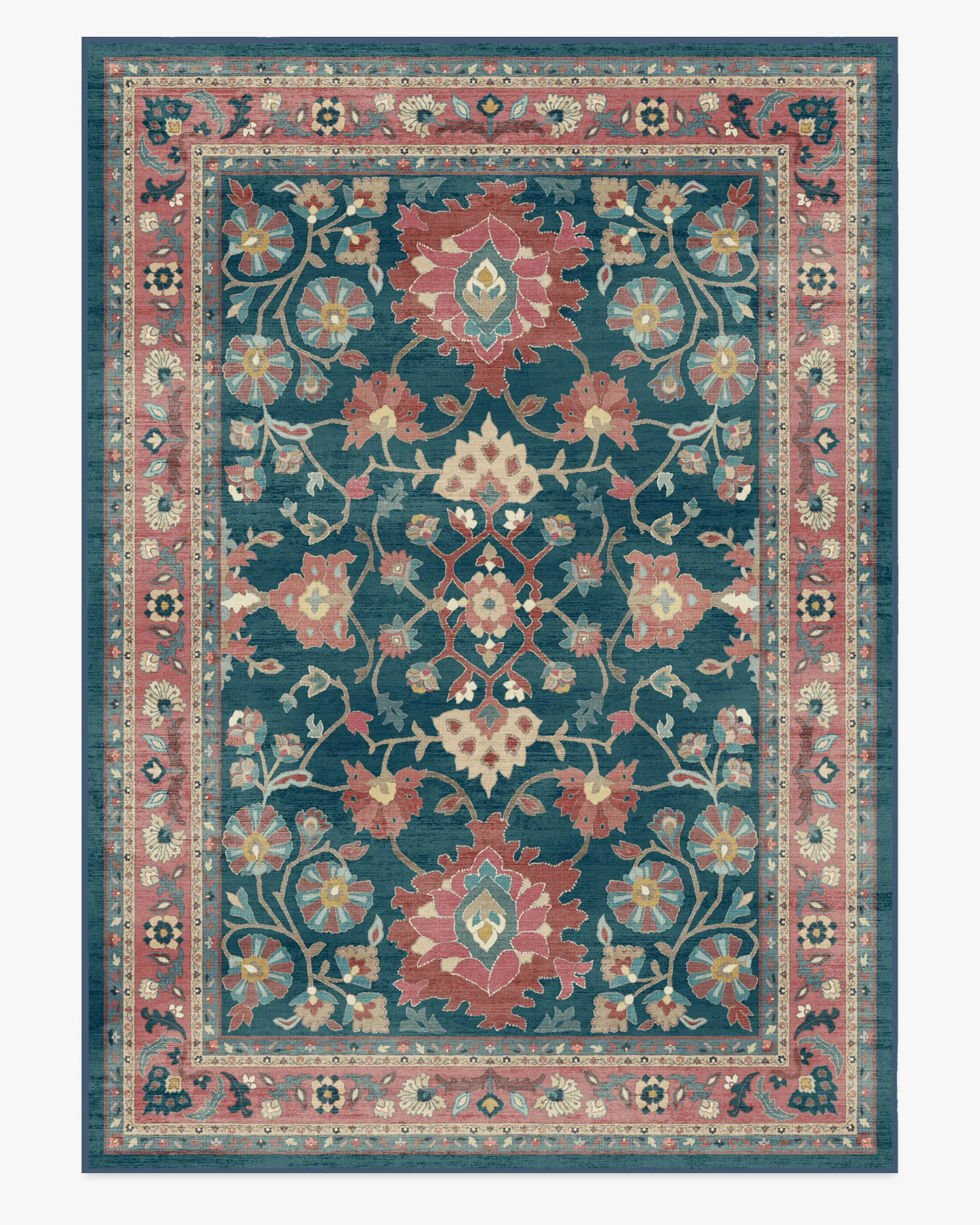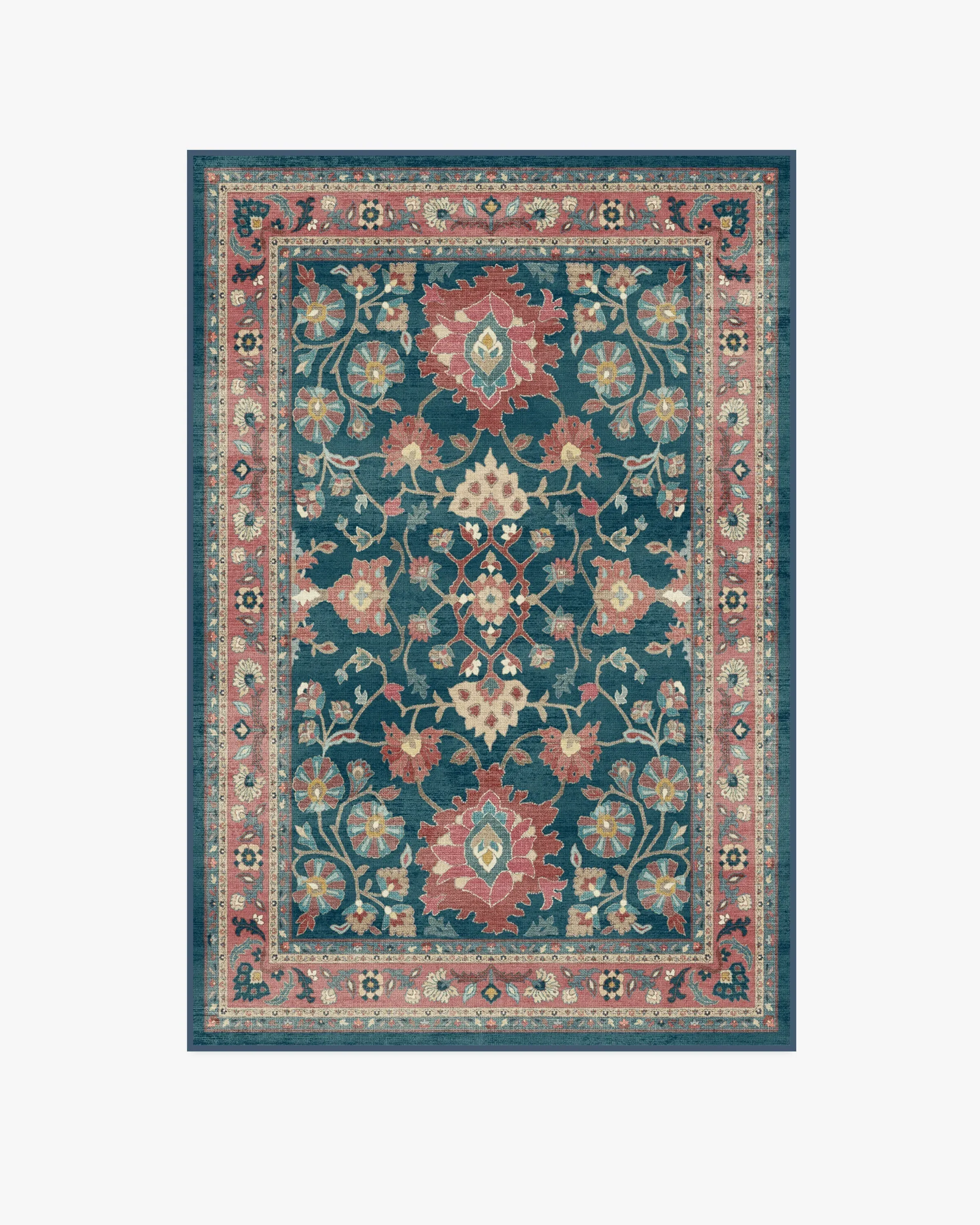 Weave yourself in a timeless tapestry of colour and craft. The Calabria Navy & Cayenne Rug channels vintage Persian elegance with mirrored floral motifs, ornamental borders, and rich needlepoint textures. Deep navy, soft blues, and warm cayenne reds with hints of gold evoke a beautifully aged, storied feel. Water-resistant, stain-resistant, and machine-washable. Colours may vary by device and lighting. 60x90 | Machine Washable Area Rug | Kid & Pet Friendly | Indoor Rugs | Calabria Navy & Cayenne Rug | Ruggable