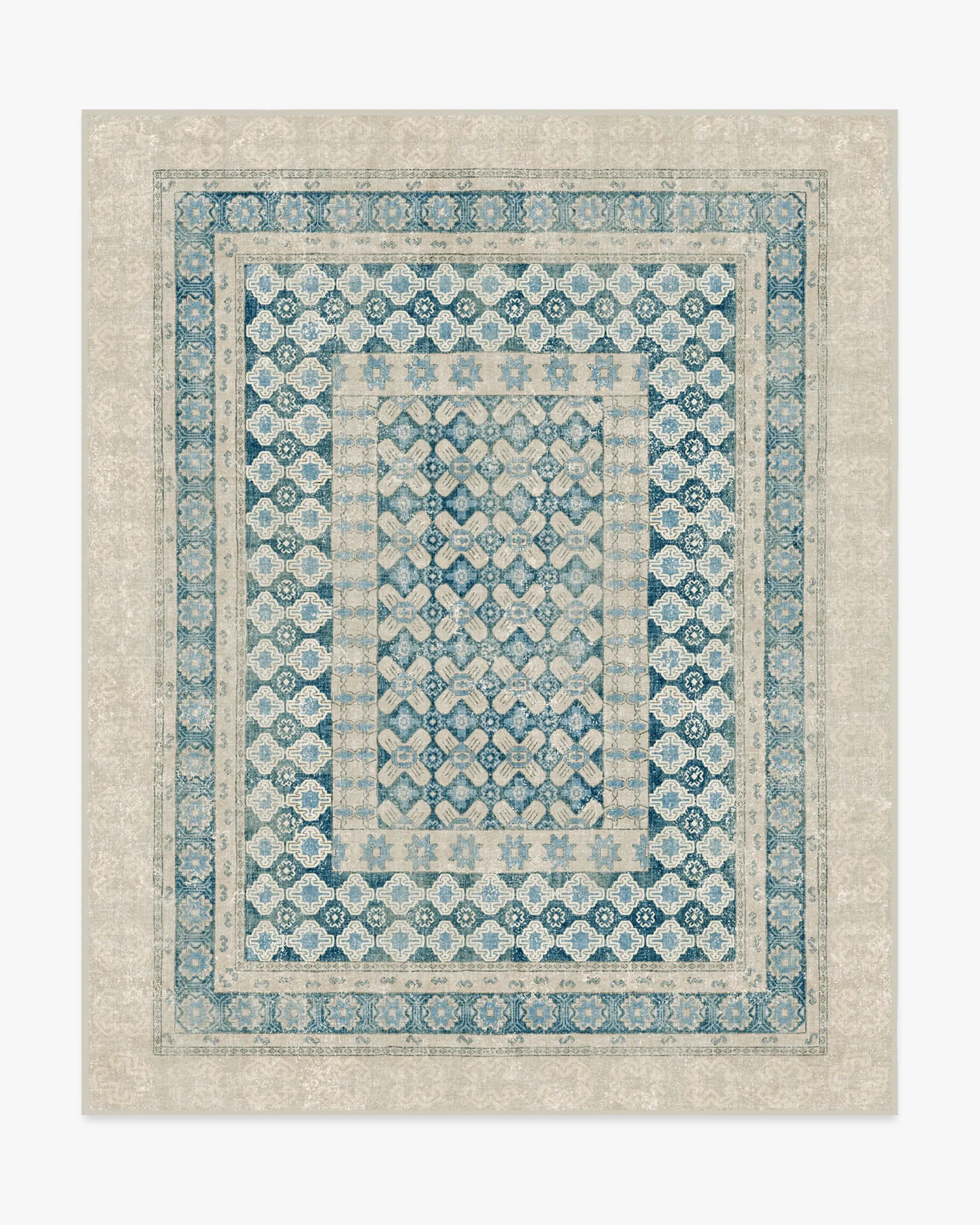 Inspired by European café napkins, our Cyrus Neutral and Blue Rug imparts the distressed feel of artisanal craftsmanship. Its neutral background, coupled with blue linework, creates an inviting atmosphere in any room. Water-resistant, stain-resistant, and machine-washable. Rug colours may vary slightly according to your device and the lighting in your space. 60x90 | Machine Washable Area Rug | Kid & Pet Friendly | Indoor Rugs | Cyrus Neutral and Blue Rug | Ruggable