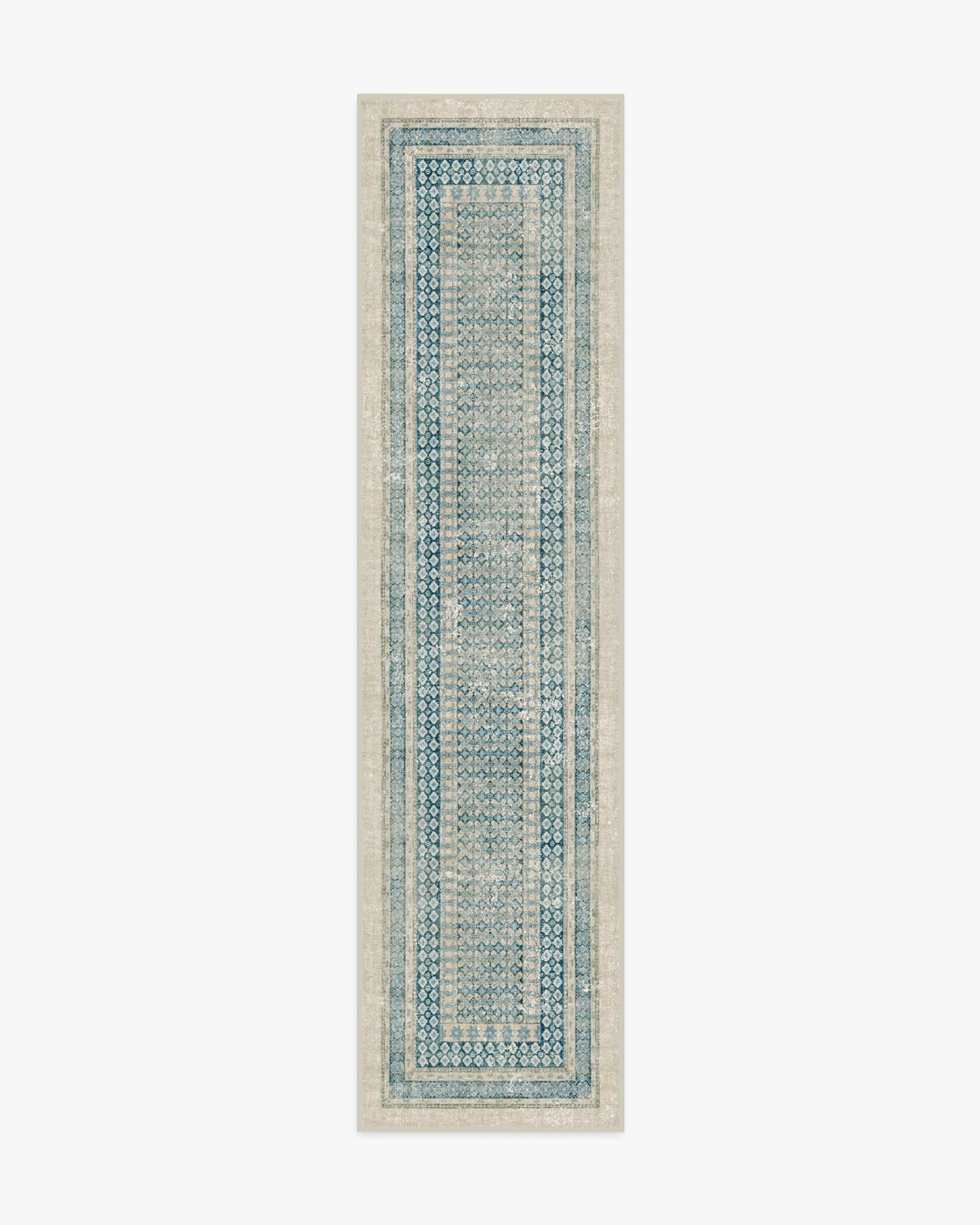 The Cyrus rug offers artisanal craftsmanship with its distressed European café napkin-inspired design. Its neutral background features blue linework detailing, while the water-resistant and stain-resistant construction provides practical durability. The machine-washable fabric ensures easy maintenance for busy households. W60 x D90 cm