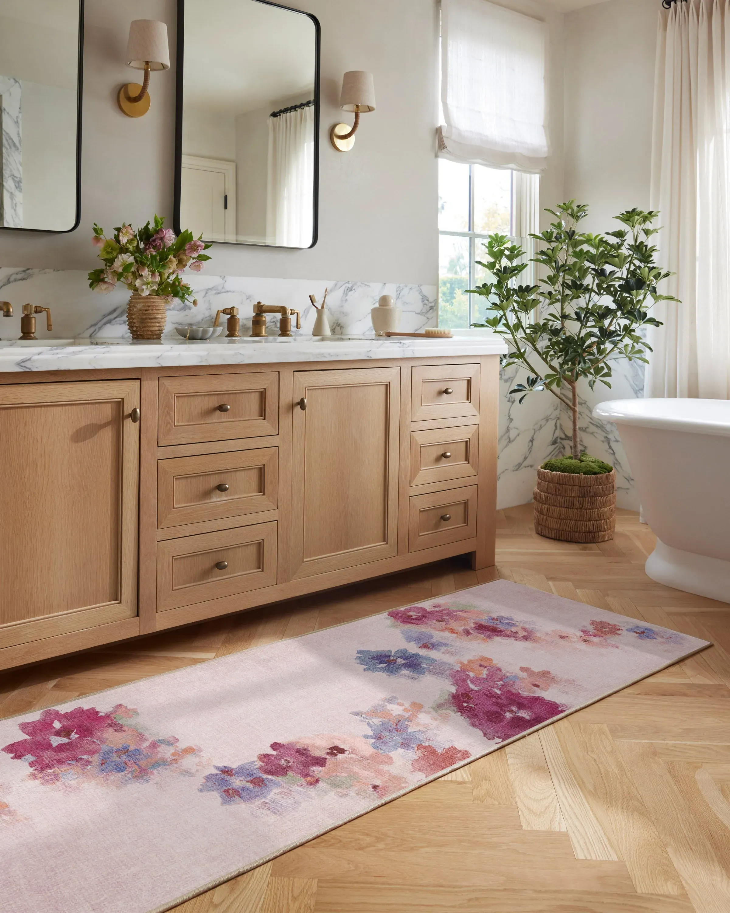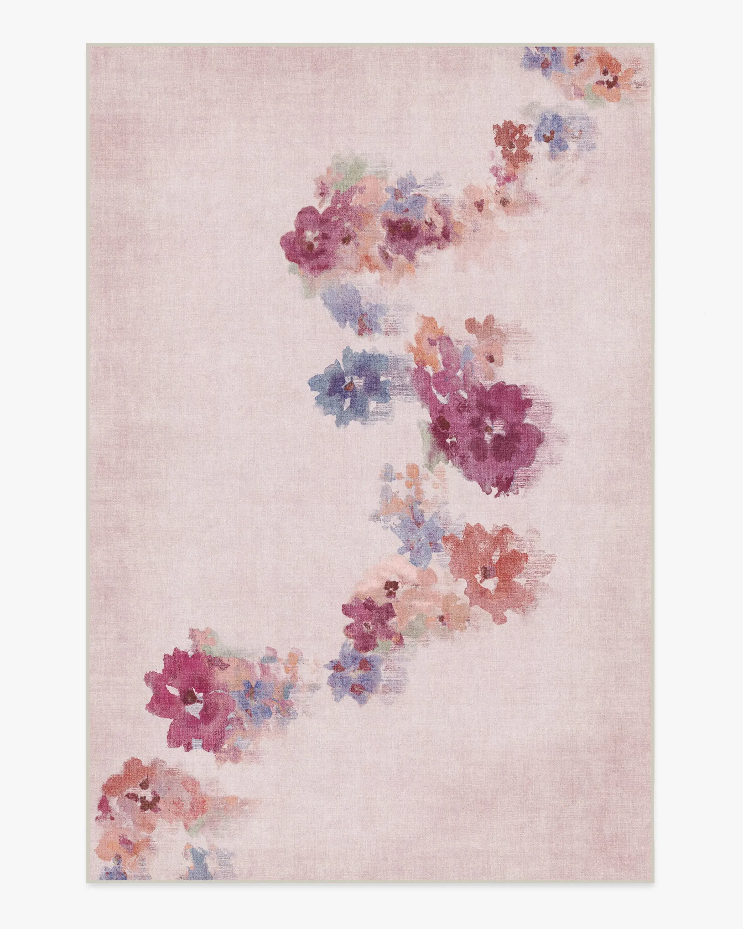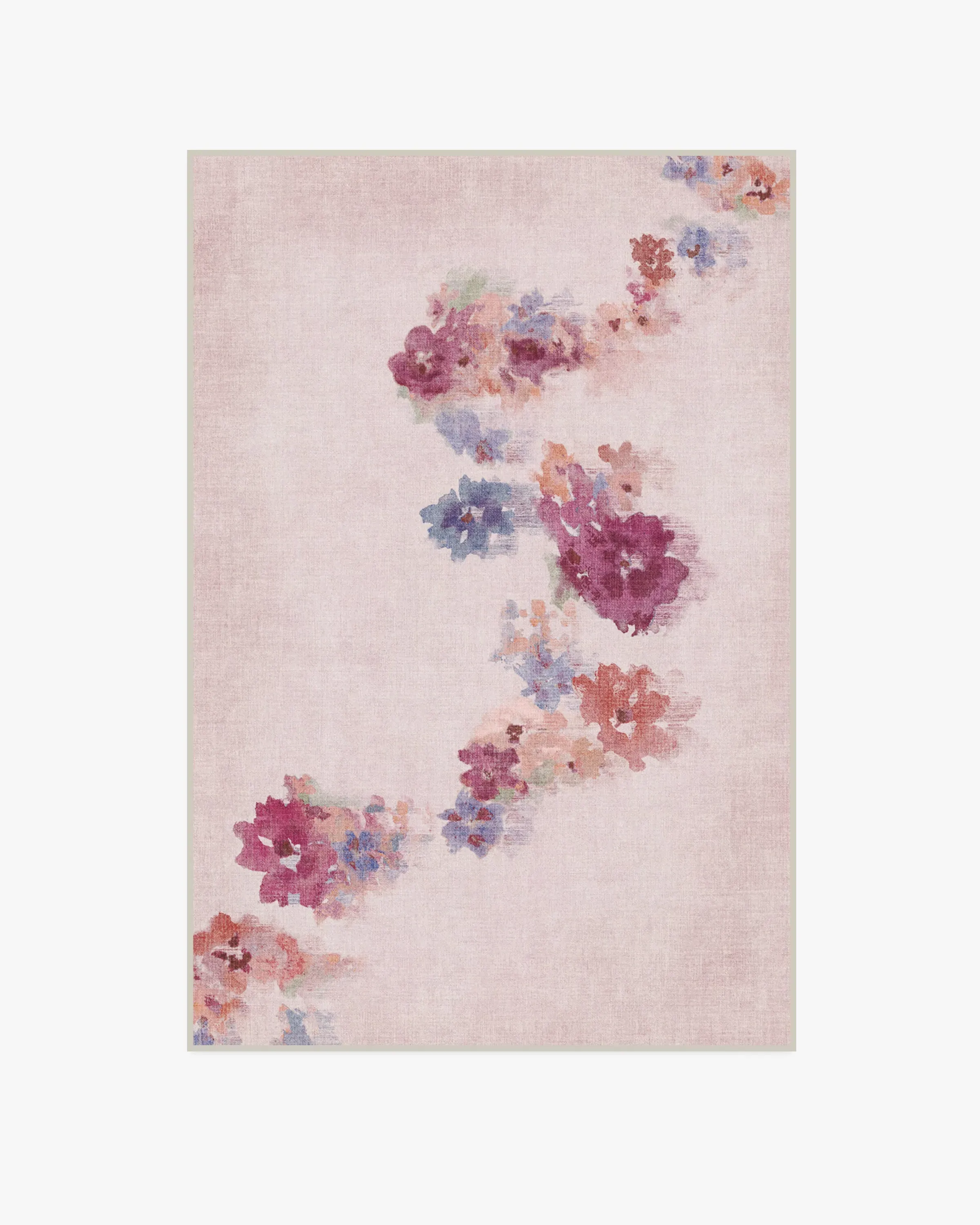Inspired by the dreamlike beauty of blooming flowers, our Clara Soft Rose Rug design features an impressionistic watercolor effect, where soft floral shapes flow from north to south. The soft mauve pink background is delicately complemented by floral pops of lavender, light coral, and light burgundy. Water-resistant, stain-resistant, and machine-washable. Rug colours may vary slightly according to your device and the lighting in your space. 60x90 | Machine Washable Area Rug | Kid & Pet Friendly | Indoor Rugs | Clara Soft Rose Flatwoven Rug Pink | Ruggable