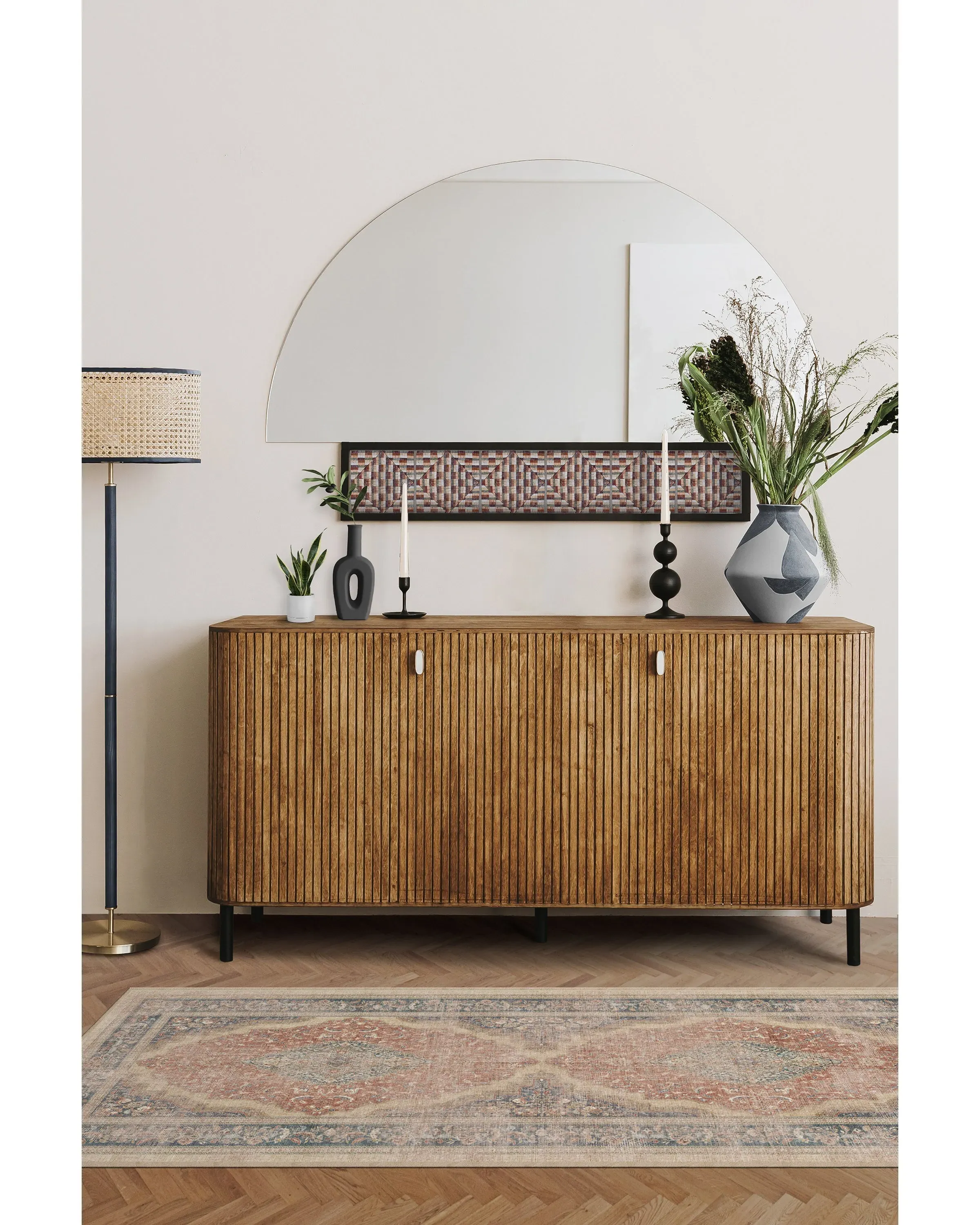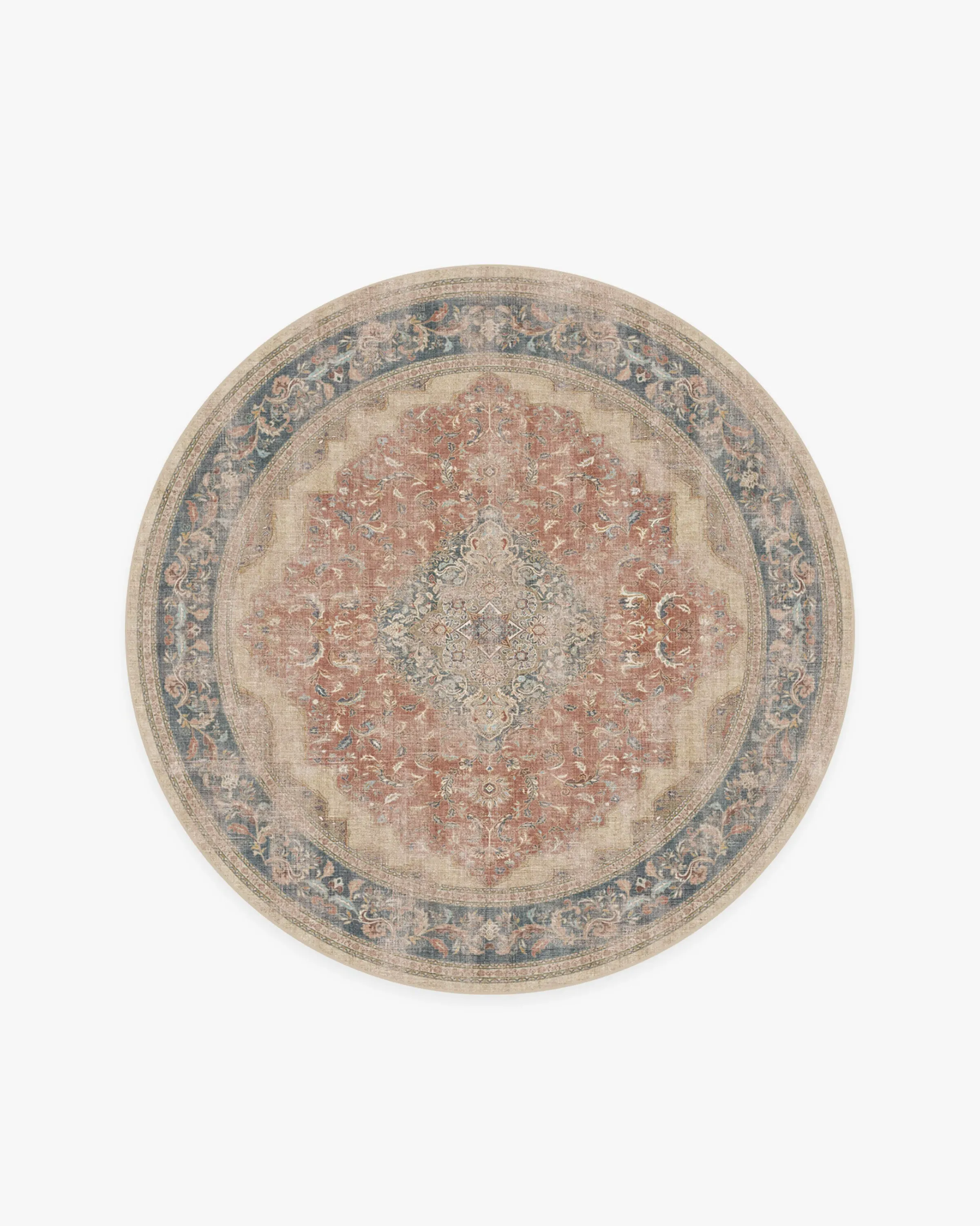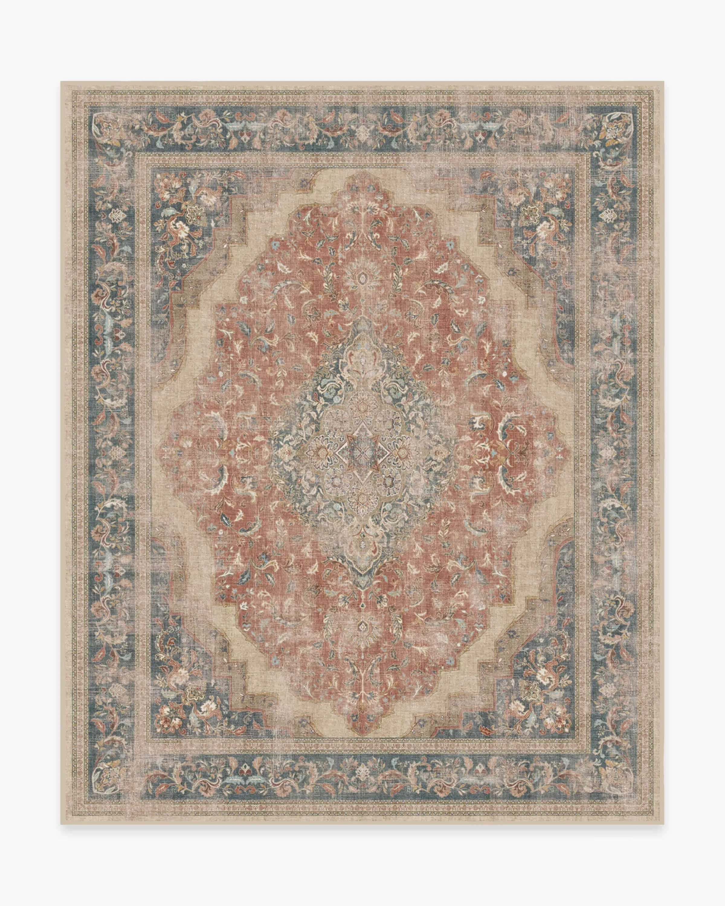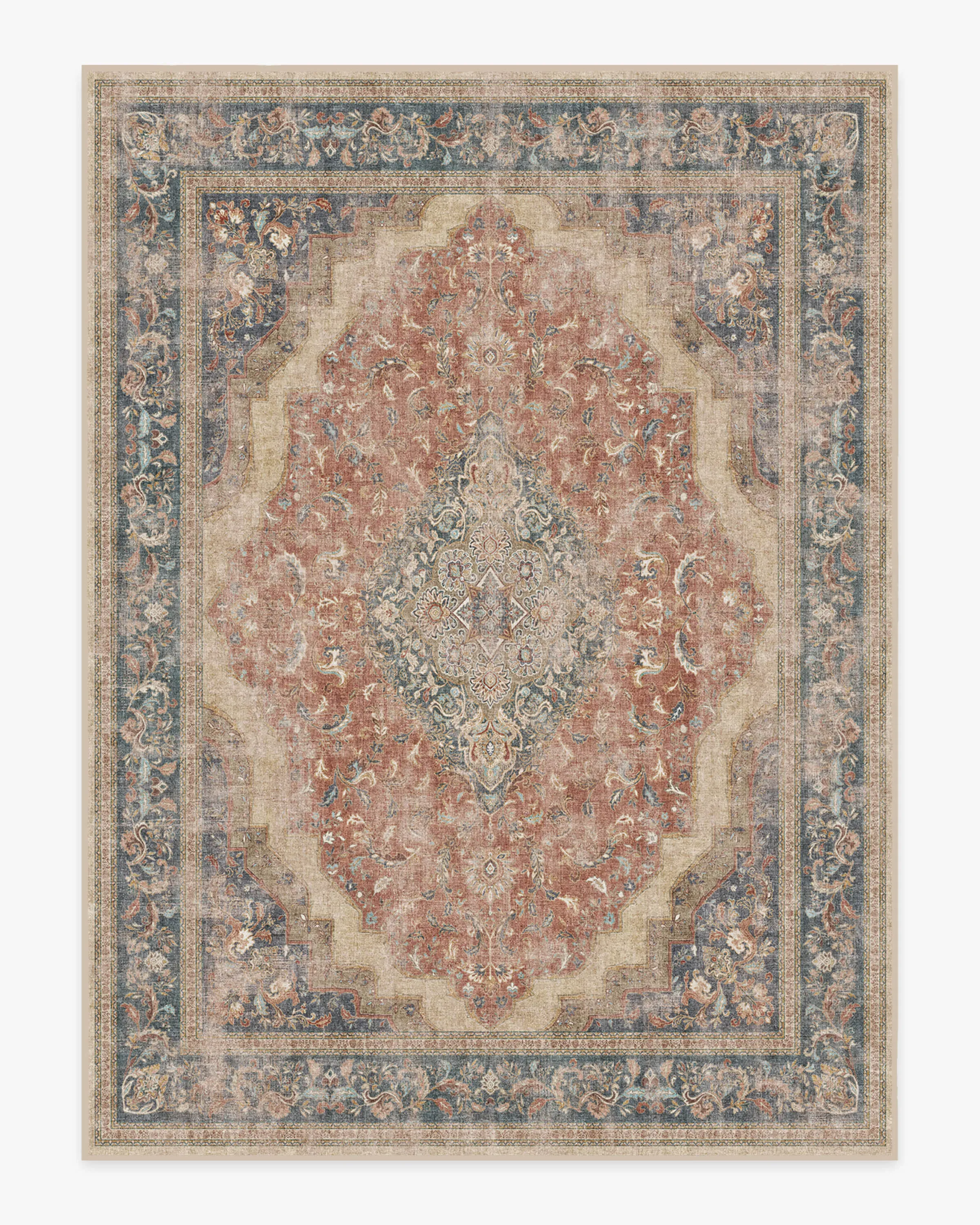 Inspired by classic European rug patterns, our Adeline Antique Red Rug features a gently distressed diamond medallion with ornate corners and borders in muted shades of green, red, and beige. Made from our water-resistant, stain-resistant, and machine-washable low-pile Chenille material. 60x90 | Machine Washable Area Rug | Kid & Pet Friendly | Indoor Rugs | Adeline Antique Red Flatwoven Rug | Ruggable