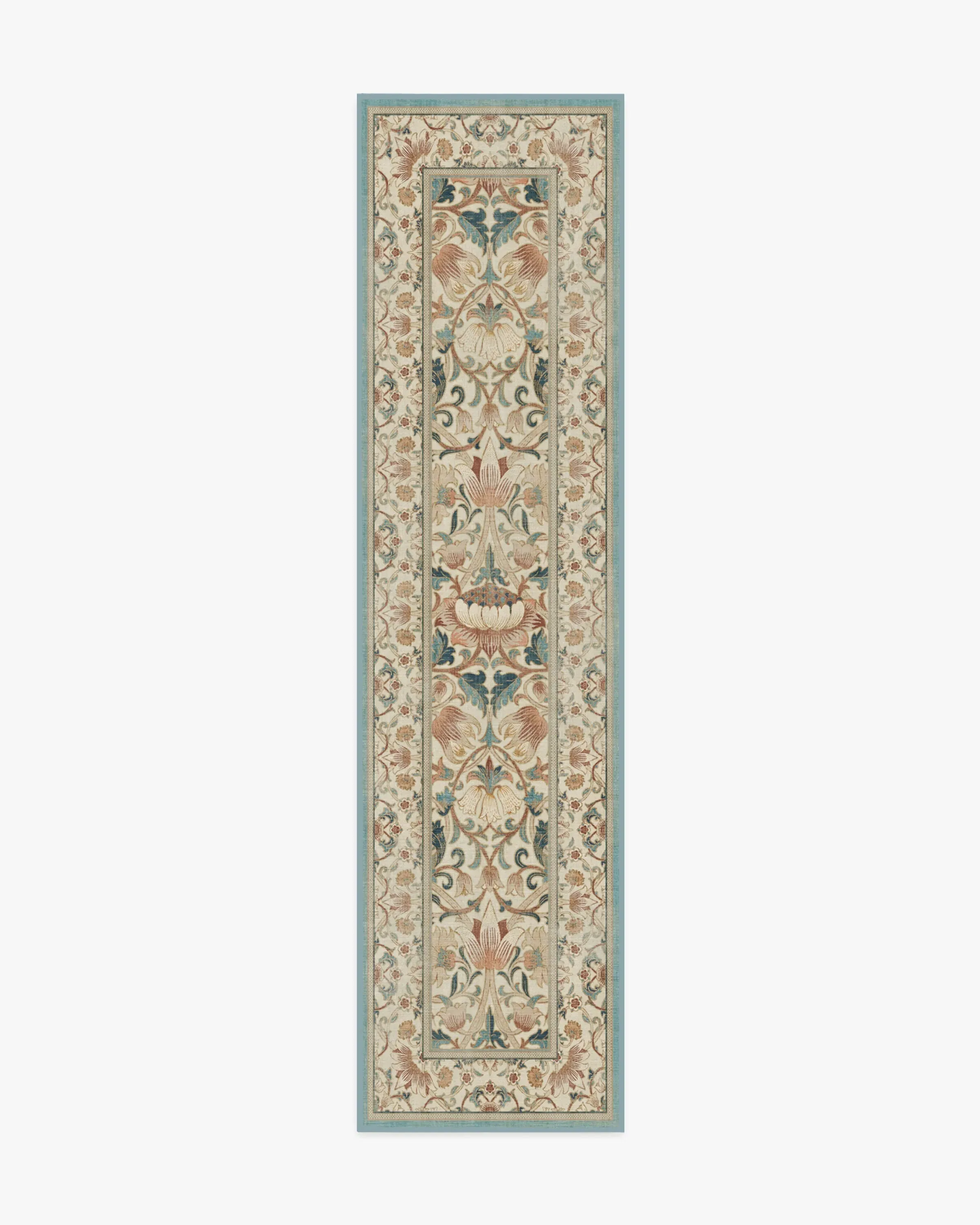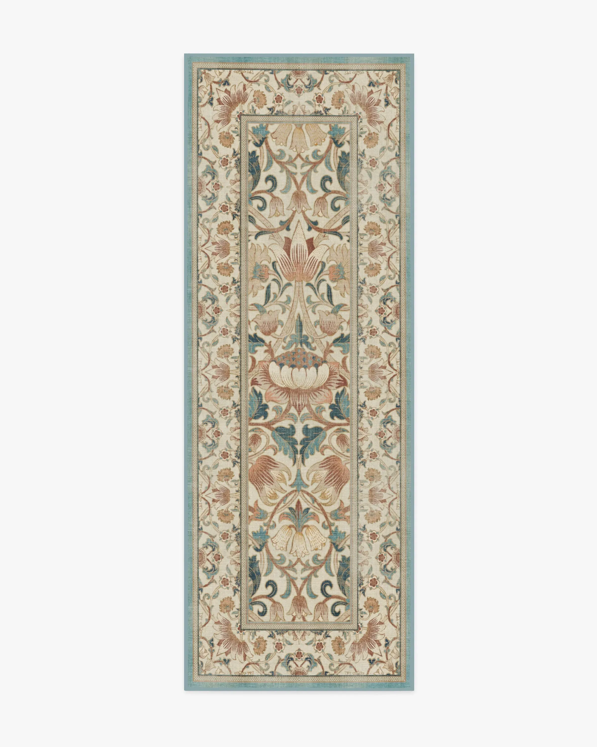 Enjoy life in full bloom with our Morris & Co. Lodden Soft Rose & Teal Rug. This fresh depiction of a classic William Morris design adds decadence to any room with its rich textures and golden hues. The intertwining florals expand from a central bloom, anchoring the composition in natural beauty. Teal blue and soft pink blooms layer on top of a classic cream background for an antique colour palette. Water-resistant, stain-resistant, and machine-washable. Rug colours may vary slightly according to your device and the lighting in your space. 60x90 | Machine Washable Area Rug | Kid & Pet Friendly | Indoor Rugs | Lodden Soft Rose & Teal Rug by Morris & Co. | Ruggable