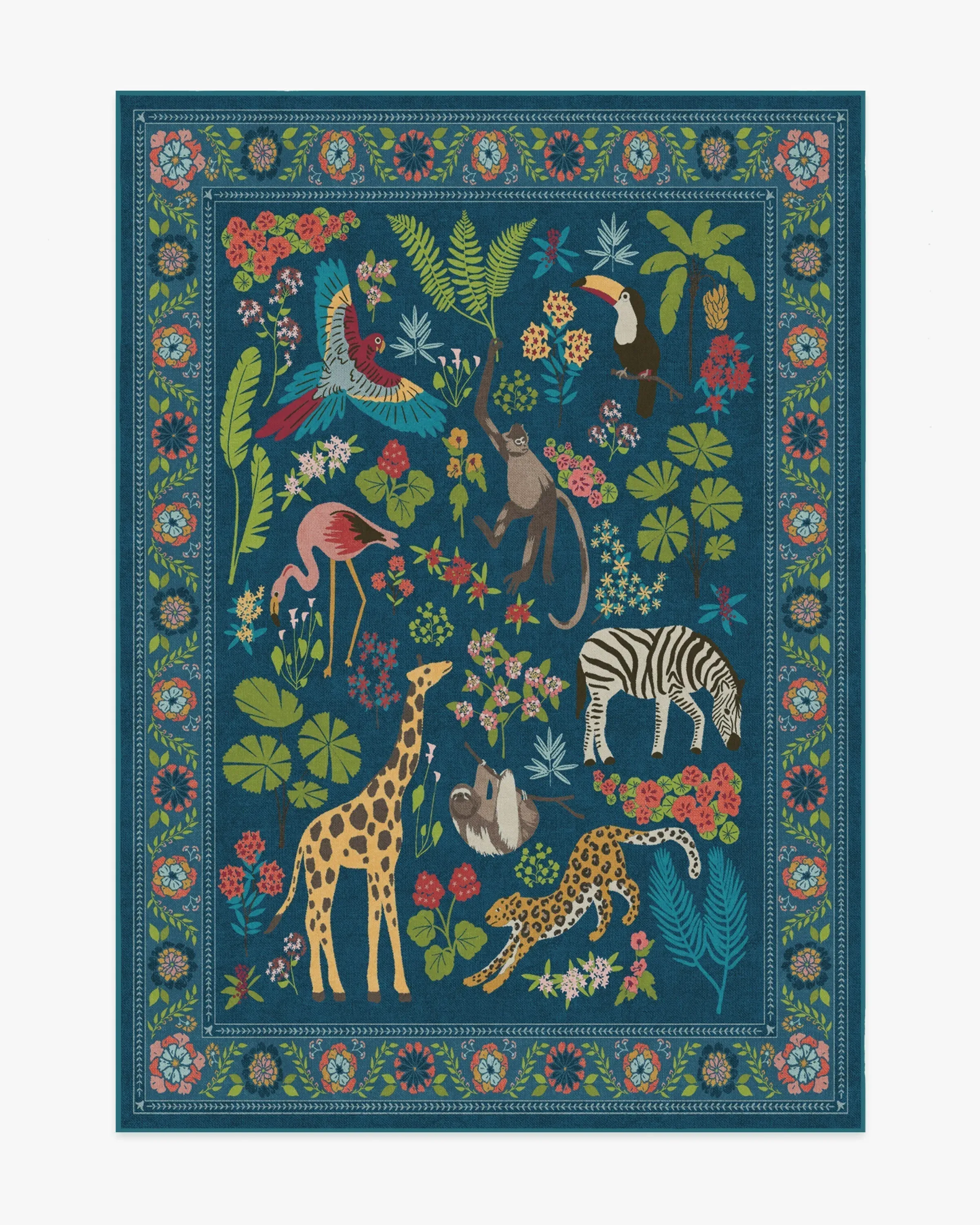 Dare to be iconic with our Iris Apfel Jingle Jungle Royal Blue Rug. Inspired by Iris' adventurous spirit, this wildlife-filled design features exotic animals roaming among lush foliage. A vivid colour palette with splashes of yellow, bright blue, green, cool pink, and beige pops against a royal blue background. Water-resistant, stain-resistant, and machine-washable. Rug colours may vary slightly according to your device and the lighting in your space. 60x90 | Machine Washable Area Rug | Kid & Pet Friendly | Indoor Rugs | Jingle Jungle Royal Blue Rug by Iris Apfel | Ruggable