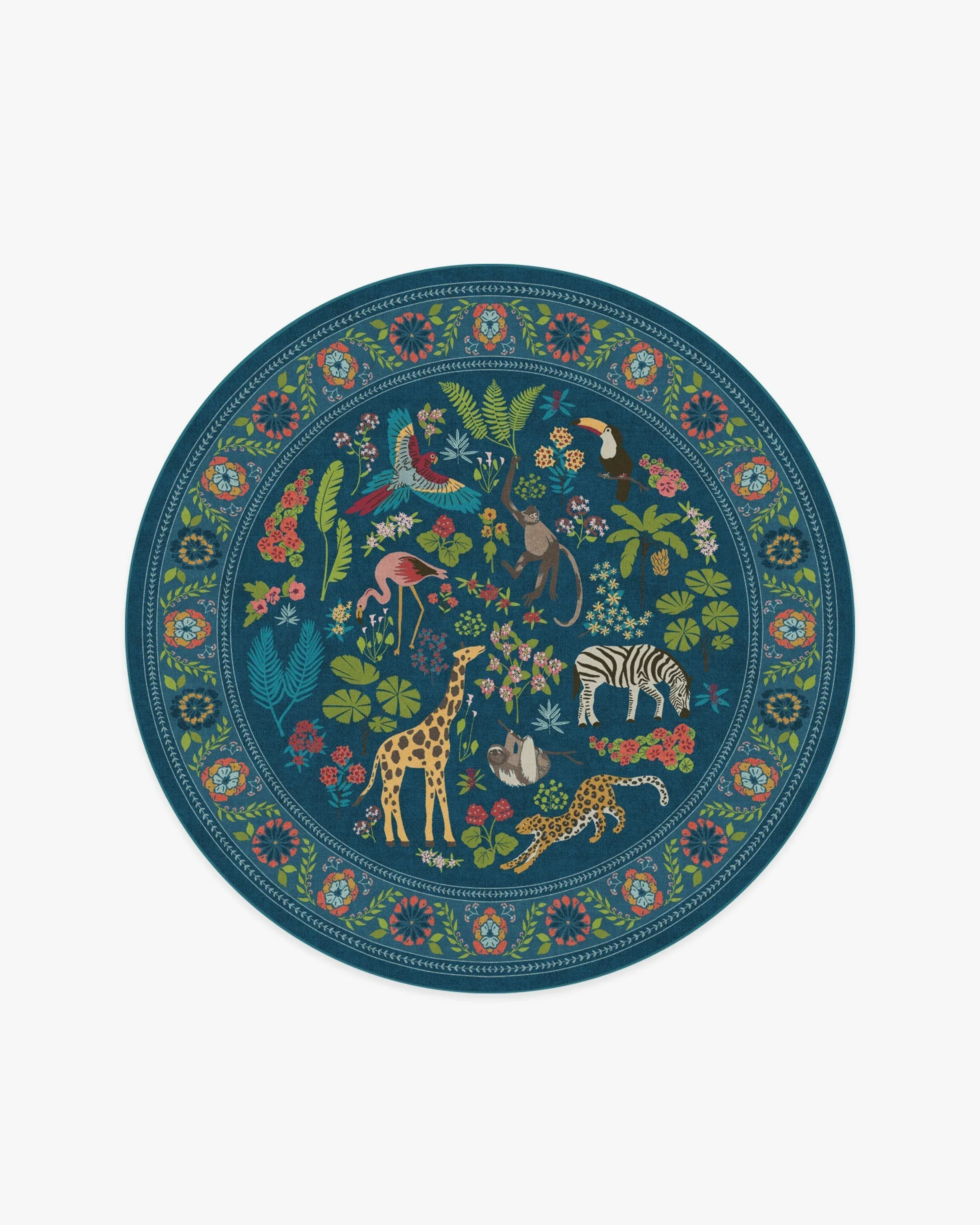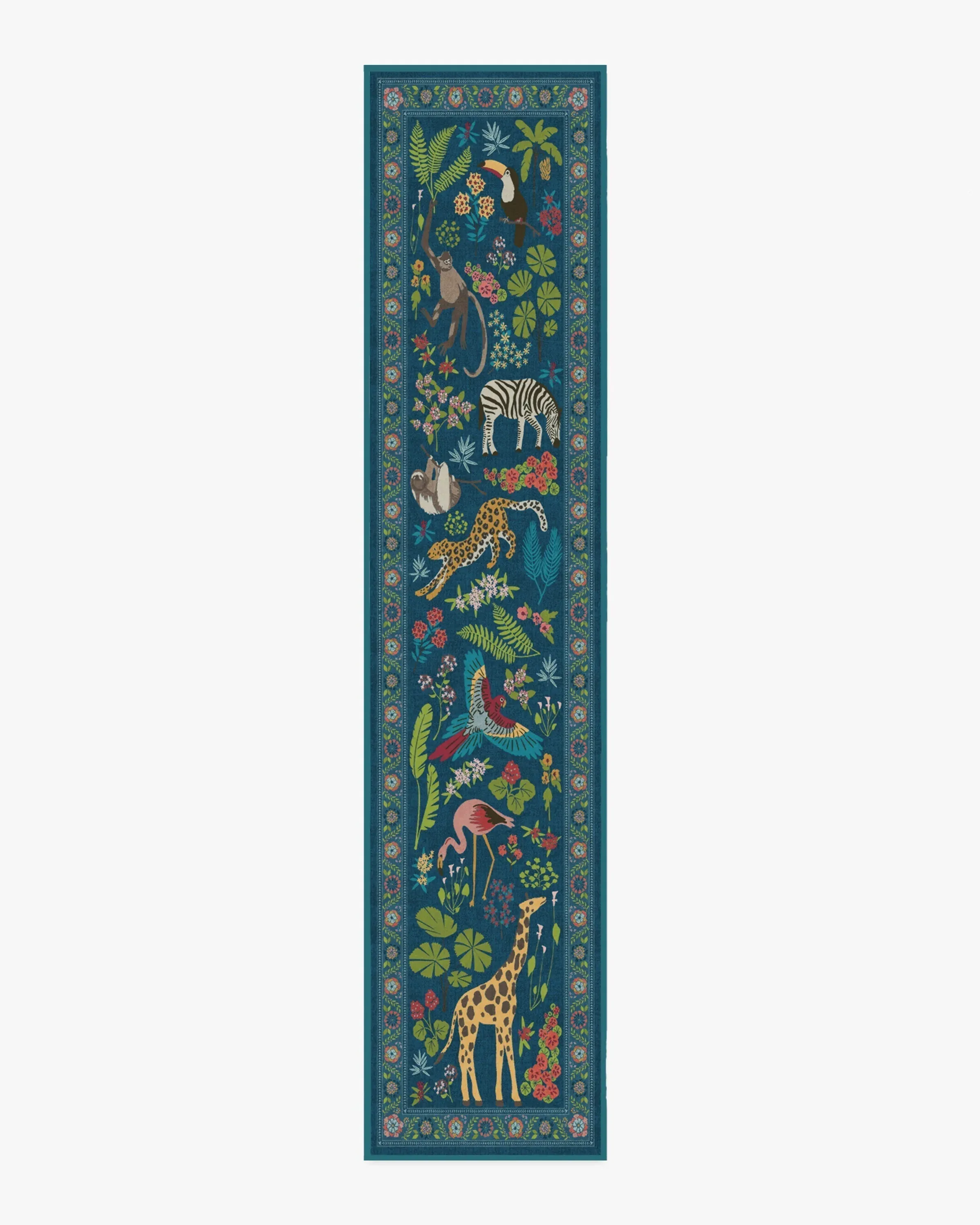 The area rug features a wildlife-filled design with exotic animals roaming among lush foliage. Its vivid colour palette combines yellow, bright blue, green, cool pink, and beige against a royal blue background. The water-resistant and stain-resistant construction provides durability, while the machine-washable feature ensures easy maintenance. W60 x D90 cm.
