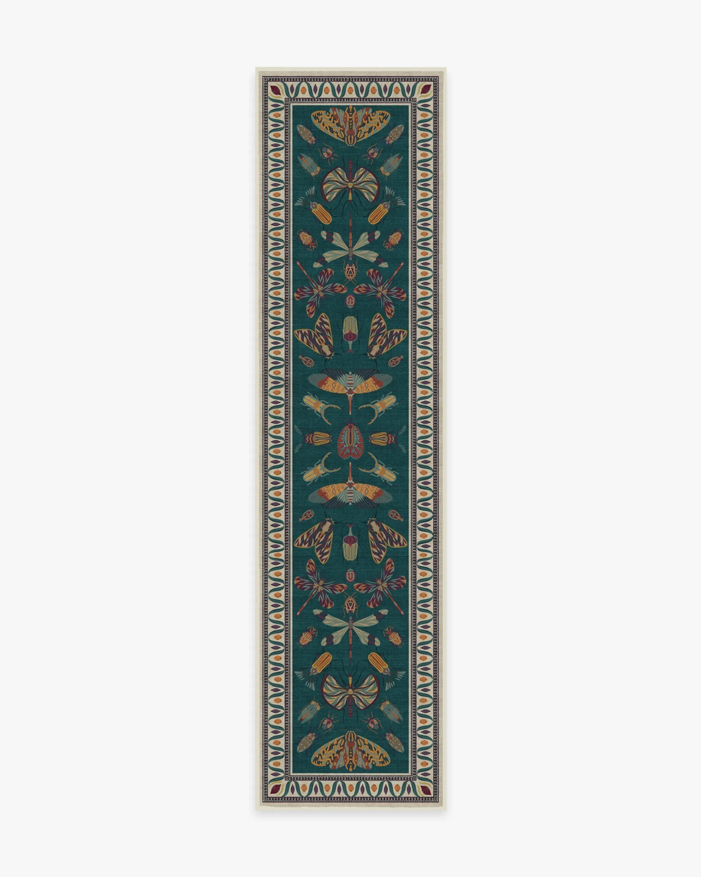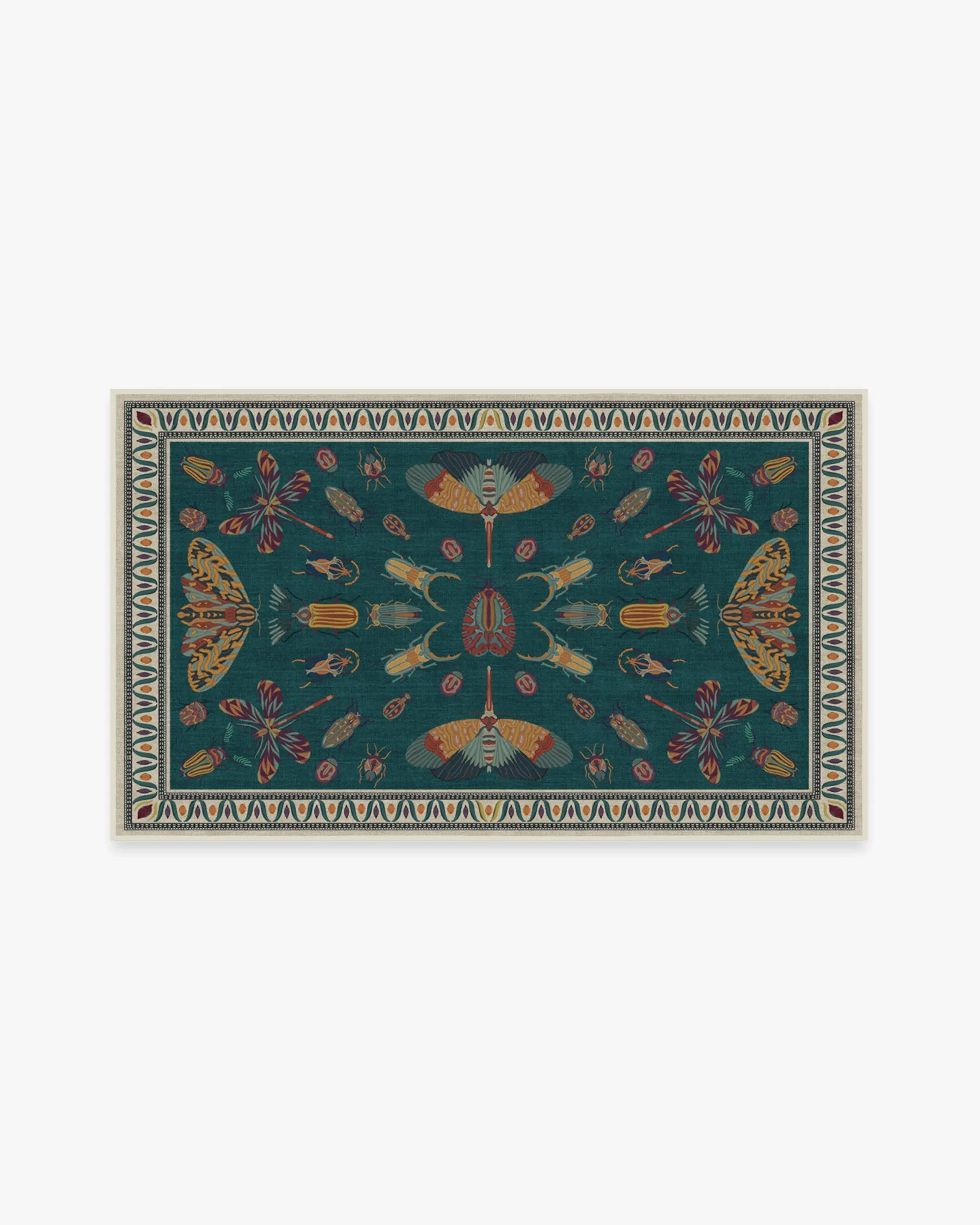 It's a bug's life. Our Iris Apfel Flutterby Rug showcases a diverse mix of extravagant insects. Rich with a jewel-tone colourway on a teal background, this intricate design is inspired by the fashion icon's unique and bold sense of style. Made from our water-resistant, stain-resistant, and machine-washable low-pile Chenille material. 60x90 | Machine Washable Area Rug | Kid & Pet Friendly | Indoor Rugs | Flutterby Rug by Iris Apfel Teal | Ruggable
