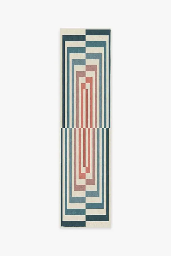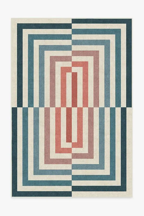A stunning piece that commands attention. This graphic rug features a mid-century modern-inspired linear pattern in eye-catching shades of teal, mauve, coral, and terracotta. Water-resistant, stain-resistant, and machine-washable. 60x90 | Machine Washable Area Rug | Kid & Pet Friendly | Indoor Rugs | Op Art Teal Rug by Jonathan Adler | Ruggable