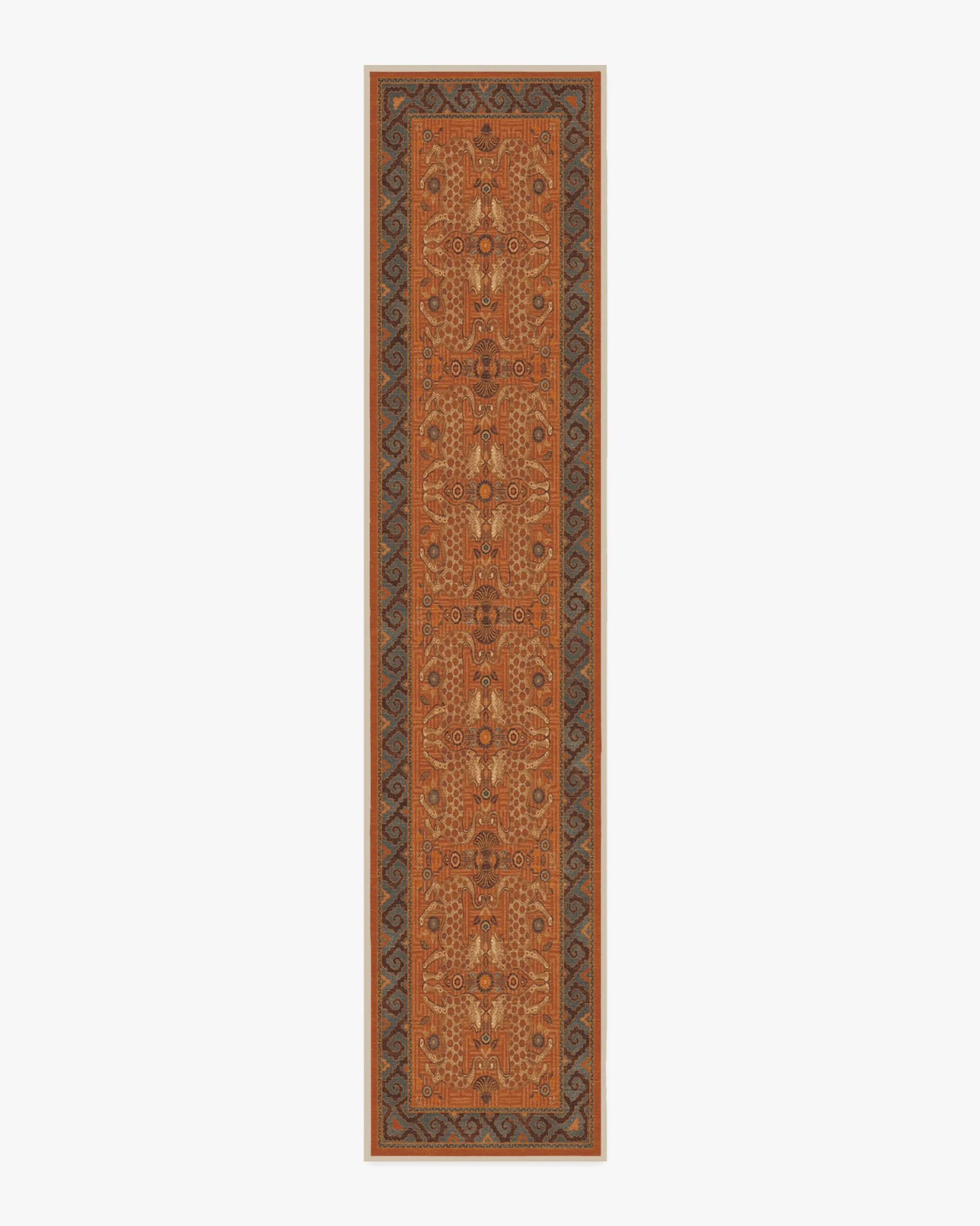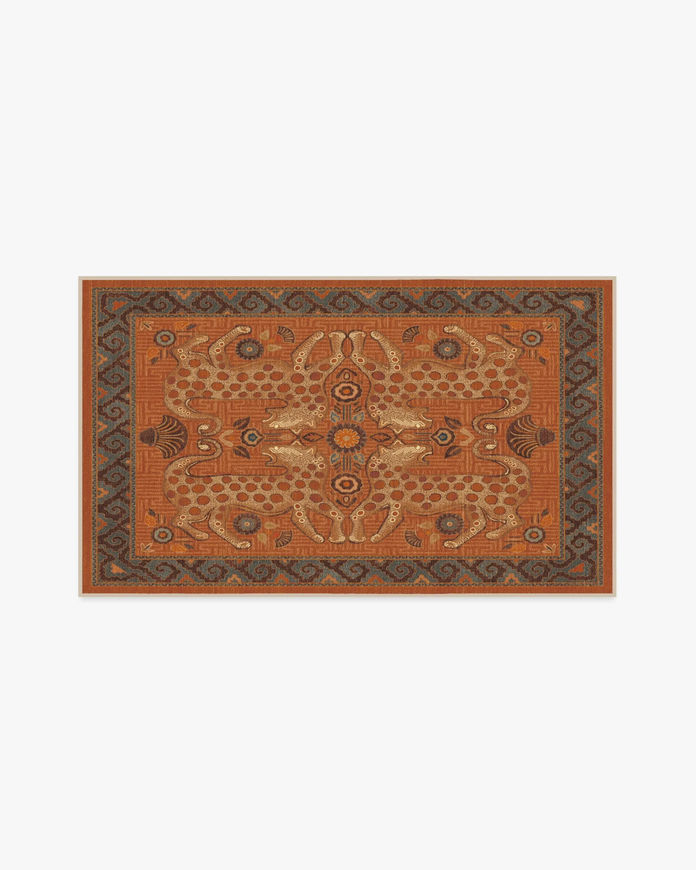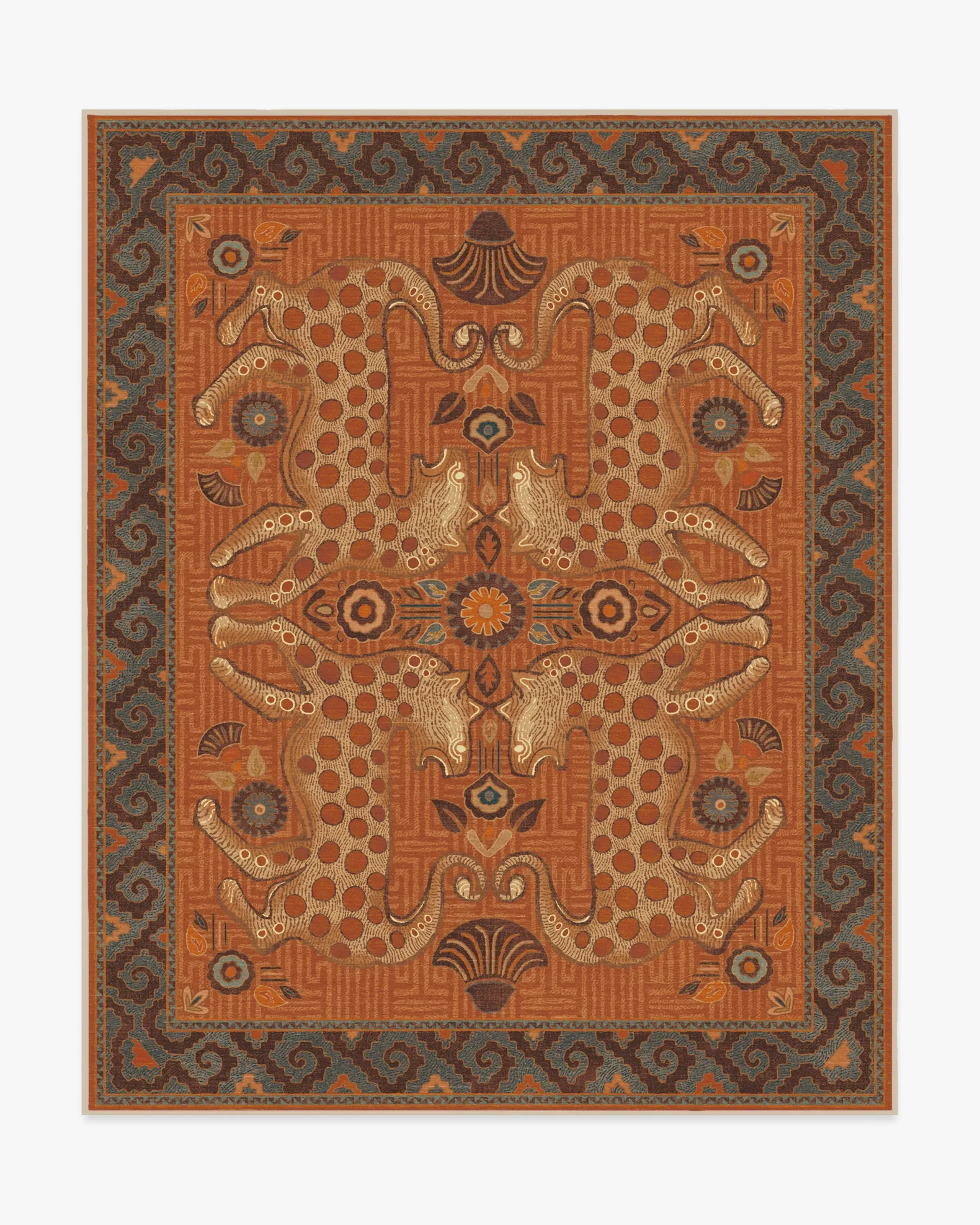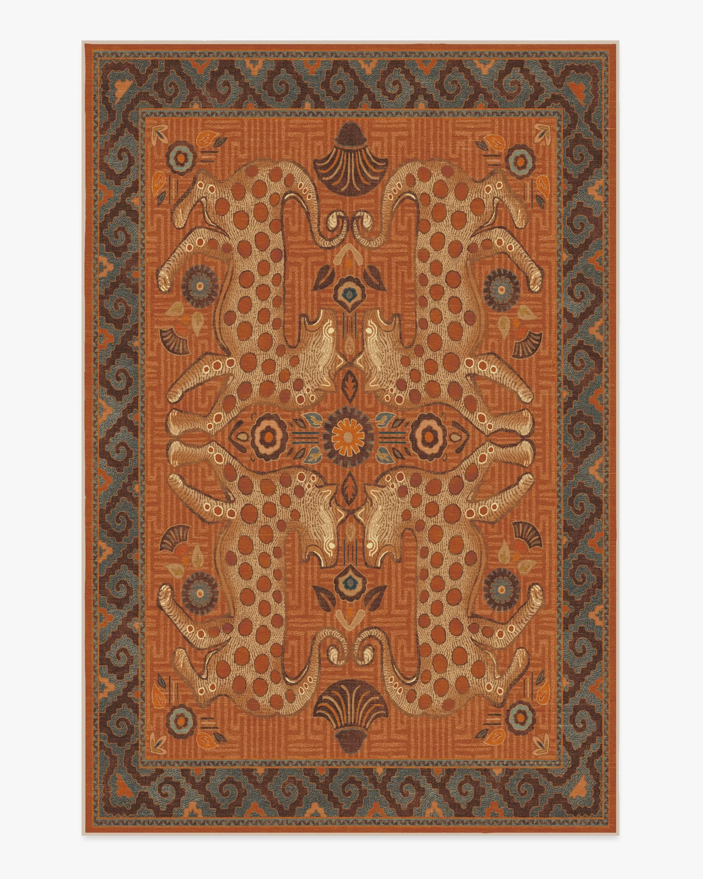 Sea meets sand with our Justina Blakeney Eartha Terracotta Rug. Inspired by the mystique of wild leopards and skillfully illustrated by Justina herself, this lively rug tells a story through its shell and floral motifs that symbolise protection and growth. The colour palette pairs warm tones like terracotta and chocolate brown with dusty blues and bright teal to evoke the power of earth and sky. Water-resistant, stain-resistant, and machine-washable. Rug colours may vary slightly according to your device and the lighting in your space. 60x90 | Machine Washable Area Rug | Kid & Pet Friendly | Indoor Rugs | Eartha Terracotta Flatwoven Rug by Justina Blakeney | Ruggable