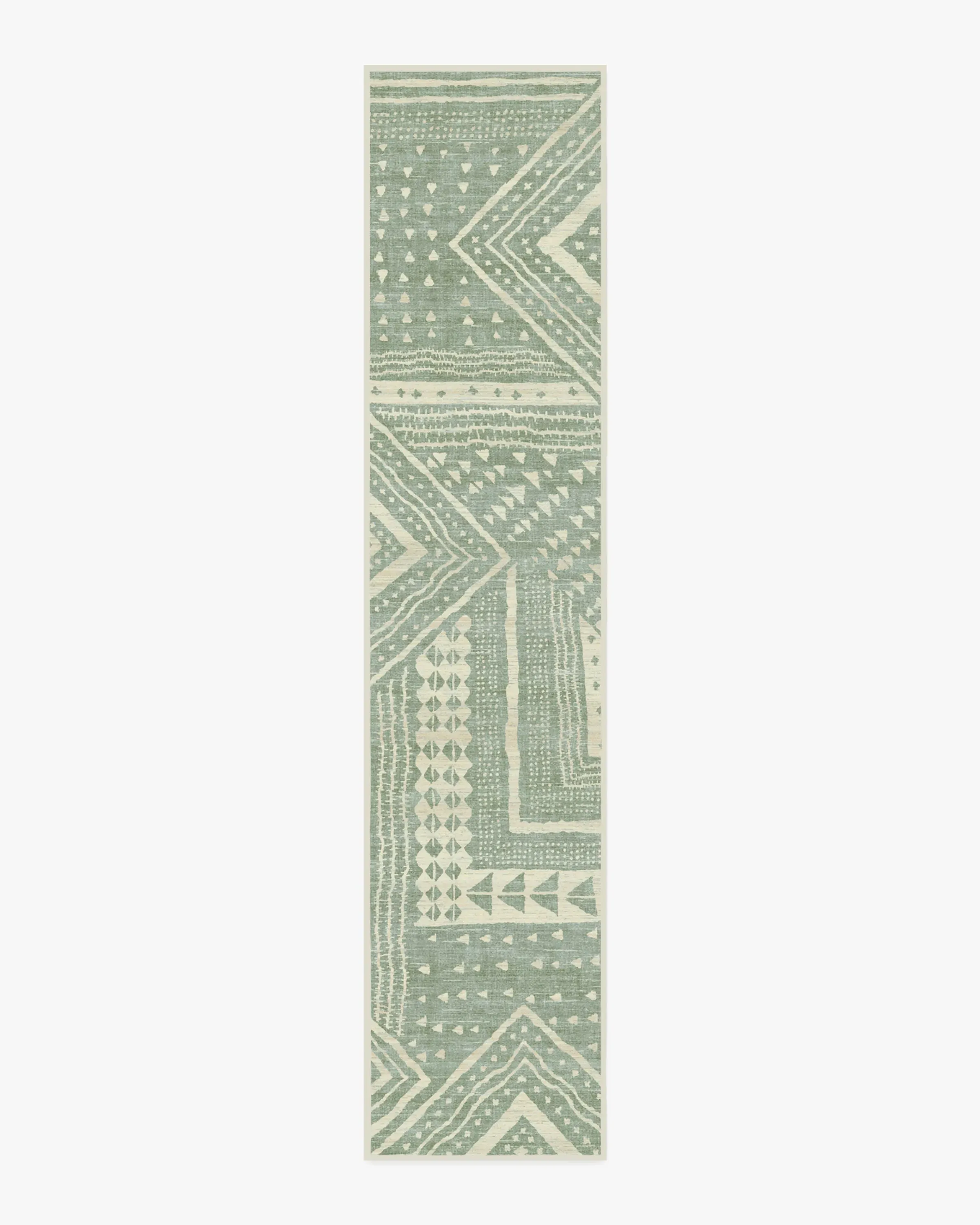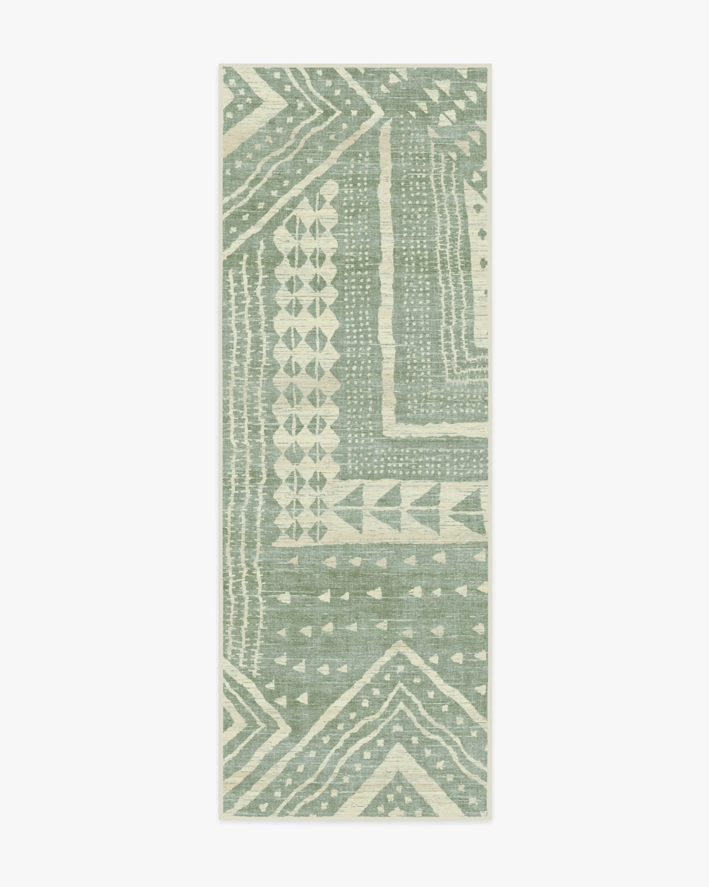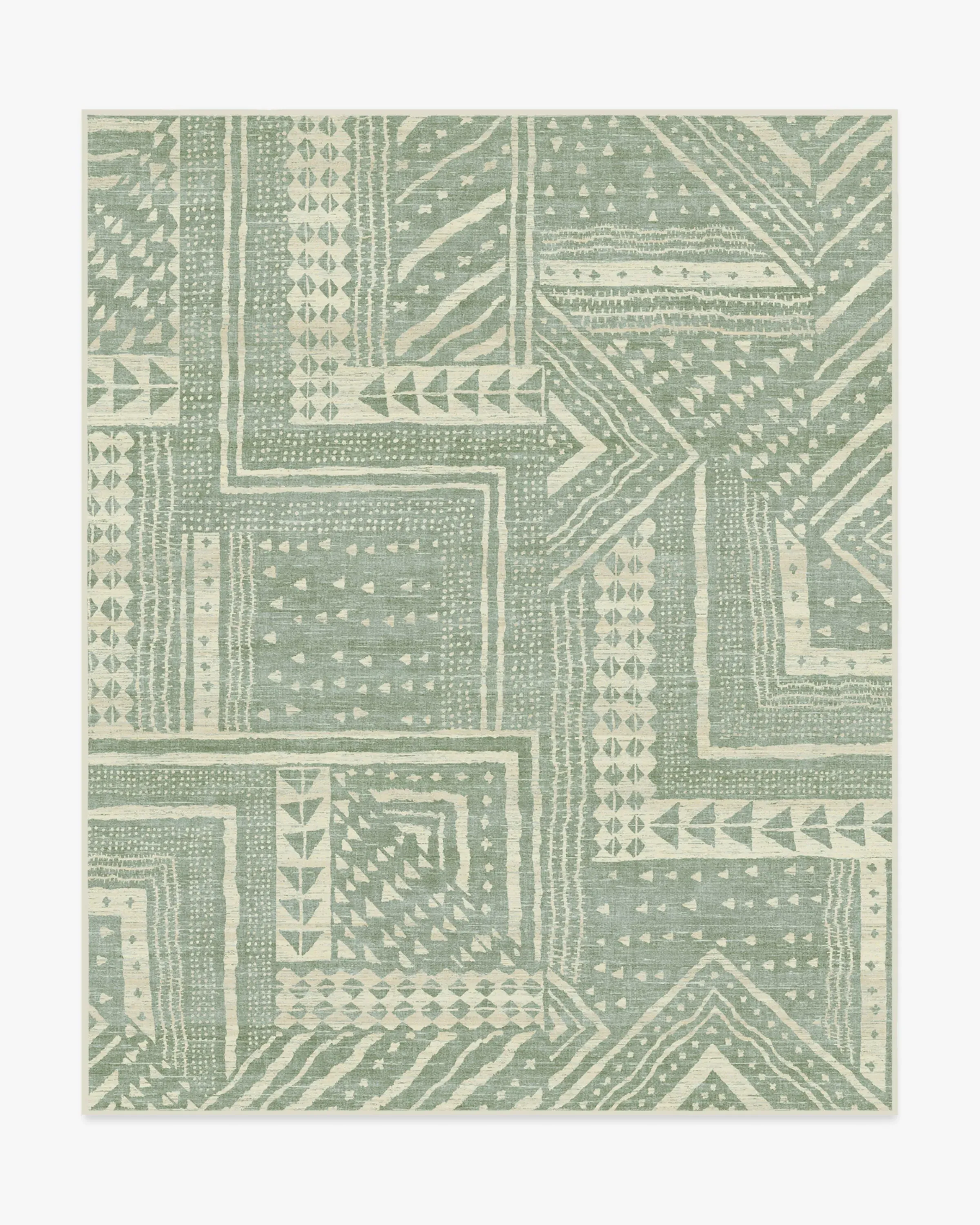 Bring home design that tells a story with our Malene Barnett Bogolan Sage Rug. Inspired by the handmade Bogolan fabrics from Mali, this design features modern geometric patterns and linework that pay homage to Bamana mudcloth techniques. Against a sage background, the light cream motifs add depth and dimension, creating an ombre effect that lends a hand-dyed look to the canvas. Water-resistant, stain-resistant, and machine-washable. Rug colours may vary slightly according to your device and the lighting in your space. 60x90 | Machine Washable Area Rug | Kid & Pet Friendly | Indoor Rugs | Bogolan Sage Rug by Malene Barnett | Ruggable