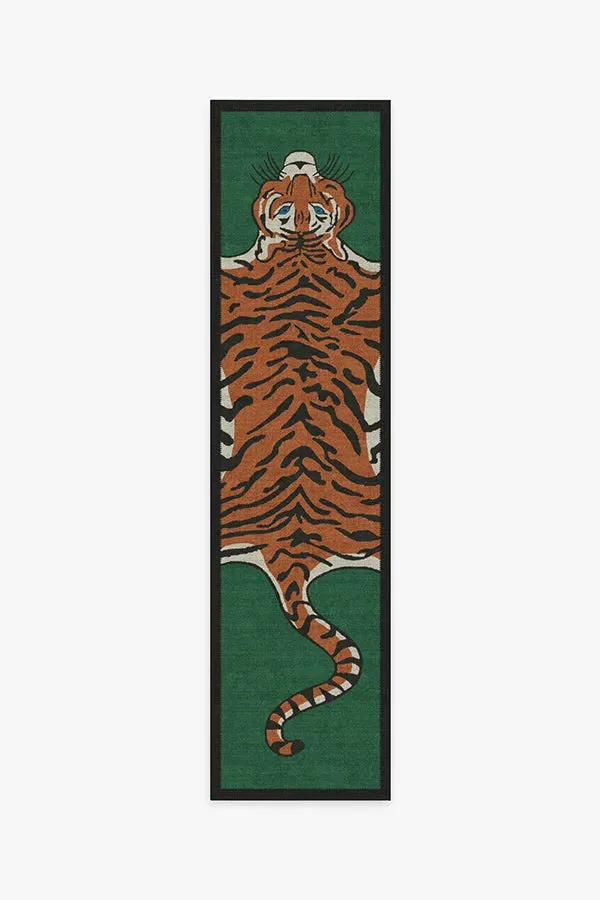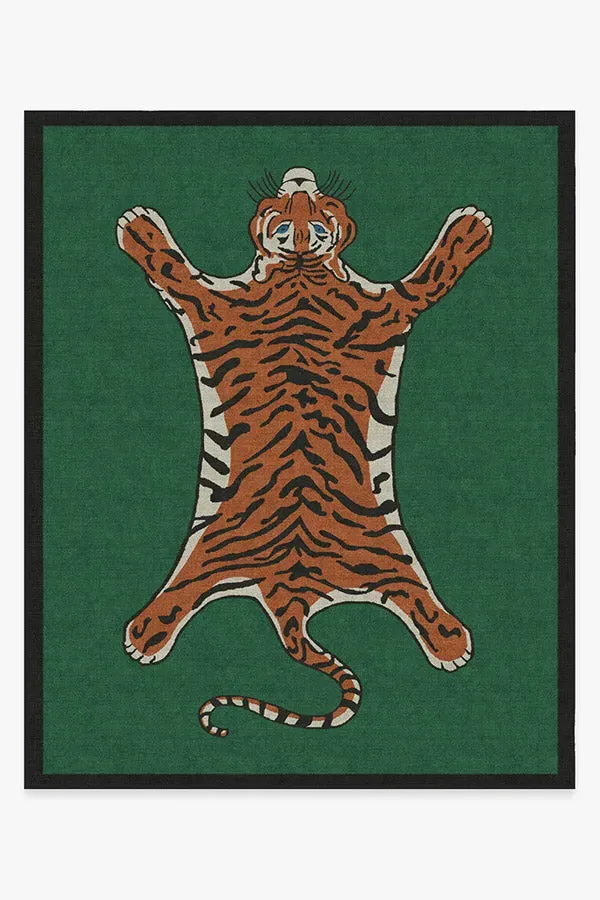 Wild cat chicness. Our Jonathan Adler Tiger Emerald Rug features an orange, cream, and black tiger sprawled across a rich emerald green background with a needlepoint texture across the design. Made from our water-resistant, stain-resistant, and machine-washable low-pile Chenille material. 60x90 | Machine Washable Area Rug | Kid & Pet Friendly | Indoor Rugs | Tiger Emerald Rug by Jonathan Adler Green | Ruggable