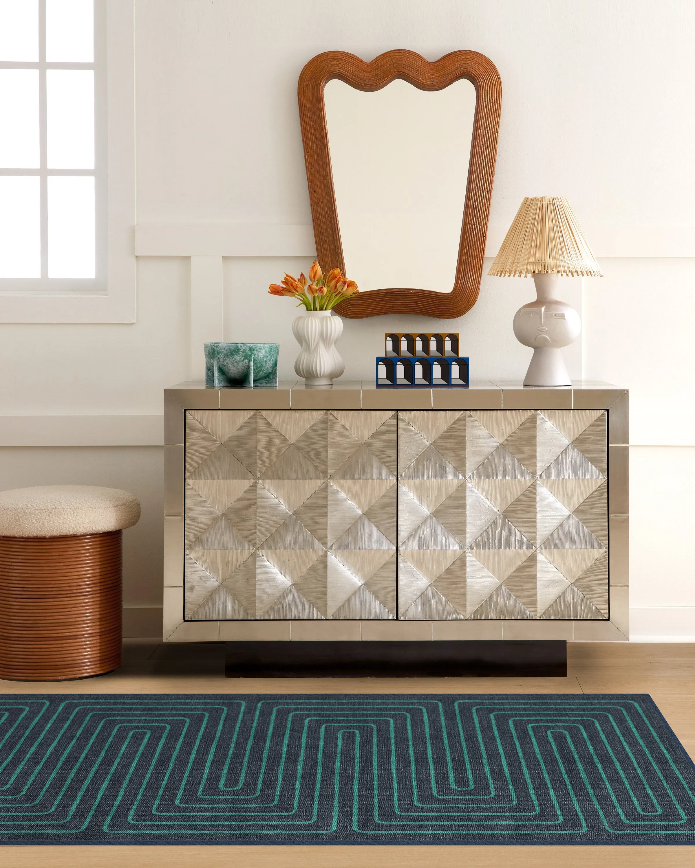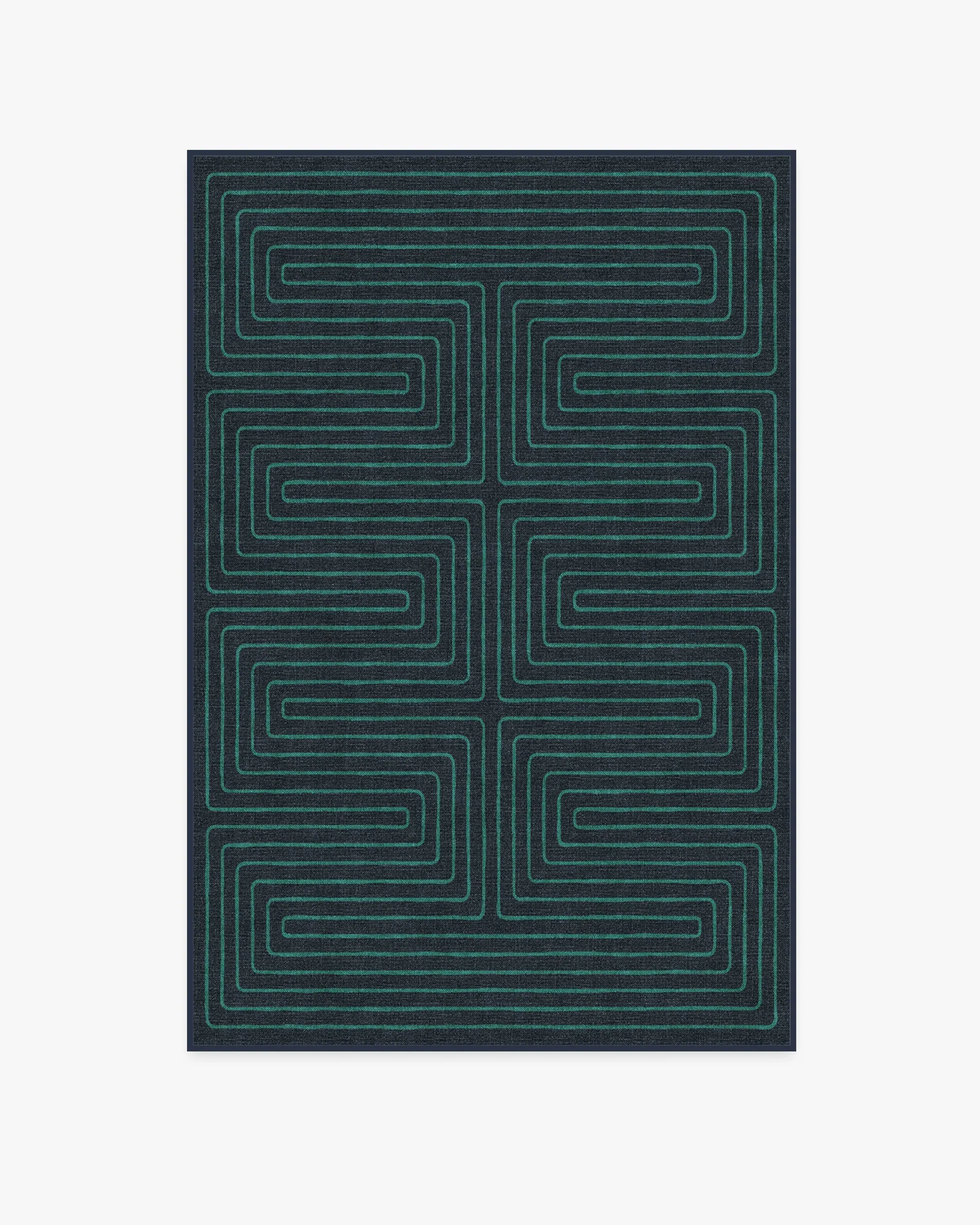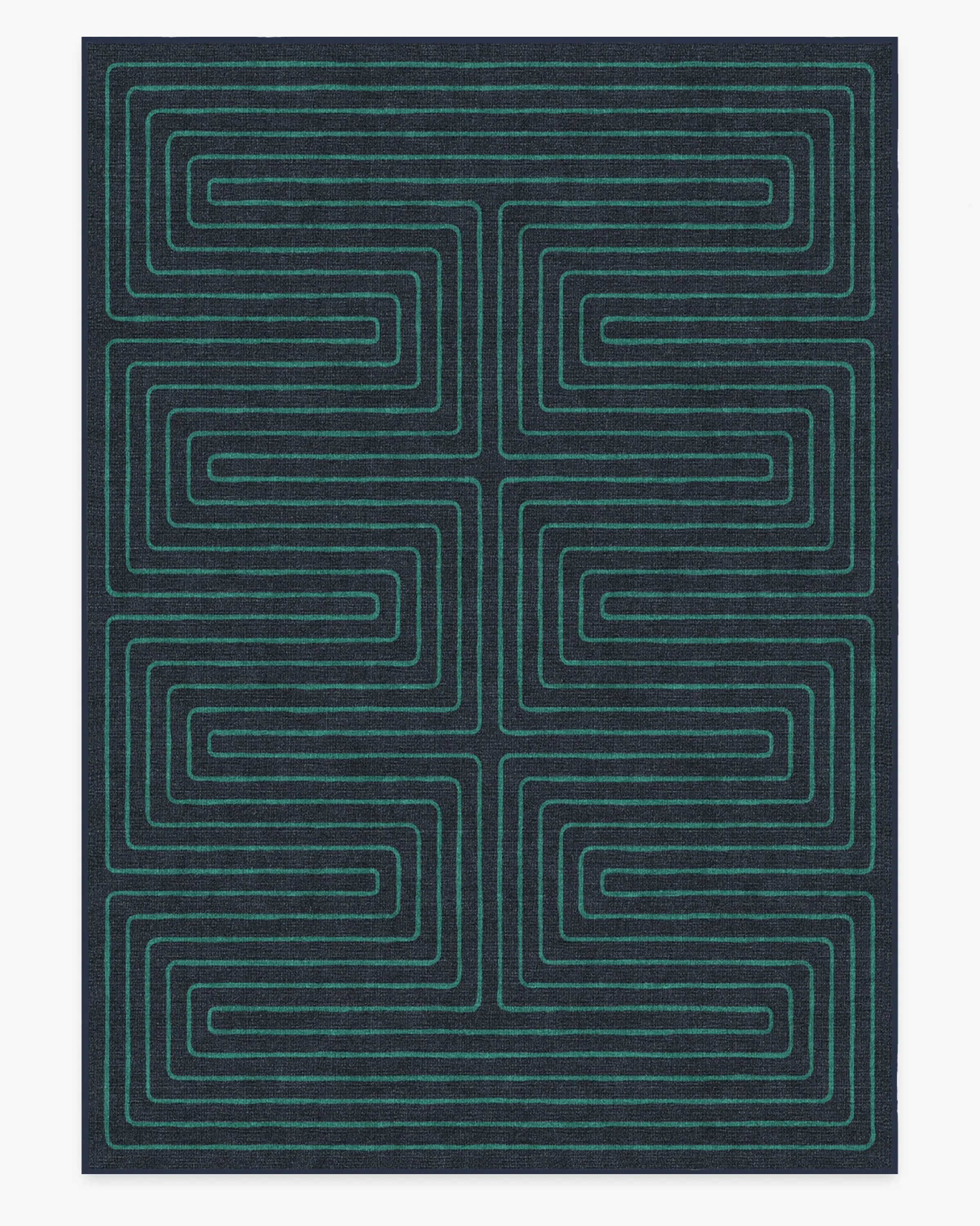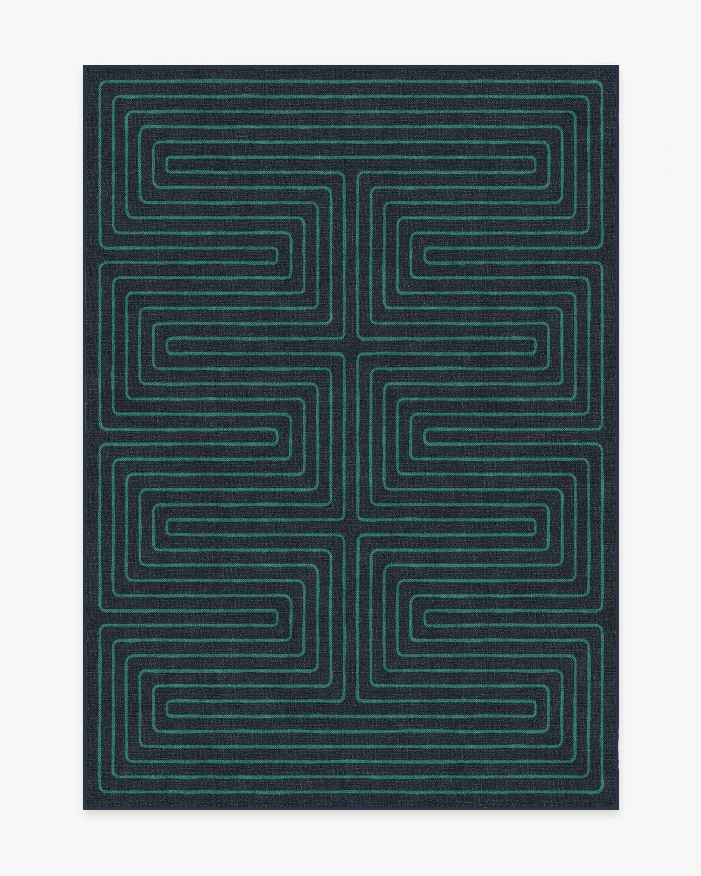 Irregular linework inspired by hand-cut paper softens a large scale maze pattern. Our Jonathan Adler Labyrinth Navy and Teal Rug features a continuous line with a hand-drawn feel in teal on a navy background. Made from our water-resistant, stain-resistant, and machine-washable low-pile Chenille material. 60x90 | Machine Washable Area Rug | Kid & Pet Friendly | Indoor Rugs | Labyrinth Navy & Teal Flatwoven Rug by Jonathan Adler | Ruggable
