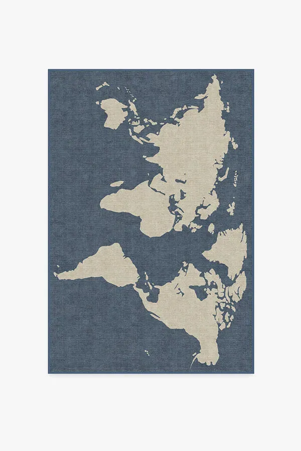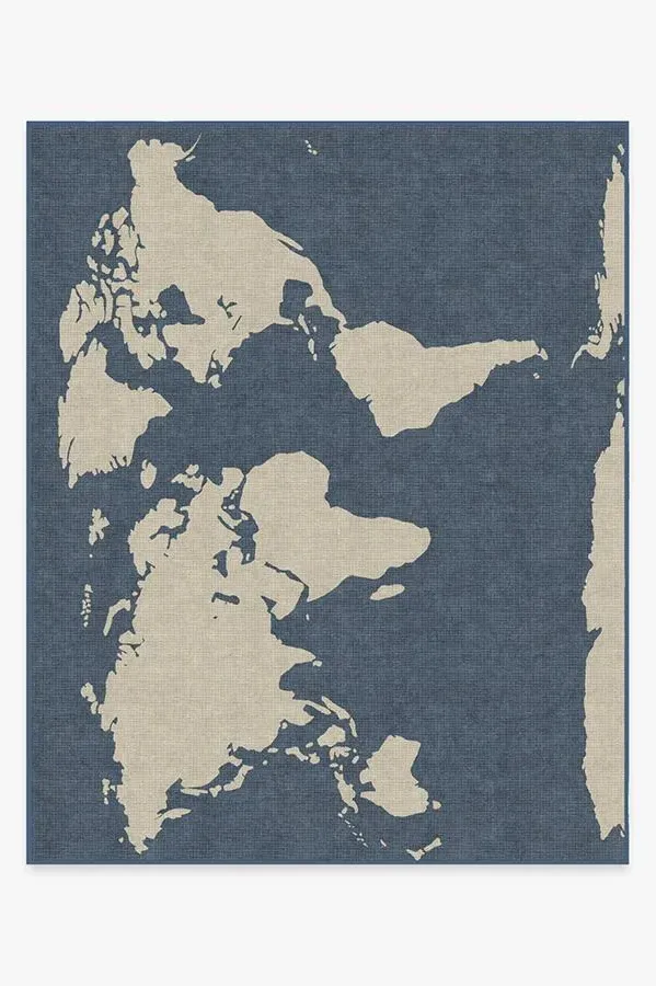 This contemporary World Map Blue rug displays a graphic mercator projection motif in tones of blue and cream. 60x90 | Machine Washable Area Rug | Kid & Pet Friendly | Indoor Rugs | World Map Blue Flatwoven Rug | Ruggable