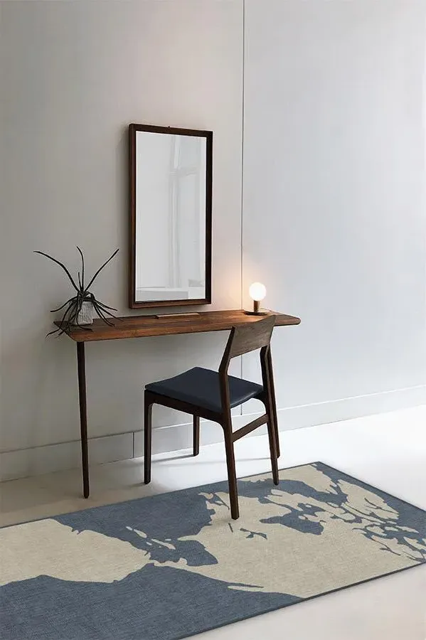 The World Map Blue rug features a contemporary graphic mercator projection motif in tones of blue and cream. Its flatwoven construction provides durability, while the machine washable design offers easy maintenance. The pet-friendly material resists stains and wear, and the rectangular shape suits various spaces with its W60 x D90 cm dimensions.