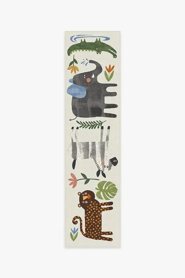 Little explorers will love this crew of critters on our Jungle Safari Multicolour Rug. Tinted in watercolor hues of blue, green, and yellow, this rug features cheerful animals - lion, zebra, giraffe, elephant, and crocodile - roaming among rubber trees, leaves, and flowers, adding a wildly whimsical touch to any child's space. 60x90 | Machine Washable Area Rug | Kid & Pet Friendly | Indoor Rugs | Jungle Safari Rug | Ruggable