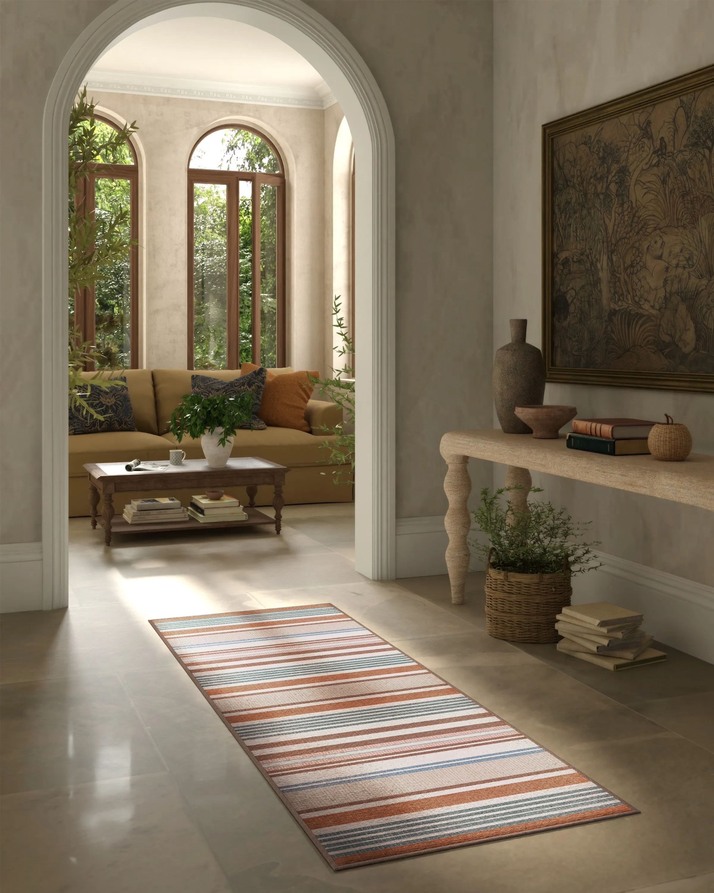 The area rug features horizontal multi-colour stripes in antique red mixed with teal, warm browns, and neutrals, accented by subtle pops of pink and sage. Its flatwoven construction provides durability and comfort, while the machine-washable design offers easy maintenance. The water-resistant and stain-resistant properties suit high-traffic areas, and the soft woven texture adds visual rhythm and balance.