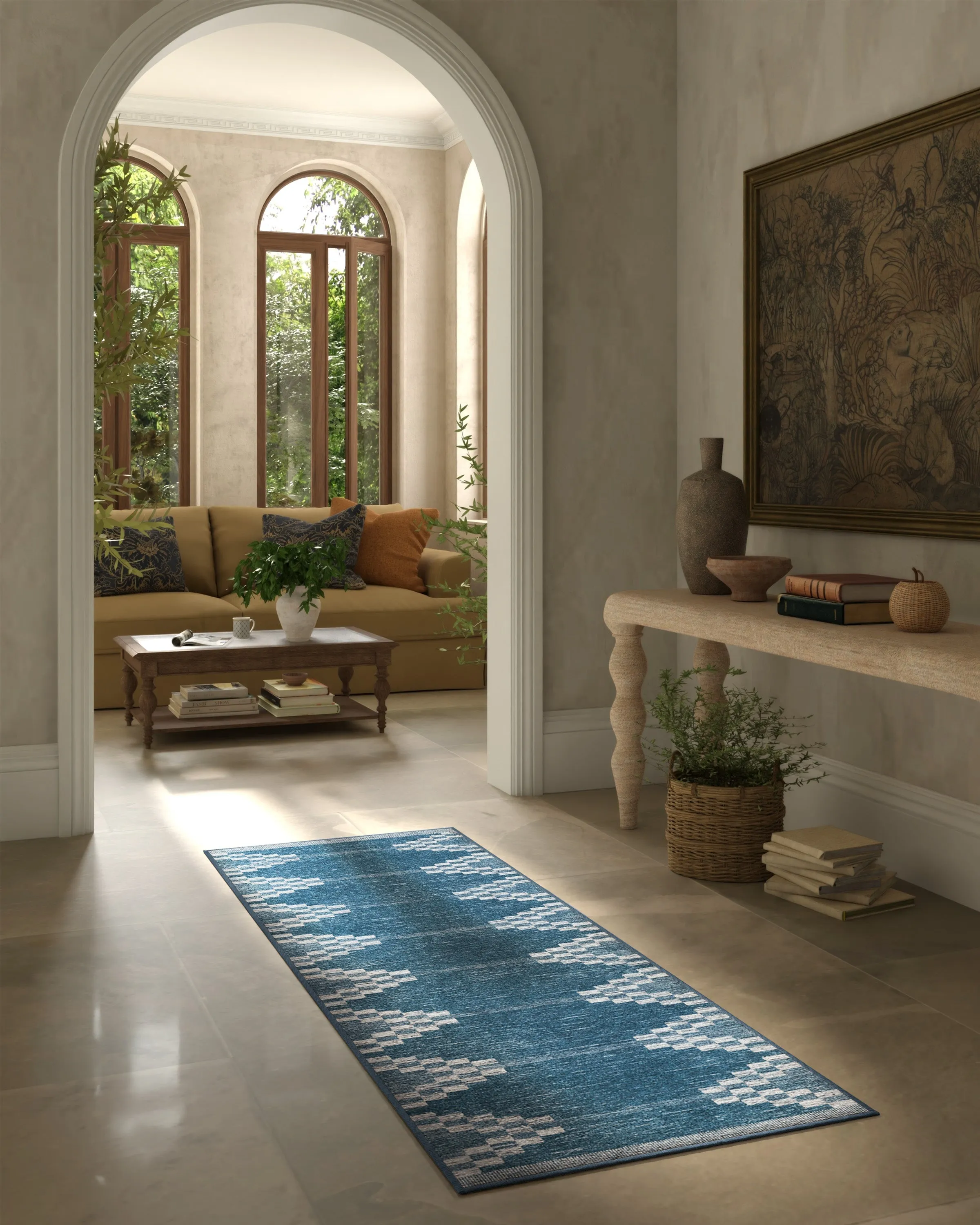 The area rug combines intricate geometric design with practical functionality through its machine-washable construction. Its flatwoven structure features tonal blues complemented by soft cream accents, while the water-resistant and stain-resistant properties ensure lasting durability. The rustic hand loom-inspired pattern adds visual interest to any space, and the kid and pet-friendly design provides peace of mind for busy households.