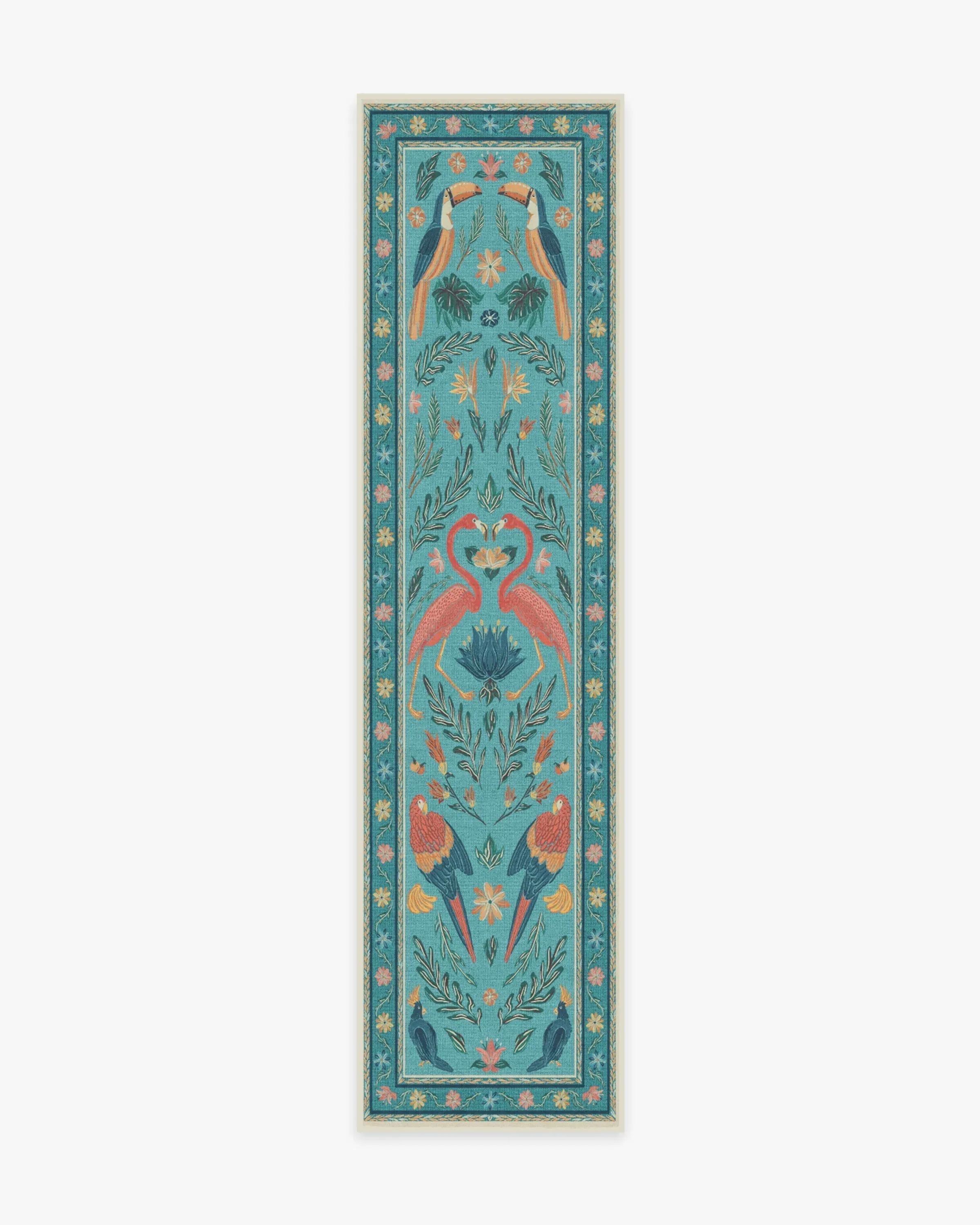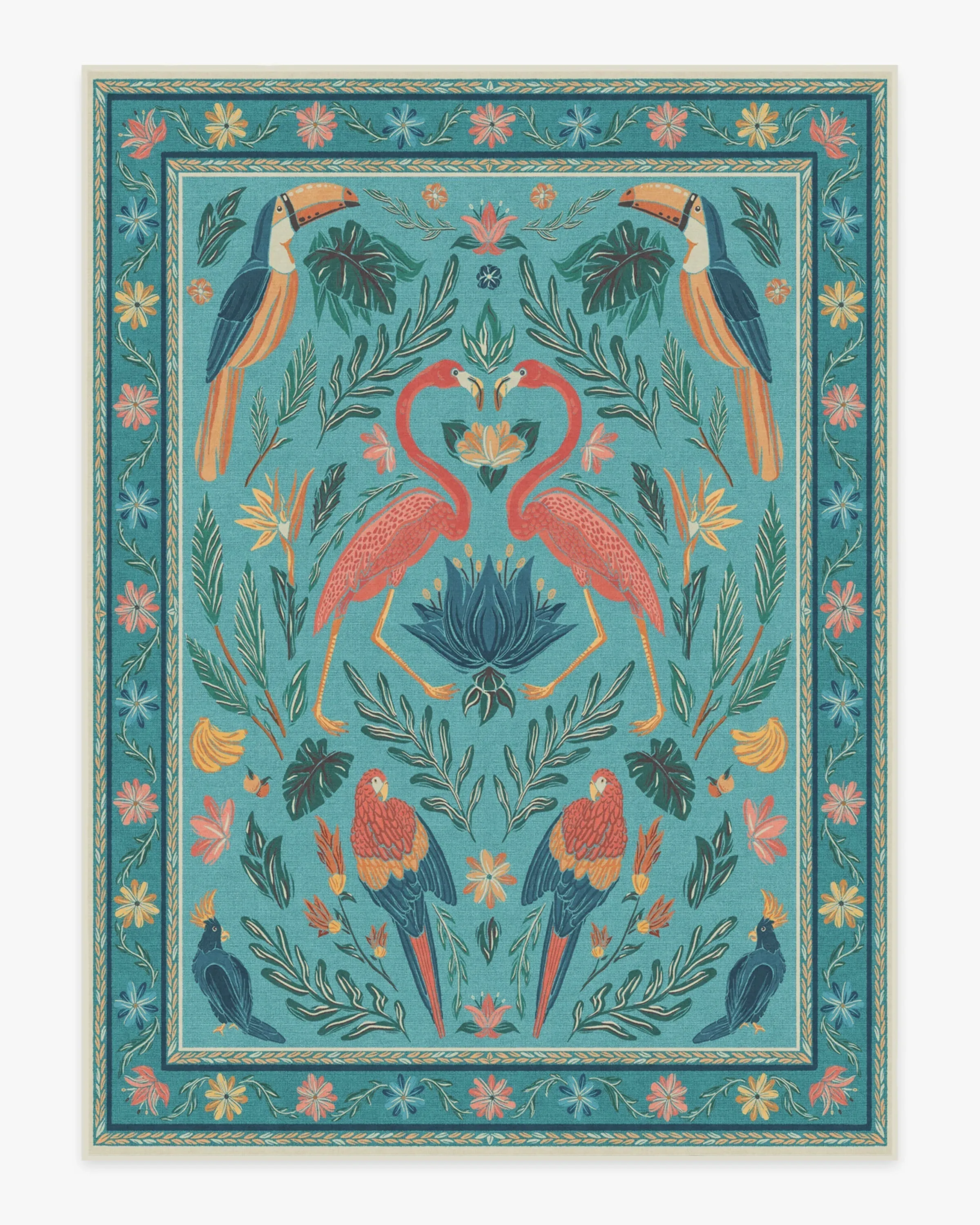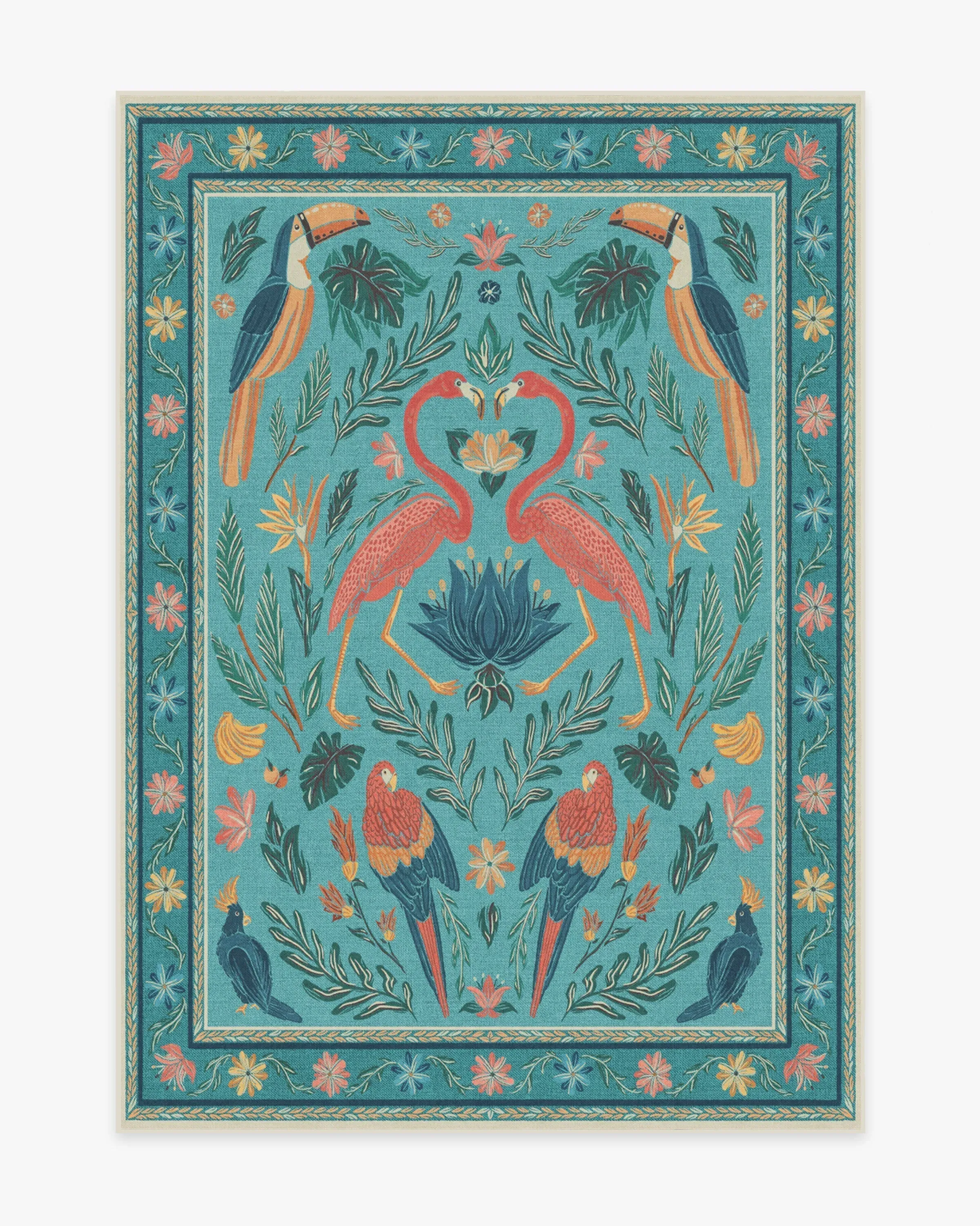 Im-peck-able. Our Birds of a Feather Aqua Rug is a bold and bright celebration of tropical birds including toucans, parrots, and flamingos. This mirrored design boasts a jewel-toned colour palette of aqua blue, pink, yellow, and teal green. Set against an aqua background reminiscent of Palm Beach, the bold contrast evokes lively, playful energy similar to that of the exotic birds depicted. Made from our water-resistant, stain-resistant, and machine-washable low-pile Classic material. Our Classic Rugs are woven from a velvety smooth chenille yarn. Rug colours may vary slightly according to your device and the lighting in your space. 60x90 | Machine Washable Area Rug | Kid & Pet Friendly | Indoor Rugs | Birds Of A Feather Aqua Rug by Iris Apfel | Ruggable