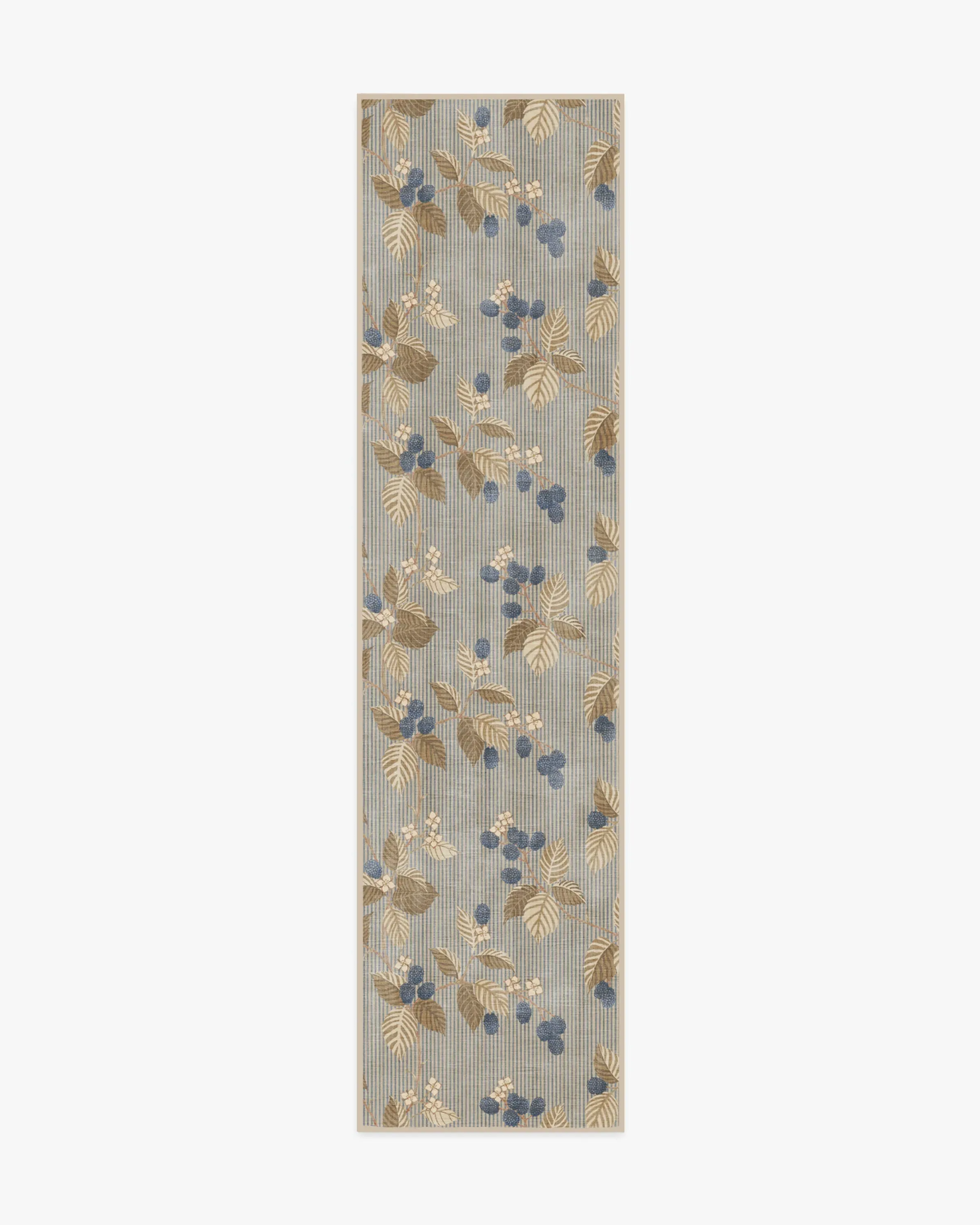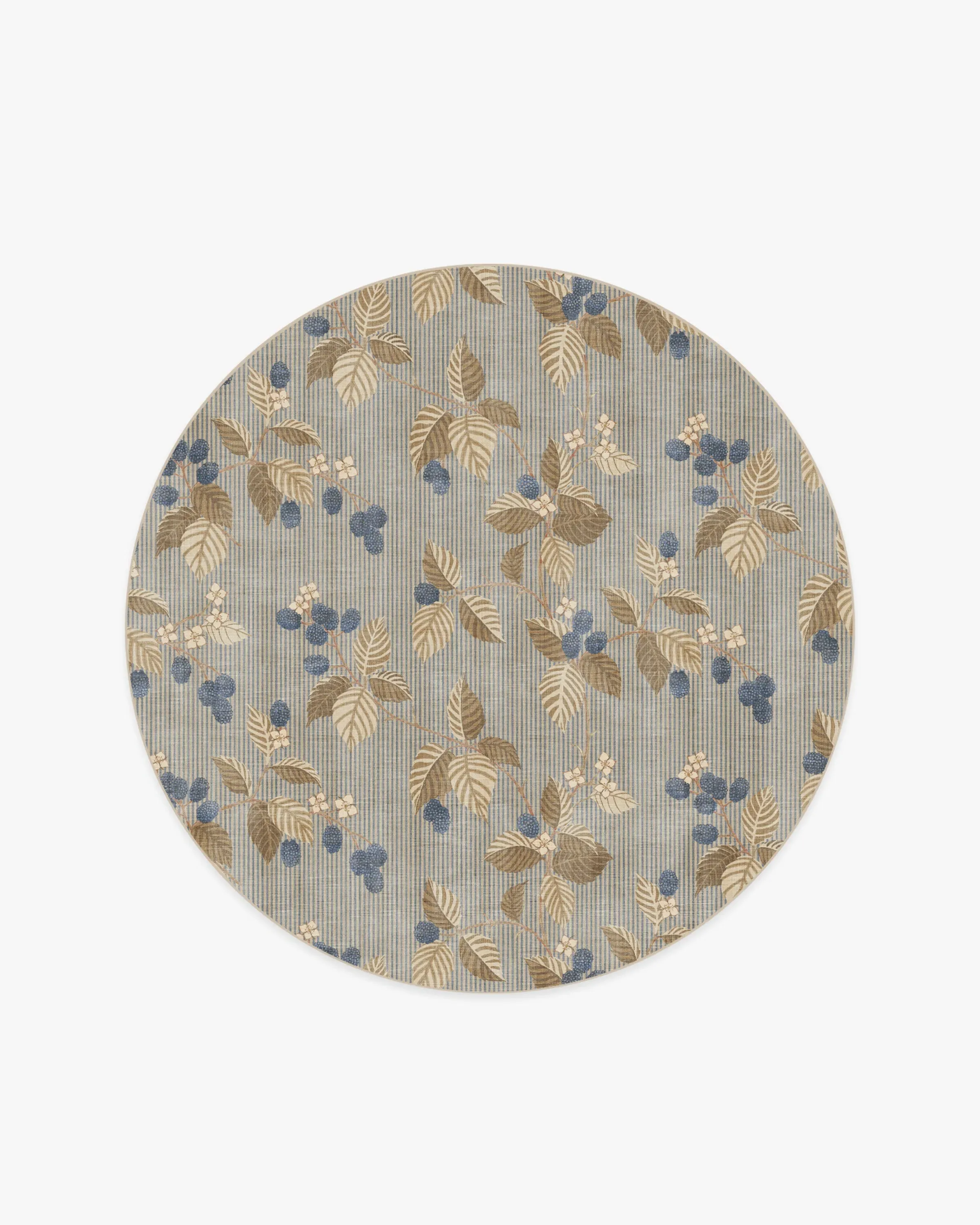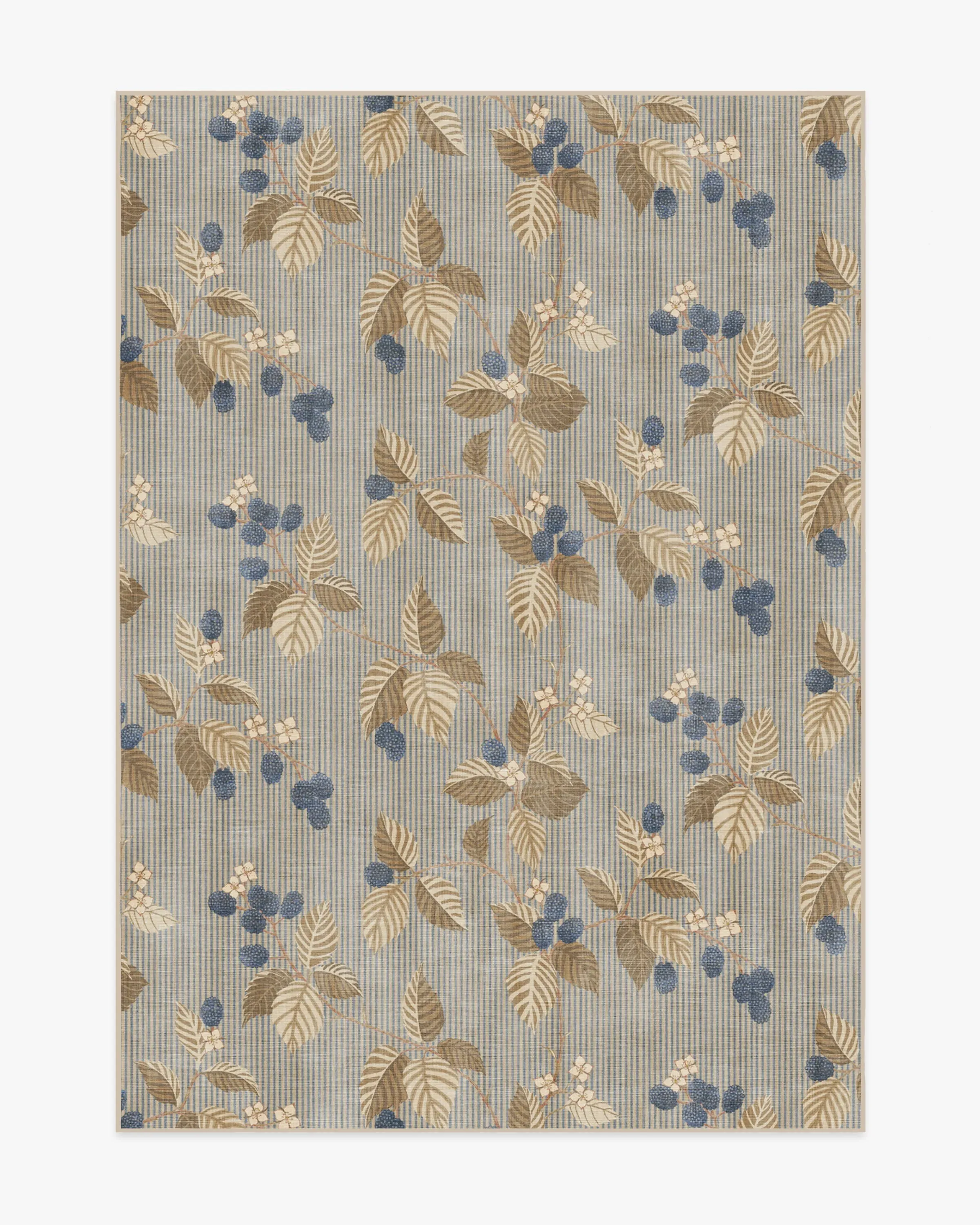 Bring home woodland wonder with our Sanderson Rubus Azure & Fawn Rug. Showcasing the blackberry Rubus, a genus of flowering plants in the rose family, raspberries and blackberries sit against a simple striped background. A palette of navy and blue shadesâcomplemented by browns, creams, and pinksâcontrasts beautifully with the neutral beige background. Water-resistant, stain-resistant, and machine-washable. Rug colours may vary slightly according to your device and the lighting in your space. 60x90 | Machine Washable Area Rug | Kid & Pet Friendly | Indoor Rugs | Rubus Azure & Fawn Rug by Sanderson | Ruggable