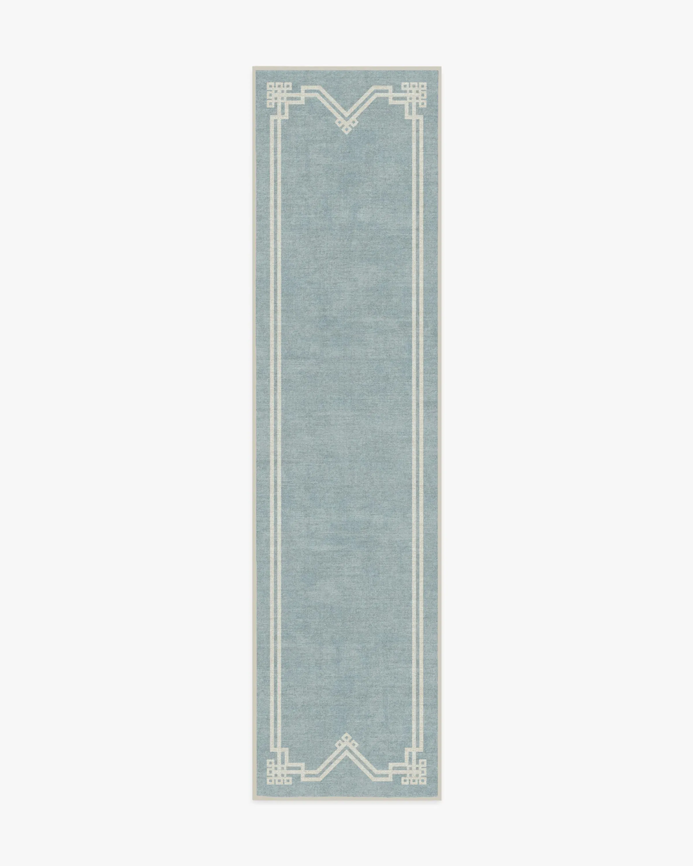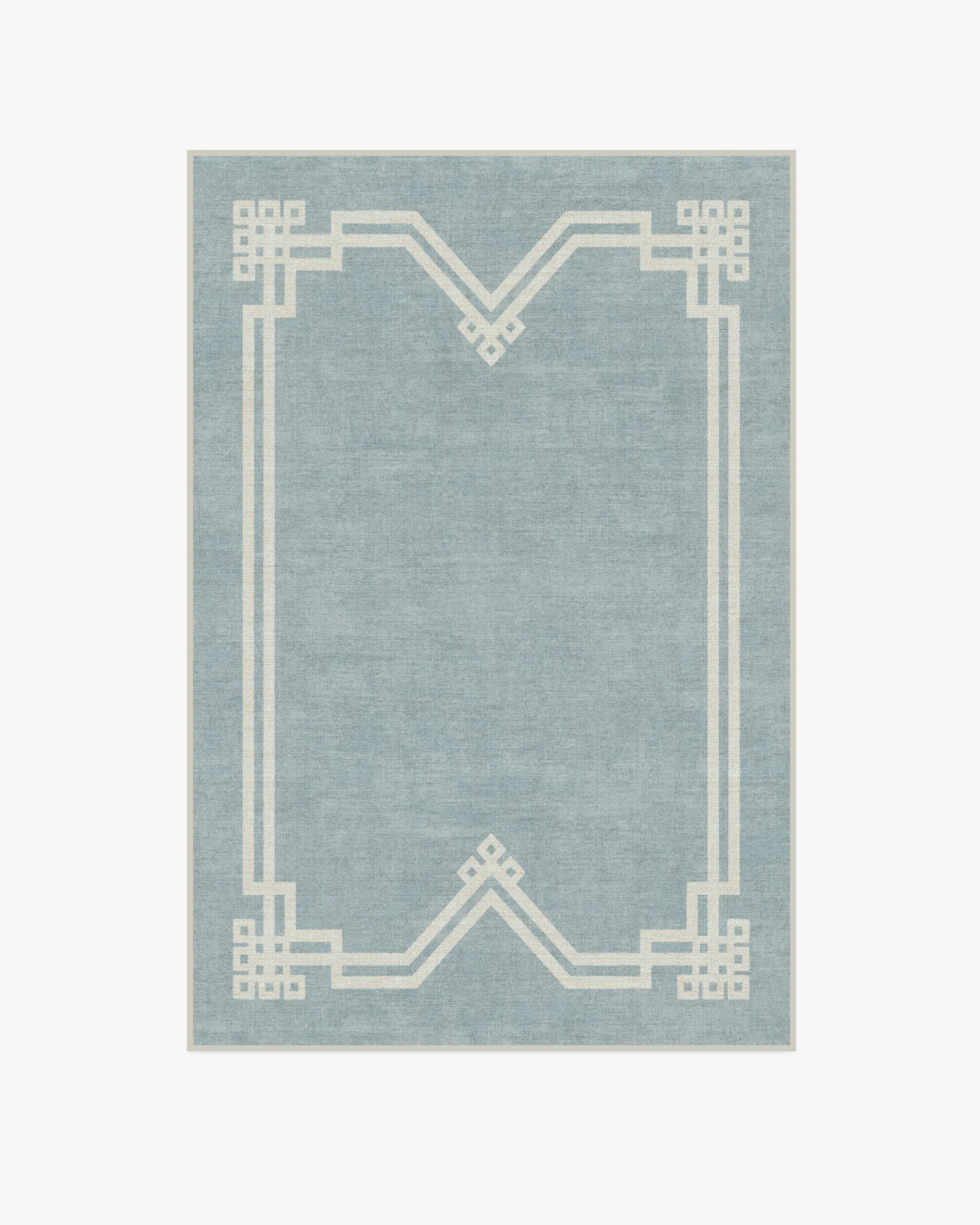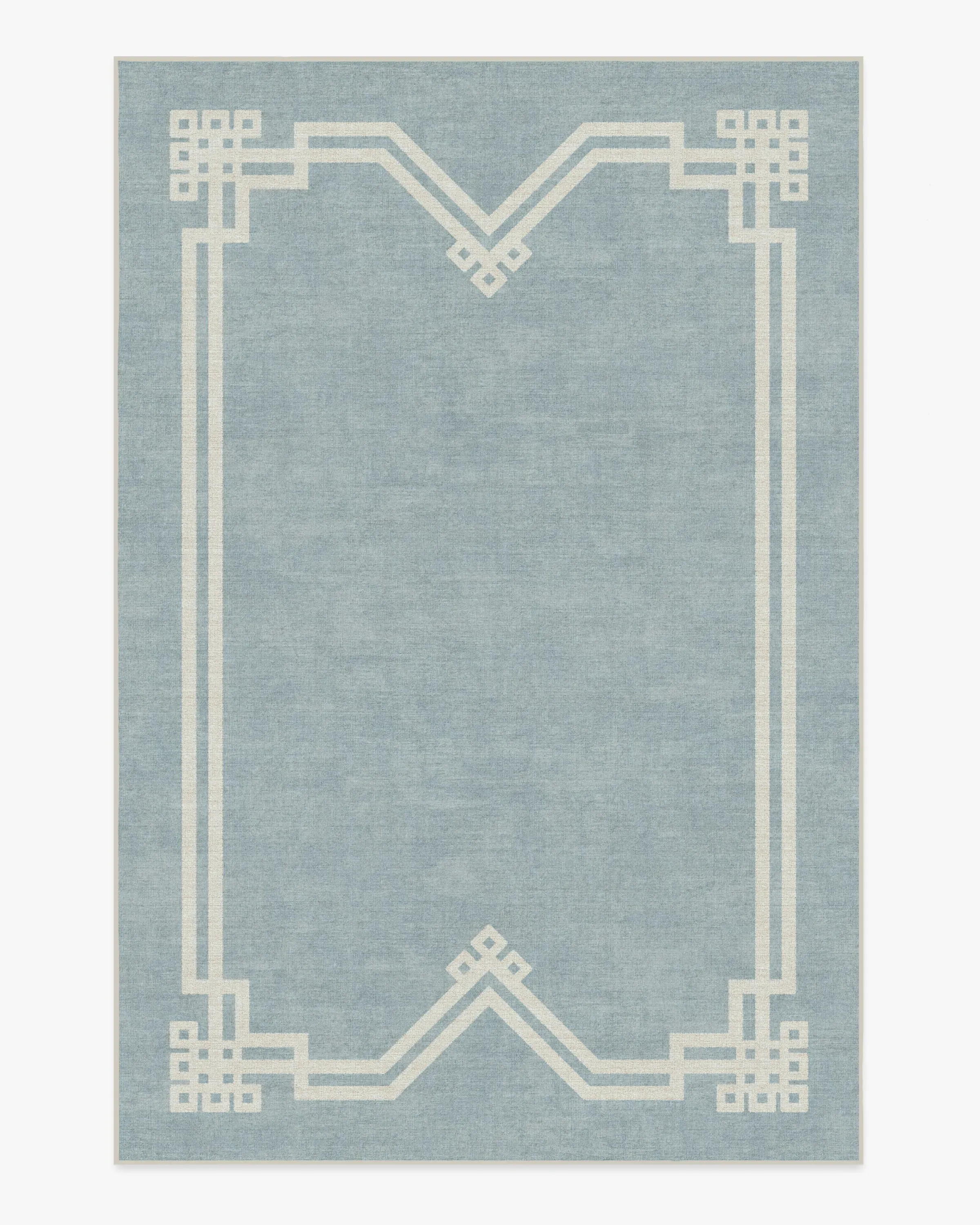 Elevate the everyday with The Hiltons Chrysler Border Chambray Blue Rug. Inspired by the iconic architecture of the Art Deco era, this glamorous design features bold, geometric column-like structures. The Eastern-inspired, light cream corner motifs add grandeur and classic charm against the lovely, powder blue background. Water-resistant, stain-resistant, and machine-washable. Rug colours may vary slightly according to your device and the lighting in your space. 60x90 | Machine Washable Area Rug | Kid & Pet Friendly | Indoor Rugs | Chrysler Border Chambray Blue Rug by The Hiltons | Ruggable